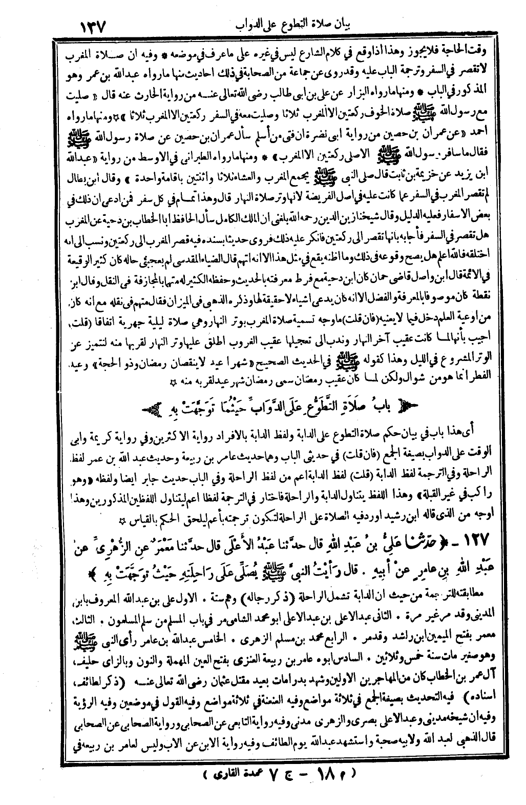 وَقد رُوِيَ عَن جمَاعَة من الصَّحَابَة فِي ذَلِك أَحَادِيث: مِنْهَا: مَا رَوَاهُ عبد الله بن عمر وَهُوَ الْمَذْكُور فِي الْبَاب. وَمِنْهَا: مَا رَوَاهُ الْبَزَّار عَن عَليّ بن أبي طَالب، رَضِي الله تَعَالَى عَنهُ، من رِوَايَة الْحَارِث عَنهُ، قَالَ: (صليت مَعَ رَسُول الله صلى الله عَلَيْهِ وَسلم صَلَاة الْخَوْف رَكْعَتَيْنِ إلاّ الْمغرب ثَلَاثًا، وَصليت مَعَه فِي السّفر رَكْعَتَيْنِ إلاّ الْمغرب ثَلَاثًا) . وَمِنْهَا: مَا رَوَاهُ أَحْمد (عَن عمرَان بن حُصَيْن من رِوَايَة أبي نَضرة أَن فَتى من أسلم سَأَلَ عمرَان بن حُصَيْن عَن صَلَاة رَسُول الله صلى الله عَلَيْهِ وَسلم، فَقَالَ: مَا سَافر رَسُول الله صلى الله عَلَيْهِ وَسلم إلاّ صلى رَكْعَتَيْنِ إلاّ الْمغرب) . وَمِنْهَا: مَا رَوَاهُ الطَّبَرَانِيّ فِي (الْأَوْسَط) من رِوَايَة (عبد الله ابْن يزِيد عَن خُزَيْمَة بن ثَابت، قَالَ: صلى النَّبِي صلى الله عَلَيْهِ وَسلم يجمع الْمغرب وَالْعشَاء ثَلَاثًا واثنتين بِإِقَامَة وَاحِدَة) . وَقَالَ ابْن بطال: لم تقصر الْمغرب فِي السّفر عَمَّا كَانَت عَلَيْهِ فِي أصل الْفَرِيضَة، لِأَنَّهَا وتر صَلَاة النَّهَار، قَالَ: وَهَذَا تَمام فِي كل سفر، فَمن ادّعى أَن ذَلِك فِي بعض الْأَسْفَار فَعَلَيهِ الدَّلِيل. وَقَالَ شَيخنَا زين الدّين، رَحمَه الله: بَلغنِي إِن الْملك الْكَامِل سَأَلَ الْحَافِظ أَبَا الْخطاب بن دحْيَة عَن الْمغرب: هَل تقصر فِي السّفر؟ فَأَجَابَهُ بِأَنَّهَا تقصر إِلَى ركعين، فَأنْكر عَلَيْهِ ذَلِك. فروى حَدِيثا بِسَنَدِهِ فِيهِ قصر الْمغرب إِلَى رَكْعَتَيْنِ، وَنسب إِلَى أَنه اختلقه، فَالله أعلم هَل يَصح وُقُوعه فِي ذَلِك؟ وَمَا أَظُنهُ يَقع فِي مثل هَذَا، إلاَّ أَنه اتهمَ. قَالَ الضياء الْمَقْدِسِي: لم يُعجبنِي حَاله، كَانَ كثير الوقيعة فِي الْأَئِمَّة، قَالَ ابْن وَاصل، قَاضِي حمان. . كَانَ ابْن دحْيَة مَعَ فرط مَعْرفَته بِالْحَدِيثِ وَحفظه الْكثير لَهُ مُتَّهمًا بالمجازفة فِي النَّقْل، وَقَالَ ابْن نقطة: كَانَ مَوْصُوفا بالمعرفة وَالْفضل إلاّ أَنه كَانَ يَدعِي أَشْيَاء لَا حَقِيقَة لَهَا. وَذكره الذَّهَبِيّ فِي (الْمِيزَان) فَقَالَ: مُتَّهم فِي نَقله، مَعَ أَنه كَانَ من أوعية الْعلم، دخل فِيمَا لَا يعنيه. فَإِن قلت: مَا وَجه تَسْمِيَة صَلَاة الْمغرب بِوتْر النَّهَار وَهِي صَلَاة ليلية جهرية اتِّفَاقًا؟ قلت: أُجِيب بِأَنَّهَا لما كَانَت عقيب آخر النَّهَار، وَندب إِلَى تَعْجِيلهَا عقيب الْغُرُوب أطلق عَلَيْهَا وتر النَّهَار لقربها مِنْهُ، لتميز عَن الْوتر الْمَشْرُوع فِي اللَّيْل، وَهَذَا كَقَوْلِه صلى الله عَلَيْهِ وَسلم فِي الحَدِيث الصَّحِيح: (شهرا عيد لَا ينقصان: رَمَضَان وَذُو الْحجَّة) . وَعِيد الْفطر إِنَّمَا هُوَ من شَوَّال، وَلَكِن لما كَانَ عقيب رَمَضَان سمي رَمَضَان: شهر عيد لقُرْبه مِنْهُ.