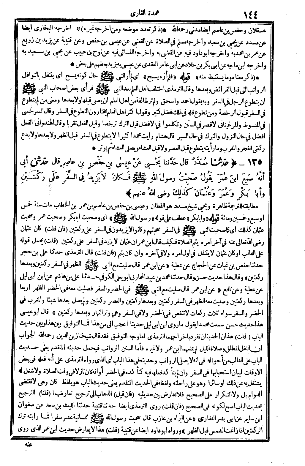 2011 - حدَّثنا مُسَدَّدٌ قَالَ حدَّثنا يَحْيَى عَنْ عِيساى بنِ حَفْصٍ بنِ عاصِمٍ قَالَ حدَّثني أبي أنَّهُ سَمعَ ابنَ عُمَرَ يَقُولُ صَحِبْتُ رسولَ الله صلى الله عَلَيْهِ وَسلم فَكانَ لاَ يَزِيدُ فِي السَّفَرِ عَلَى رَكْعَتَيْنِ وأبَا بَكْرٍ وعُمَرَ وَعُثْمَانَ كَذالِكَ رَضِي الله تَعَالَى عَنْهُم.