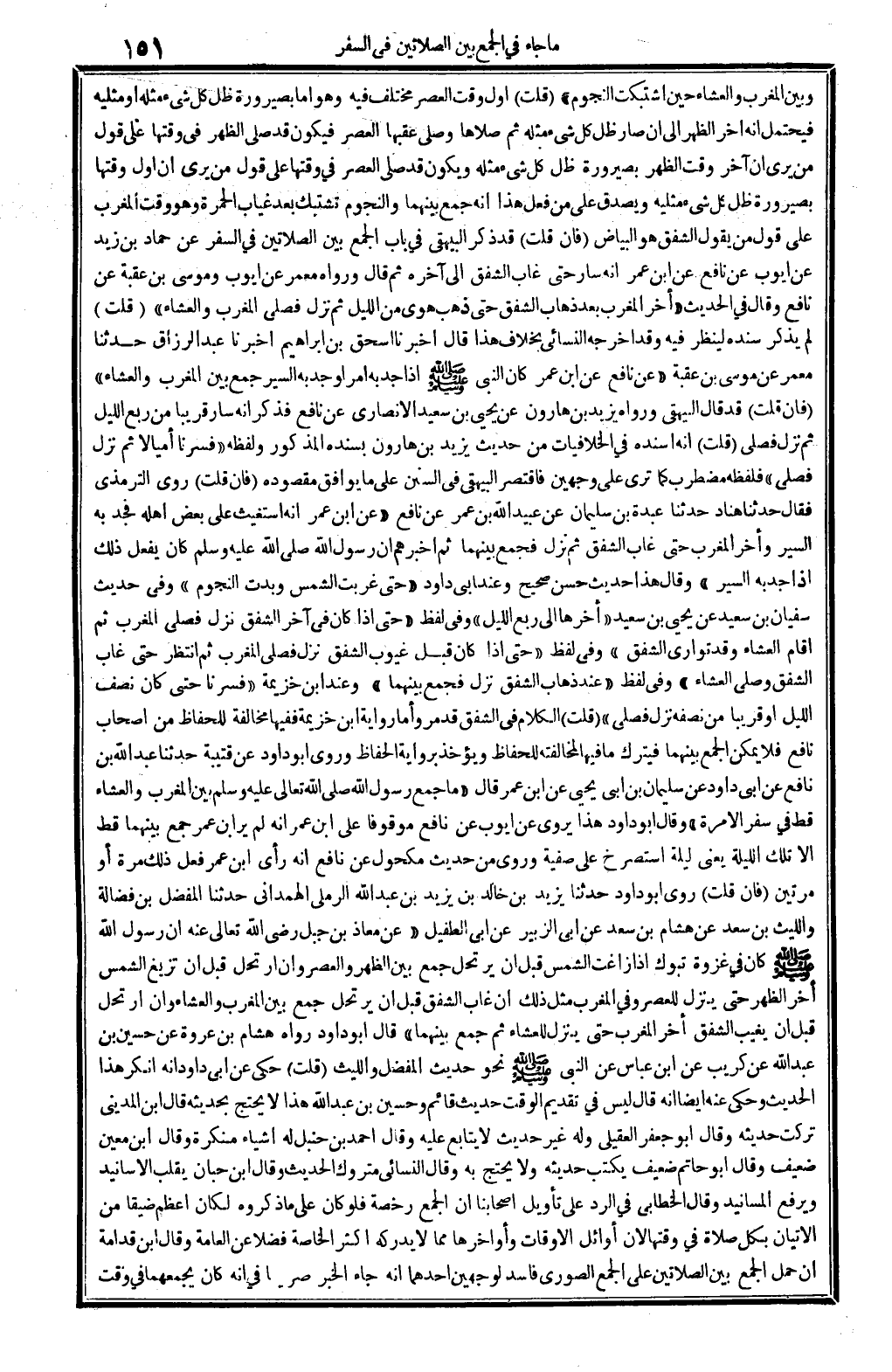 فَإِن قلت: روى التِّرْمِذِيّ فَقَالَ: حَدثنَا هناد حَدثنَا عَبدة بن سُلَيْمَان عَن عبيد الله بن عمر عَن نَافِع (عَن ابْن عمر أَنه استغيث على بعض أَهله فجد بِهِ السّير وَأخر الْمغرب حَتَّى غَابَ الشَّفق، ثمَّ نزل فَجمع بَينهمَا، ثمَّ أخْبرهُم أَن رَسُول الله، صلى الله عَلَيْهِ وَسلم، كَانَ يفعل ذَلِك إِذا جد بِهِ السّير) . وَقَالَ: هَذَا حَدِيث حسن صَحِيح، وَعند أبي دَاوُد: (حَتَّى غربت الشَّمْس وبدت النُّجُوم) ، وَفِي حَدِيث سُفْيَان بن سعيد عَن يحيى بن سعيد: (أَخّرهَا إِلَى ربع اللَّيْل) ،، وَفِي لفظ: (حَتَّى إِذا كَانَ فِي آخر الشَّفق نزل فصلى الْمغرب ثمَّ أَقَامَ الْعشَاء وَقد توارى الشَّفق) ، وَفِي لفظ: (حَتَّى إِذا كَانَ قبل غيوب الشَّفق نزل فصلى الْمغرب، ثمَّ انْتظر حَتَّى غَابَ الشَّفق وَصلى الْعشَاء) . وَفِي لفظ: (عِنْد ذهَاب الشَّفق نزل فَجمع بَينهمَا) ، وَعند ابْن خُزَيْمَة: (فسرنا حَتَّى كَانَ نصف اللَّيْل أَو قَرِيبا من نصفه، نزل فصلى) قلت: الْكَلَام فِي الشَّفق قد مر، وَأما رِوَايَة ابْن خُزَيْمَة فَفِيهَا مُخَالفَة للحفاظ من أَصْحَاب نَافِع فَلَا يُمكن الْجمع بَينهمَا فَيتْرك مَا فِيهَا لمُخَالفَته للحفاظ، وَيُؤْخَذ بِرِوَايَة الْحفاظ، وروى أَبُو دَاوُد عَن قُتَيْبَة، حَدثنَا عبد الله بن نَافِع عَن أبي دَاوُد عَن سُلَيْمَان بن أبي يحيى عَن ابْن عمر قَالَ: (مَا جمع رَسُول الله، صلى الله عَلَيْهِ وَسلم، بَين الْمغرب وَالْعشَاء قطّ فِي سفر إلاّ مرّة) . وَقَالَ أَبُو دَاوُد هَذَا يرْوى عَن أَيُّوب عَن نَافِع مَوْقُوفا على ابْن عمر أَنه: لم ير ابْن عمر جمع بَينهمَا قطّ إلاّ تِلْكَ اللَّيْلَة، يَعْنِي لَيْلَة استصرخ على صَفِيَّة، وروى من حَدِيث مَكْحُول عَن نَافِع أَنه رأى ابْن عمر فعل ذَلِك مرّة أَو مرَّتَيْنِ. فَإِن قلت: روى أَبُو دَاوُد: حَدثنَا يزِيد بن خَالِد بن يزِيد بن عبد الله الرَّمْلِيّ الْهَمدَانِي حَدثنَا الْمفضل بن فضَالة وَاللَّيْث بن سعد عَن هِشَام بن سعد عَن أبي الزبير عَن أبي الطُّفَيْل (عَن معَاذ بن جبل، رَضِي الله تَعَالَى عَنهُ: أَن رَسُول الله صلى الله عَلَيْهِ وَسلم كَانَ فِي غَزْوَة تَبُوك إِذا زاغت الشَّمْس قبل أَن يرتحل جمع بَين الظّهْر وَالْعصر، وَإِن ارتحل قبل أَن تزِيغ الشَّمْس أخر الظّهْر حَتَّى ينزل للعصر، وَفِي الْمغرب مثل ذَلِك إِن غَابَ الشَّفق قبل أَن يرتحل جمع بَين الْمغرب وَالْعشَاء، وَإِن ارتحل قبل أَن يغيب الشَّفق أخر الْمغرب حَتَّى ينزل للعشاء ثمَّ جمع بَينهمَا) . قَالَ أَبُو دَاوُد: رَوَاهُ هِشَام بن عُرْوَة عَن حُسَيْن بن عبد الله عَن كريب عَن ابْن عَبَّاس عَن النَّبِي صلى الله عَلَيْهِ وَسلم نَحْو حَدِيث الْمفضل وَاللَّيْث قلت: حُكيَ عَن أبي دَاوُد أَنه أنكر هَذَا الحَدِيث، وَحكي عَنهُ أَيْضا أَنه قَالَ: لَيْسَ فِي تَقْدِيم الْوَقْت حَدِيث قَائِم، وحسين بن عبد الله هَذَا لَا يحْتَج بحَديثه، قَالَ ابْن الْمَدِينِيّ: تركت حَدِيثه. وَقَالَ أَبُو جَعْفَر الْعقيلِيّ: وَله غير حَدِيث لَا يُتَابع عَلَيْهِ، وَقَالَ أَحْمد بن حَنْبَل: لَهُ أَشْيَاء مُنكرَة، وَقَالَ ابْن معِين: ضَعِيف. وَقَالَ أَبُو حَاتِم: ضَعِيف يكْتب حَدِيثه وَلَا يحْتَج بِهِ. وَقَالَ النَّسَائِيّ: مَتْرُوك الحَدِيث. وَقَالَ ابْن حبَان: يقلب الْأَسَانِيد وَيرْفَع المسانيد.