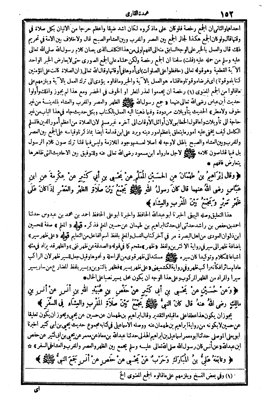 إِحْدَاهمَا، وَالثَّانِي: أَن الْجمع رخصَة، فَلَو كَانَ على مَا ذَكرُوهُ لَكَانَ أَشد ضيقا وَأعظم حرجا من الْإِتْيَان بِكُل صَلَاة فِي وَقتهَا، قَالَ: وَلَو كَانَ الْجمع هَكَذَا لجَاز الْجمع بَين الْعَصْر وَالْمغْرب، وَبَين الْعشَاء وَالصُّبْح. قَالَ: وَلَا خلاف بَين الْأمة فِي تَحْرِيم ذَلِك. قَالَ: وَالْعَمَل بالْخبر على الْوَجْه السَّابِق مِنْهُ إِلَى الْفَهم أولى من هَذَا التَّكَلُّف الَّذِي يصان كَلَام رَسُول الله، صلى الله عَلَيْهِ وَسلم، من حمله عَلَيْهِ. قلت: سلمنَا أَن الْجمع رخصَة، وَلَكِن حملناه على الْجمع الصُّورِي حَتَّى لَا يُعَارض الْخَبَر الْوَاحِد الْآيَة القطعية، وَهُوَ قَوْله تَعَالَى: {حَافظُوا على الصَّلَوَات} (الْبَقَرَة: 832) . أَي: أدوها فِي أَوْقَاتهَا، وَقَالَ الله تَعَالَى: {إِن الصَّلَاة كَانَت على الْمُؤمنِينَ كتابا موقوتا} (النِّسَاء: 301) . أَي: فرضا موقوتا، وَمَا قُلْنَاهُ هُوَ الْعَمَل بِالْآيَةِ وَالْخَبَر، وَمَا قَالُوهُ يُؤَدِّي إِلَى ترك الْعَمَل بِالْآيَةِ ويلزمهم على مَا قَالُوا من الْجمع الْمَعْنَوِيّ رخصَة أَن يجمعوا لعذر الْمَطَر أَو الْخَوْف فِي الْحَضَر، وَمَعَ هَذَا لم يجوزوا ذَلِك، وَأولُوا حَدِيث ابْن عَبَّاس، رَضِي الله تَعَالَى عَنْهُمَا: (جمع رَسُول الله صلى الله عَلَيْهِ وَسلم الظّهْر وَالْعصر وَالْمغْرب وَالْعشَاء بِالْمَدِينَةِ من غير خوف وَلَا مطر) ، الحَدِيث، بتأويلات مَرْدُودَة، وَفِيمَا ذَهَبْنَا إِلَيْهِ الْعَمَل بِالْكتاب، وَبِكُل حَدِيث جَاءَ فِي هَذَا الْبَاب من غير حَاجَة إِلَى تأويلات، وَأما قَول الْخطابِيّ: لِأَن أَوَائِل الْأَوْقَات. . إِلَى آخِره، غير مُسلم، لِأَن الصَّلَاة من أعظم أُمُور الدّين فالمسلم الْكَامِل كَيفَ يخفى عَلَيْهِ أُمُور مَا يتَعَلَّق بأعظم أُمُور دينه؟ وَيرد على ابْن قدامَة أَيْضا بِمَا ذكرنَا، وَقِيَاسه على الْجمع بَين الْعَصْر وَالْمغْرب، وَبَين الْعشَاء وَالصُّبْح بَاطِل لَا وَجه لَهُ أصلا لعدم وجود الْمُلَازمَة، وَلَيْسَ فِيمَا قُلْنَا ترك صون كَلَام الرَّسُول، بل فِيمَا قُلْنَا صون كَلَامه صلى الله عَلَيْهِ وَسلم لأجل مَا رَوَاهُ ابْن مَسْعُود، رَضِي الله تَعَالَى عَنهُ، وللتوفيق بَين الْأَحَادِيث الَّتِي ظَاهرهَا يتعارض، فَافْهَم.