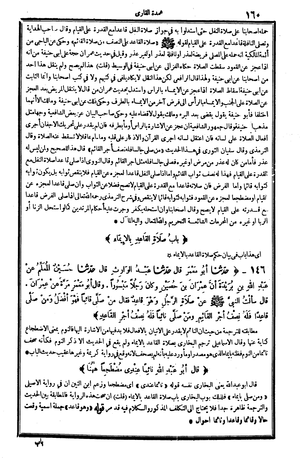 حمله أَصْحَابنَا على صَلَاة النَّفْل حَتَّى استدلوا بِهِ فِي جَوَاز صَلَاة النَّفْل قَاعِدا مَعَ الْقُدْرَة على الْقيام، وَقَالَ صَاحب (الْهِدَايَة) : وَتصلي النَّافِلَة قَاعِدا مَعَ الْقُدْرَة على الْقيام لقَوْله صلى الله عَلَيْهِ وَسلم: (صَلَاة الْقَاعِد على النّصْف من صَلَاة الْقَائِم) ، وَحكي عَن الْبَاجِيّ من أَئِمَّة الْمَالِكِيَّة أَنه حمله على الْمُصَلِّي فَرِيضَة لعذر أَو نَافِلَة لعذر أَو لغير عذر، وَقيل: فِي حَدِيث عمرَان حجَّة على أبي حنيفَة من أَنه إِذا عجز عَن الْقعُود سَقَطت الصَّلَاة، حَكَاهُ الْغَزالِيّ عَن أبي حنيفَة فِي (الْوَسِيط) قلت: هَذَا لم يَصح وَلم ينْقل هَذَا أحد من أَصْحَابنَا عَن أبي حنيفَة، وَلِهَذَا قَالَ لرافعي: لَكِن هَذَا النَّقْل لَا يكَاد يلفي فِي كتبهمْ وَلَا فِي كتب أَصْحَابنَا، وَإِنَّمَا الثَّابِت عَن أبي حنيفَة إِسْقَاط الصَّلَاة إِذا عجز عَن الْإِيمَاء بِالرَّأْسِ، وَاسْتدلَّ بِحَدِيث عمرَان من قَالَ: لَا ينْتَقل الْمَرِيض بعد الْعَجز عَن الصَّلَاة على الْجنب والإيماء بِالرَّأْسِ إِلَى فرض آخر من الْإِيمَاء بالطرف، وَحكي ذَلِك عَن أبي حنيفَة وَمَالك إلاّ أَنَّهُمَا اخْتلفَا، فَأَبُو حنيفَة يَقُول: يقْضِي بعد الْبُرْء، وَمَالك يَقُول: لَا قَضَاء عَلَيْهِ. وَحكى صَاحب (الْبَيَان) عَن بعض الشَّافِعِيَّة وَجها مثل مَذْهَب أبي حنيفَة وَقَالَ جُمْهُور الشَّافِعِيَّة: إِن عجز عَن الْإِشَارَة بِالرَّأْسِ أَوْمَأ بطرفه، فَإِن لم يقدر على تَحْرِيك الأجفان أجْرى أَفعَال الصَّلَاة على لِسَانه، فَإِن اعتقل لِسَانه أجْرى الْقُرْآن والأذكار على قلبه، وَمَا دَامَ عَاقِلا لَا تسْقط عَنهُ الصَّلَاة، وَقَالَ التِّرْمِذِيّ: وَقَالَ سُفْيَان الثَّوْريّ فِي هَذَا الحَدِيث: (من صلى جَالِسا فَلهُ نصف أجر الْقَائِم) . قَالَ: هَذَا للصحيح وَلمن لَيْسَ لَهُ عذر، فَأَما من كَانَ لَهُ عذر من مرض أَو غَيره فصلى جَالِسا فَلهُ مثل أجر الْقَائِم، وَقَالَ النَّوَوِيّ: إِذا صلى قَاعِدا صَلَاة النَّفْل مَعَ الْقُدْرَة على الْقيام فَهَذَا لَهُ نصف ثَوَاب الْقَائِم، وَأما إِذا صلى النَّفْل قَاعِدا لعَجزه عَن الْقيام فَلَا ينقص ثَوَابه، بل يكون ثَوَابه كثوابه قَائِما، وَأما الْفَرْض فَإِن صلَاته قَاعِدا مَعَ الْقُدْرَة على الْقيام لَا تصح، فضلا عَن الثَّوَاب. وَإِن صلى قَاعِدا لعَجزه عَن الْقيام أَو مُضْطَجعا لعَجزه عَن الْقعُود، فثوابه كثوابه قَائِما لَا ينقص. وَفِي (شرح التِّرْمِذِيّ) رَحمَه الله تَعَالَى: إِذا صلى الْفَرْض قَاعِدا مَعَ قدرته على الْقيام لَا يَصح، وَقَالَ أَصْحَابنَا وَفِيه: وَإِن استحله يكفر، وَجَرت عَلَيْهِ أَحْكَام الْمُرْتَدين، كَمَا لَو اسْتحلَّ الزِّنَا أَو الرِّبَا أَو غَيره من الْمُحرمَات الشائعة التَّحْرِيم، وَالله المتعال وَإِلَيْهِ الْمَآل.