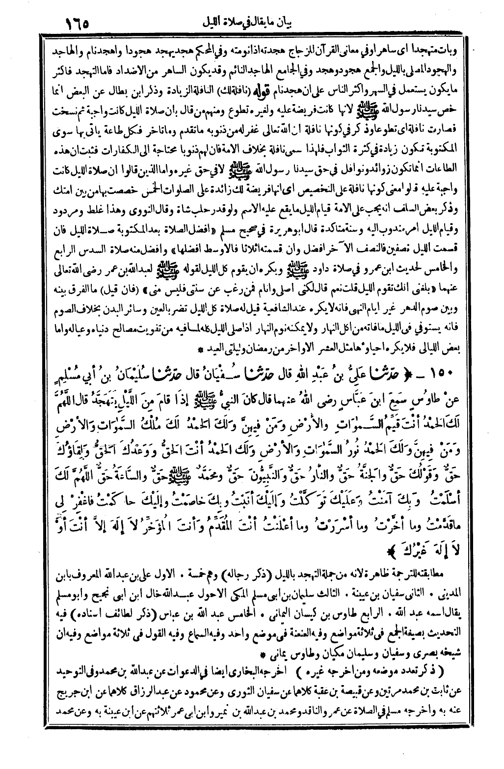 0211 - حدَّثنا عَلِيُّ بنُ عَبْدِ الله قَالَ حدَّثنا سُفْيَانُ قَالَ حدَّثنا سُلَيْمَانُ بنُ أبِي مُسْلِمٍ عنْ طَاوُوسٍ سَمِعَ ابنَ عَبَّاسٍ رَضِي الله تَعَالَى عَنْهُمَا قَالَ كانَ النبيُّ صلى الله عَلَيْهِ وَسلم إذَا قامَ مِنَ اللَّيْلِ يَتَهَجَّدُ قَالَ اللَّهُمَّ لَكَ الحَمْدُ أنْتَ قَيِّمُ السَّماواتِ والأرْضِ وَمَنْ فِيهِنَّ وَلَكَ الحَمْدُ لَكَ مُلْكُ السَّماواتِ وَالأرْضِ وَمَنْ فِيهِنَّ وَلَكَ الحَمْدُ نُورُ السَّماوات وَالأرضِ ولَكَ الحَمْدُ وَوَعْدُكَ الحَقُّ وَلِقَاؤُكَ حَقٌّ وقولك حق وَالْجنَّة حق وَالنَّار حق والنبيون حق ومحمَّدٌ صلى الله عَلَيْهِ وَسلم حَقٌّ والسَّاعَةُ حَقٌّ اللَّهُمَّ لَكَ أسْلَمْتُ وَبِكَ آمَنْتُ وَعَلَيْكَ تَوَكَّلْتُ وَإلَيْكَ أنَبْتُ وبِكَ خاصَمْتُ وإلَيْكَ حاكَمْتُ فاغْفِرْ لِي مَا قَدَّمْتُ وَمَا أخَّرْتُ وَمَا أسْرَرْتُ وَمَا أعْلَنْتُ أنْتَ المُقَدِّمُ وَأنْتَ المُؤَخِّرُ لاَ إلَهَ إلاَّ أنْتَ أوْ لاَ إلاهَ غَيْرَكَ..