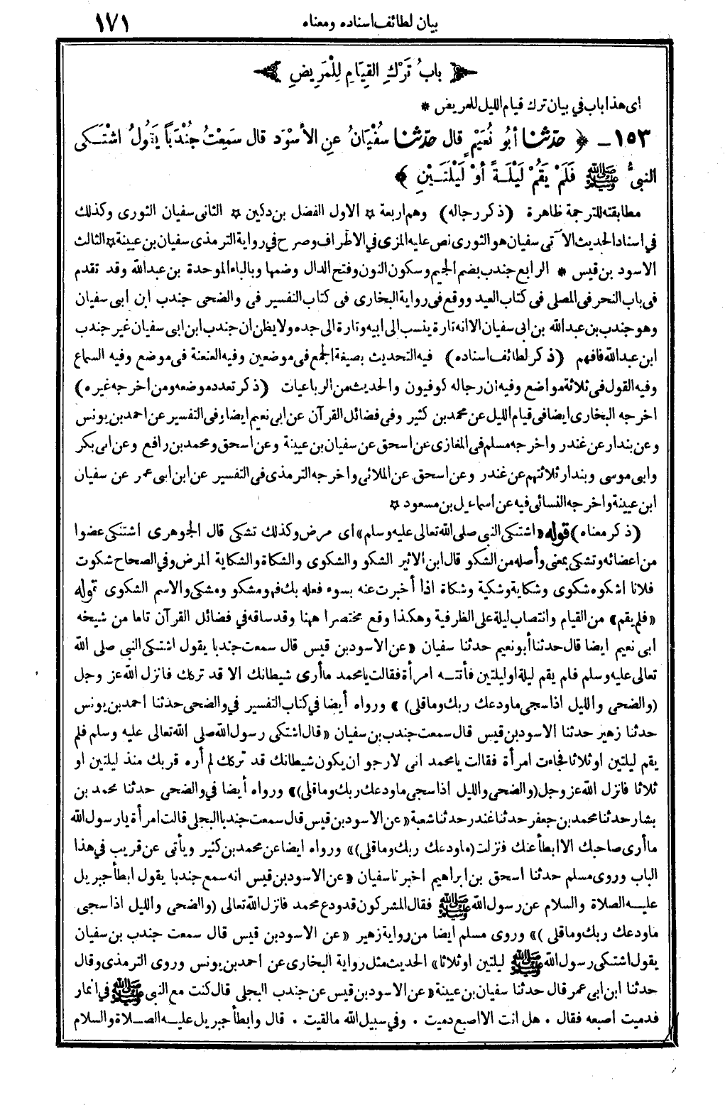ذكر مَعْنَاهُ: قَوْله: (اشْتَكَى النَّبِي، صلى الله عَلَيْهِ وَسلم) ، أَي: مرض، وَكَذَلِكَ: تشكى، قَالَ الْجَوْهَرِي: اشْتَكَى عضوا من أَعْضَائِهِ وتشكى بِمَعْنى، وَأَصله من الشكو، قَالَ ابْن الْأَثِير: الشكو والشكوى والشكاة والشكاية: الْمَرَض. وَفِي (الصِّحَاح) : شَكَوْت فلَانا أشكوه شكوى وشكاية وشكية وشكاة إِذا أخْبرت عَنهُ بِسوء فعله بك، فَهُوَ مشكو ومشكي، والإسم: الشكوى. قَوْله: (فَلم يقم) ، من الْقيام، وانتصاب لَيْلَة على الظَّرْفِيَّة، وَهَكَذَا وَقع مُخْتَصرا هَهُنَا، وَقد سَاقه فِي فَضَائِل الْقُرْآن تَاما من شَيْخه أبي نعيم أَيْضا، قَالَ: حَدثنَا أَبُو نعيم حَدثنَا سُفْيَان (عَن الْأسود بن قيس، قَالَ: سَمِعت جندبا يَقُول: اشْتَكَى النَّبِي، صلى الله عَلَيْهِ وَسلم، فَلم يقم لَيْلَة أَو لَيْلَتَيْنِ، فَأَتَتْهُ امْرَأَة، فَقَالَت: يَا مُحَمَّد مَا أرى شَيْطَانك إلاّ قد تَركك؟ فَأنْزل الله، عز وَجل: {وَالضُّحَى وَاللَّيْل إِذا سجى مَا وَدعك رَبك وَمَا قلى} (وَالضُّحَى: 1 3) . وَرَوَاهُ أَيْضا فِي كتاب التَّفْسِير فِي {وَالضُّحَى} : حَدثنَا أَحْمد بن يُونُس حَدثنَا زُهَيْر حَدثنَا الْأسود بن قيس قَالَ: سَمِعت جُنْدُب بن سُفْيَان (قَالَ: اشْتَكَى رَسُول الله، صلى الله عَلَيْهِ وَسلم، فَلم يقم لَيْلَتَيْنِ أَو ثَلَاثًا، فَجَاءَت امْرَأَة فَقَالَت: يَا مُحَمَّد إِنِّي لأرجو أَن يكون شَيْطَانك قد تَركك؟ لم أره قربك مُنْذُ لَيْلَتَيْنِ أَو ثَلَاثًا؟ فَأنْزل الله عز وَجل: {وَالضُّحَى وَاللَّيْل إِذا سجى مَا وَدعك رَبك وَمَا قلى} (وَالضُّحَى: 3) . وَرَوَاهُ أَيْضا فِي {وَالضُّحَى} : حَدثنَا مُحَمَّد بن بشار حَدثنَا مُحَمَّد بن جَعْفَر حَدثنَا غنْدر حَدثنَا شُعْبَة (عَن الْأسود بن قيس قَالَ: سَمِعت جندبا البَجلِيّ. . قَالَت امْرَأَة: يَا رَسُول الله مَا أرى صَاحبك إلاّ أَبْطَأَ عَنْك؟ فَنزلت: {مَا وَدعك رَبك وَمَا قلى} (وَالضُّحَى: 3) . وَرَوَاهُ أَيْضا عَن مُحَمَّد بن كثير، وَيَأْتِي عَن قريب فِي هَذَا الْبَاب، وروى مُسلم: حَدثنَا إِسْحَاق بن إِبْرَاهِيم أخبرنَا سُفْيَان (عَن الْأسود بن قيس أَنه سمع جندبا يَقُول: أَبْطَأَ جِبْرِيل، عَلَيْهِ الصَّلَاة وَالسَّلَام، عَن رَسُول الله صلى الله عَلَيْهِ وَسلم، فَقَالَ الْمُشْركُونَ: قد ودع مُحَمَّد، فَأنْزل الله تَعَالَى: {وَالضُّحَى وَاللَّيْل إِذا سجى مَا وَدعك رَبك وَمَا قلى} (وَالضُّحَى: 1 3) . وروى مُسلم أَيْضا من رِوَايَة زُهَيْر (عَن الْأسود بن قيس، قَالَ: سَمِعت جُنْدُب بن سُفْيَان يَقُول: اشْتَكَى رَسُول الله صلى الله عَلَيْهِ وَسلم لَيْلَتَيْنِ أَو ثَلَاثًا. .) الحَدِيث، مثل رِوَايَة البُخَارِيّ عَن أَحْمد بن يُونُس، وروى التِّرْمِذِيّ وَقَالَ: حَدثنَا ابْن أبي عمر، قَالَ: حَدثنَا سُفْيَان بن عُيَيْنَة (عَن الْأسود بن قيس عَن جُنْدُب البَجلِيّ، قَالَ: كنت مَعَ النَّبِي صلى الله عَلَيْهِ وَسلم فِي أَنْمَار، فدميت إصبعه فَقَالَ: هَل أَنْت إِلَّا اصبع دميت. وَفِي سَبِيل الله مَا لقِيت، قَالَ: وَأَبْطَأ جِبْرِيل، عَلَيْهِ الصَّلَاة وَالسَّلَام،