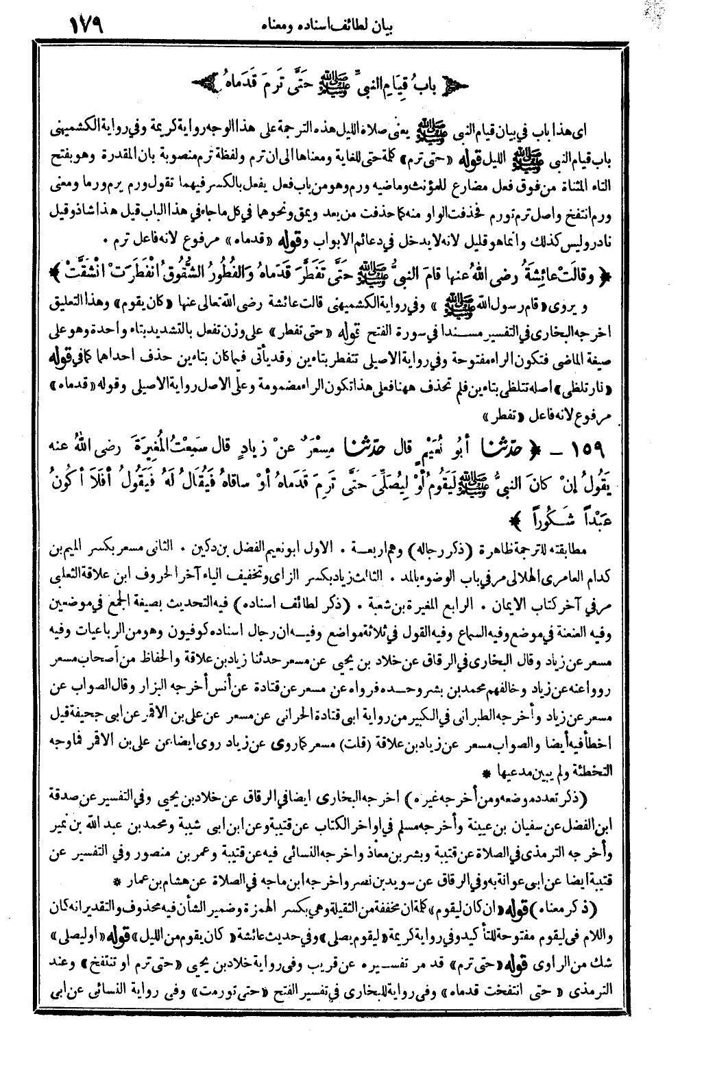 (حَدثنَا أَبُو نعيم قَالَ حَدثنَا مسعر عَن زِيَاد قَالَ سَمِعت الْمُغيرَة رَضِي الله عَنهُ يَقُول إِن كَانَ النَّبِي - صَلَّى اللَّهُ عَلَيْهِ وَسَلَّم َ - ليقوم أَو ليُصَلِّي حَتَّى ترم قدماه أَو ساقاه فَيُقَال لَهُ فَيَقُول أَفلا أكون عبدا شكُورًا) مطابقته للتَّرْجَمَة ظَاهِرَة. (ذكر رِجَاله) وهم أَرْبَعَة. الأول أَبُو نعيم الْفضل بن دُكَيْن. الثَّانِي مسعر بِكَسْر الْمِيم بن كدام العامري الْهِلَالِي مر فِي بَاب الْوضُوء بِالْمدِّ. الثَّالِث زِيَاد بِكَسْر الزَّاي وَتَخْفِيف الْيَاء آخر الْحُرُوف ابْن علاقَة الثَّعْلَبِيّ مر فِي آخر كتاب الْإِيمَان. الرَّابِع الْمُغيرَة بن شُعْبَة. (ذكر لطائف إِسْنَاده) فِيهِ التحديث بِصِيغَة الْجمع فِي موضِعين وَفِيه العنعنة فِي مَوضِع وَفِيه السماع وَفِيه القَوْل فِي ثَلَاثَة مَوَاضِع وَفِيه أَن رجال إِسْنَاده كوفيون وَهُوَ من الرباعيات وَفِيه مسعر عَن زِيَاد وَقَالَ البُخَارِيّ فِي الرقَاق عَن خَلاد بن يحيى عَن مسعر حَدثنَا زِيَاد بن علاقَة والحفاظ من أَصْحَاب مسعر رووا عَنهُ عَن زِيَاد وَخَالفهُم مُحَمَّد بن بشر وَحده فَرَوَاهُ عَن مسعر عَن قَتَادَة عَن أنس أخرجه الْبَزَّار وَقَالَ الصَّوَاب عَن مسعر عَن زِيَاد وَأخرجه الطَّبَرَانِيّ فِي الْكَبِير من رِوَايَة أبي قَتَادَة الْحَرَّانِي عَن مسعر عَن عَليّ بن الْأَقْمَر عَن أبي جُحَيْفَة قيل أَخطَأ فِيهِ أَيْضا وَالصَّوَاب مسعر عَن زِيَاد بن علاقَة (قلت) مسعر كَمَا روى عَن زِيَاد روى أَيْضا عَن عَليّ بن الْأَقْمَر فَمَا وَجه التخطئة وَلم يبين مدعيها (ذكر تعدد مَوْضِعه وَمن أخرجه غَيره) أخرجه البُخَارِيّ أَيْضا فِي الرقَاق عَن خَلاد بن يحيى وَفِي التَّفْسِير عَن صَدَقَة ابْن الْفضل عَن سُفْيَان بن عُيَيْنَة وَأخرجه مُسلم فِي أَوَاخِر الْكتاب عَن قُتَيْبَة وَعَن ابْن أبي شيبَة وَمُحَمّد بن عبد الله بن نمير وَأخرجه التِّرْمِذِيّ فِي الصَّلَاة عَن قُتَيْبَة وَبشر بن معَاذ وَأخرجه النَّسَائِيّ فِيهِ عَن قُتَيْبَة وَعمر بن مَنْصُور وَفِي التَّفْسِير عَن قُتَيْبَة أَيْضا عَن أبي عوَانَة بِهِ وَفِي الرقَاق عَن سُوَيْد بن نصر وَأخرجه ابْن مَاجَه فِي الصَّلَاة عَن هِشَام بن عمار (ذكر مَعْنَاهُ) قَوْله " إِن كَانَ ليقوم " كلمة إِن مُخَفّفَة من الثَّقِيلَة وَهِي بِكَسْر الْهمزَة وَضمير الشَّأْن فِيهِ مَحْذُوف وَالتَّقْدِير أَنه كَانَ وَاللَّام فِي ليقوم مَفْتُوحَة للتَّأْكِيد وَفِي رِوَايَة كَرِيمَة " ليقوم يُصَلِّي " وَفِي حَدِيث عَائِشَة " كَانَ يقوم من اللَّيْل " قَوْله " أَو ليُصَلِّي " شكّ من الرَّاوِي قَوْله " حَتَّى ترم " قد مر تَفْسِيره عَن قريب وَفِي رِوَايَة خَلاد بن يحيى " حَتَّى ترم أَو تنتفخ " وَعند التِّرْمِذِيّ " حَتَّى انتفخت قدماه " وَفِي رِوَايَة للْبُخَارِيّ فِي تَفْسِير الْفَتْح " حَتَّى تورمت " وَفِي رِوَايَة النَّسَائِيّ عَن أبي