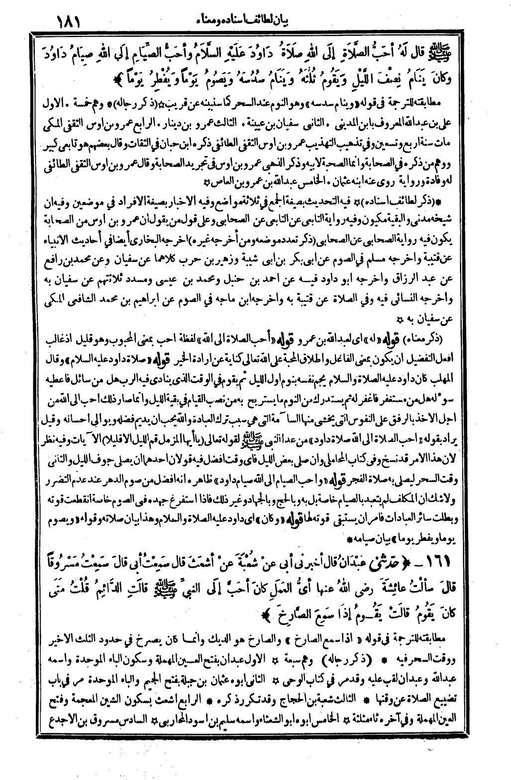 - صَلَّى اللَّهُ عَلَيْهِ وَسَلَّم َ - قَالَ أحب الصَّلَاة إِلَى الله صَلَاة دَاوُد عَلَيْهِ السَّلَام وَأحب الصّيام إِلَى الله صِيَام دَاوُد وَكَانَ ينَام نصف اللَّيْل وَيقوم ثلثه وينام سدسه ويصوم يَوْمًا وَيفْطر يَوْمًا) مطابقته للتَّرْجَمَة " وينام سدسه " وَهُوَ النّوم عِنْد السحر كَمَا سنبينه عَن قريب (ذكر رِجَاله) وهم خَمْسَة. الأول عَليّ بن عبد الله الْمَعْرُوف بِابْن الْمَدِينِيّ. الثَّانِي سُفْيَان بن عُيَيْنَة. الثَّالِث عَمْرو بن دِينَار. الرَّابِع عَمْرو بن أَوْس الثَّقَفِيّ الْمَكِّيّ مَاتَ سنة أَرْبَعَة وَتِسْعين وَفِي تذهيب التَّهْذِيب عَمْرو بن أَوْس الثَّقَفِيّ الطَّائِفِي ذكره ابْن حبَان فِي الثِّقَات وَقَالَ بَعضهم هُوَ تَابِعِيّ كَبِير وَوهم من ذكره فِي الصَّحَابَة وَإِنَّمَا الصُّحْبَة لِأَبِيهِ وَذكر الذَّهَبِيّ عَمْرو بن أَوْس فِي تَجْرِيد الصَّحَابَة وَقَالَ عَمْرو بن أَوْس الثَّقَفِيّ الطَّائِفِي لَهُ وفادة وَرِوَايَة روى عَنهُ ابْنه عُثْمَان. الْخَامِس عبد الله بن عَمْرو بن الْعَاصِ (ذكر لطائف إِسْنَاده) فِيهِ التحديث بِصِيغَة الْجمع فِي ثَلَاثَة مَوَاضِع وَفِيه الْإِخْبَار بِصِيغَة الْإِفْرَاد فِي موضِعين وَفِيه أَن شَيْخه مدنِي والبقية مكيون وَفِيه رِوَايَة التَّابِعِيّ عَن التَّابِعِيّ عَن الصَّحَابِيّ وعَلى قَول من يَقُول أَن عَمْرو بن أَوْس من الصَّحَابَة يكون فِيهِ رِوَايَة الصَّحَابِيّ عَن الصَّحَابِيّ. (ذكر تعدد مَوْضِعه وَمن أخرجه غَيره) أخرجه البُخَارِيّ أَيْضا فِي أَحَادِيث الْأَنْبِيَاء عَن قُتَيْبَة وَأخرجه مُسلم فِي الصَّوْم عَن أبي بكر بن أبي شيبَة وَزُهَيْر بن حَرْب كِلَاهُمَا عَن سُفْيَان وَعَن مُحَمَّد بن رَافع عَن عبد الرَّزَّاق وَأخرجه أَبُو دَاوُد فِيهِ عَن أَحْمد بن حَنْبَل وَمُحَمّد بن عِيسَى ومسدد ثَلَاثَتهمْ عَن سُفْيَان بِهِ وَأخرجه النَّسَائِيّ فِيهِ وَفِي الصَّلَاة عَن قُتَيْبَة بِهِ وَأخرجه ابْن ماجة فِي الصَّوْم عَن إِبْرَاهِيم بن مُحَمَّد الشَّافِعِي الْمَكِّيّ عَن سُفْيَان بِهِ (ذكر مَعْنَاهُ) قَوْله " لَهُ " أَي لعبد الله بن عَمْرو قَوْله " أحب الصَّلَاة إِلَى الله " لَفْظَة أحب بِمَعْنى المحبوب وَهُوَ قَلِيل إِذْ غَالب أفعل التَّفْضِيل أَن يكون بِمَعْنى الْفَاعِل وَإِطْلَاق الْمحبَّة على الله تَعَالَى كِنَايَة عَن إِرَادَة الْخَيْر قَوْله " صَلَاة دَاوُد عَلَيْهِ السَّلَام " وَقَالَ الْمُهلب كَانَ دَاوُد عَلَيْهِ الصَّلَاة وَالسَّلَام يجم نفس بنوم أول اللَّيْل ثمَّ يقوم فِي الْوَقْت الَّذِي يُنَادي فِيهِ الرب هَل من سَائل فَأعْطِيه سؤله هَل من مُسْتَغْفِر فَأغْفِر لَهُ ثمَّ يسْتَدرك من النّوم مَا يستريح بِهِ من نصب الْقيام فِي بَقِيَّة اللَّيْل وَإِنَّمَا صَار ذَلِك أحب إِلَى الله من أجل الْأَخْذ بالرفق على النُّفُوس الَّتِي يخْشَى مِنْهَا السَّآمَة الَّتِي هِيَ سَبَب ترك الْعِبَادَة وَالله يحب أَن يديم فَضله ويوالي إحسانه وَقيل يُرَاد بقوله " أحب الصَّلَاة إِلَى الله صَلَاة دَاوُد " من عدا النَّبِي - صَلَّى اللَّهُ عَلَيْهِ وَسَلَّم َ - لقَوْله تَعَالَى {يَا أَيهَا المزمل قُم اللَّيْل إِلَّا قَلِيلا} الْآيَات وَفِيه نظر لِأَن هَذَا الْأَمر قد نسخ وَفِي كتاب الْمحَامِلِي وَإِن صلى بعض اللَّيْل فَأَي وَقت أفضل فِيهِ قَولَانِ أَحدهمَا أَن يُصَلِّي جَوف اللَّيْل وَالثَّانِي وَقت السحر ليُصَلِّي بِهِ صَلَاة الْفجْر قَوْله " وَأحب الصّيام إِلَى الله صِيَام دَاوُد " ظَاهره أَنه أفضل من صَوْم الدَّهْر عِنْد عدم التضرر وَلَا شكّ أَن الْمُكَلف لم يتعبد بالصيام خَاصَّة بل بِهِ وبالحج وبالجهاد وَغير ذَلِك فَإِذا استفرغ جهده فِي الصَّوْم خَاصَّة انْقَطَعت قوته وَبَطلَت سَائِر الْعِبَادَات فَأمر أَن يستبقي قوته قَوْله " وَكَانَ " أَي دَاوُد عَلَيْهِ الصَّلَ