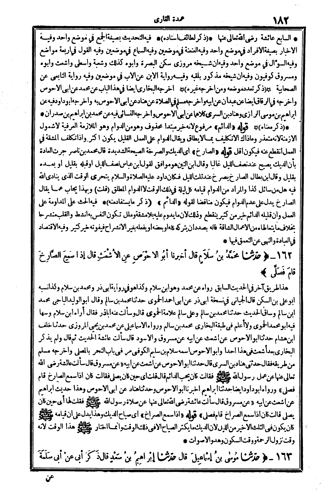 162 - (حَدثنَا مُحَمَّد بن سَلام قَالَ أخبرنَا أَبُو الْأَحْوَص عَن الْأَشْعَث قَالَ إِذا سمع الصَّارِخ قَامَ فصلى) هَذَا حَدِيث آخر فِي الحَدِيث السَّابِق رَوَاهُ عَن مُحَمَّد وَهُوَ ابْن سَلام وَكَذَا هُوَ فِي رِوَايَة أبي ذَر وَمُحَمّد بن سَلام وَكَذَا نسبه أَبُو عَليّ بن السكن قَالَ الجياني فِي نُسْخَة أبي ذَر عَن أبي أَحْمد الْحَمَوِيّ حَدثنَا مُحَمَّد بن سَالم وَقَالَ أَبُو الْوَلِيد الْبَاجِيّ مُحَمَّد ابْن سَالم وسَاق الحَدِيث حَدثنَا مُحَمَّد بن سَالم وعَلى سَالم عَلامَة الْحَمَوِيّ قَالَ وَسَأَلت عَنهُ أَبَا ذَر فَقَالَ أرَاهُ ابْن سَلام وسها فِيهِ أَبُو مُحَمَّد الْحَمَوِيّ وَلَا أعلم فِي طبقَة البُخَارِيّ مُحَمَّد بن سَالم وَرَوَاهُ الْإِسْمَاعِيلِيّ عَن مُحَمَّد بن يحيى الْمروزِي حَدثنَا خلف بن هِشَام حَدثنَا أَبُو الْأَحْوَص عَن أَشْعَث عَن أَبِيه عَن مَسْرُوق وَالْأسود قَالَ سَأَلت عَائِشَة الحَدِيث ثمَّ قَالَ وَلم يذكر البُخَارِيّ بعد أَشْعَث فِي هَذَا أحدا وَأَبُو الْأَحْوَص اسْمه سَلام بن سليم الْكُوفِي مر فِي بَاب النَّحْر بالمصلى وَأخرجه مُسلم من طَرِيقه فَقَالَ حَدثنِي هناد بن السّري قَالَ حَدثنَا أَبُو الْأَحْوَص عَن أَشْعَث عَن أَبِيه " عَن مَسْرُوق قَالَ سَأَلت عَائِشَة رَضِي الله تَعَالَى عَنْهَا عَن عمل رَسُول الله - صَلَّى اللَّهُ عَلَيْهِ وَسَلَّم َ - فَقَالَت كَانَ يحب الدَّائِم قَالَ قلت أَي حِين كَانَ يُصَلِّي فَقَالَت كَانَ إِذا سمع الصَّارِخ قَامَ فصلى " وَرَوَاهُ أَبُو دَاوُد أَيْضا حَدثنَا إِبْرَاهِيم أخبرنَا أَبُو الْأَحْوَص وَحدثنَا هناد عَن أبي الْأَحْوَص وَهَذَا حَدِيث إِبْرَاهِيم عَن أَشْعَث عَن أَبِيه " عَن مَسْرُوق قَالَ سَأَلت عَائِشَة رَضِي الله تَعَالَى عَنْهَا عَن صَلَاة رَسُول الله - صَلَّى اللَّهُ عَلَيْهِ وَسَلَّم َ - فَقلت لَهَا أَي حِين كَانَ يُصَلِّي قَالَت كَانَ إِذا سمع الصُّرَاخ قَامَ فصلى " قَوْله " إِذا سمع الصُّرَاخ " أَي صياح الديك وَهَذَا يدل على أَن قِيَامه - صَلَّى اللَّهُ عَلَيْهِ وَسَلَّم َ - كَانَ يكون فِي الثُّلُث الْأَخير من اللَّيْل لِأَن الديك مَا يكثر الصياح إِلَّا فِي ذَلِك الْوَقْت وَإِنَّمَا اخْتَار - صَلَّى اللَّهُ عَلَيْهِ وَسَلَّم َ - هَذَا الْوَقْت لِأَنَّهُ وَقت نزُول الرَّحْمَة وَوقت السّكُون وهدو الْأَصْوَات.