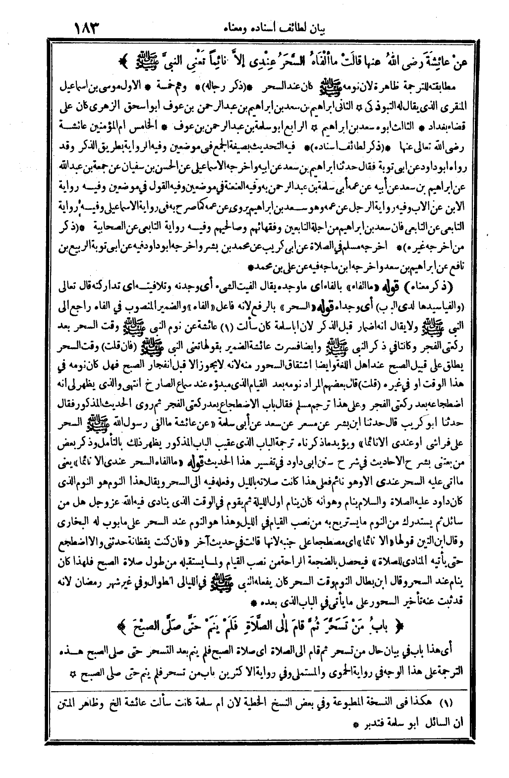 عَن عَائِشَة رَضِي الله عَنْهَا قَالَت مَا ألفاه السحر عِنْدِي إِلَّا نَائِما تَعْنِي النَّبِي - صَلَّى اللَّهُ عَلَيْهِ وَسَلَّم َ -) -