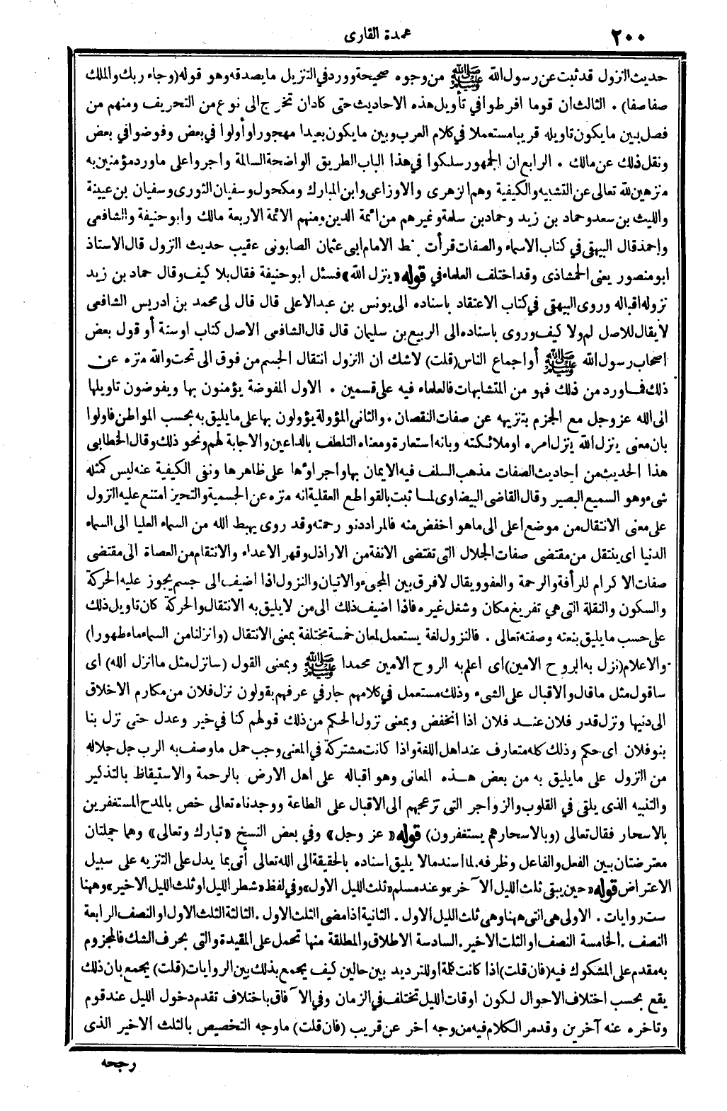 حَدِيث النُّزُول قد ثَبت عَن رَسُول الله صلى الله عَلَيْهِ وَسلم من وُجُوه صَحِيحَة، وَورد فِي التَّنْزِيل مَا يصدقهُ، وَهُوَ قَوْله: {وَجَاء رَبك وَالْملك صفا صفا} (الْفجْر: 22) . الثَّالِث: أَن قوما أفرطوا فِي تَأْوِيل هَذِه الْأَحَادِيث حَتَّى كَاد أَن تخرج إِلَى نوع من التحريف، وَمِنْهُم من فصل بَين مَا يكون تَأْوِيله قَرِيبا مُسْتَعْملا فِي كَلَام الْعَرَب، وَبَين مَا يكون بَعيدا مَهْجُورًا، وَأولُوا فِي بعض وفوضوا فِي بعض، وَنقل ذَلِك عَن مَالك.