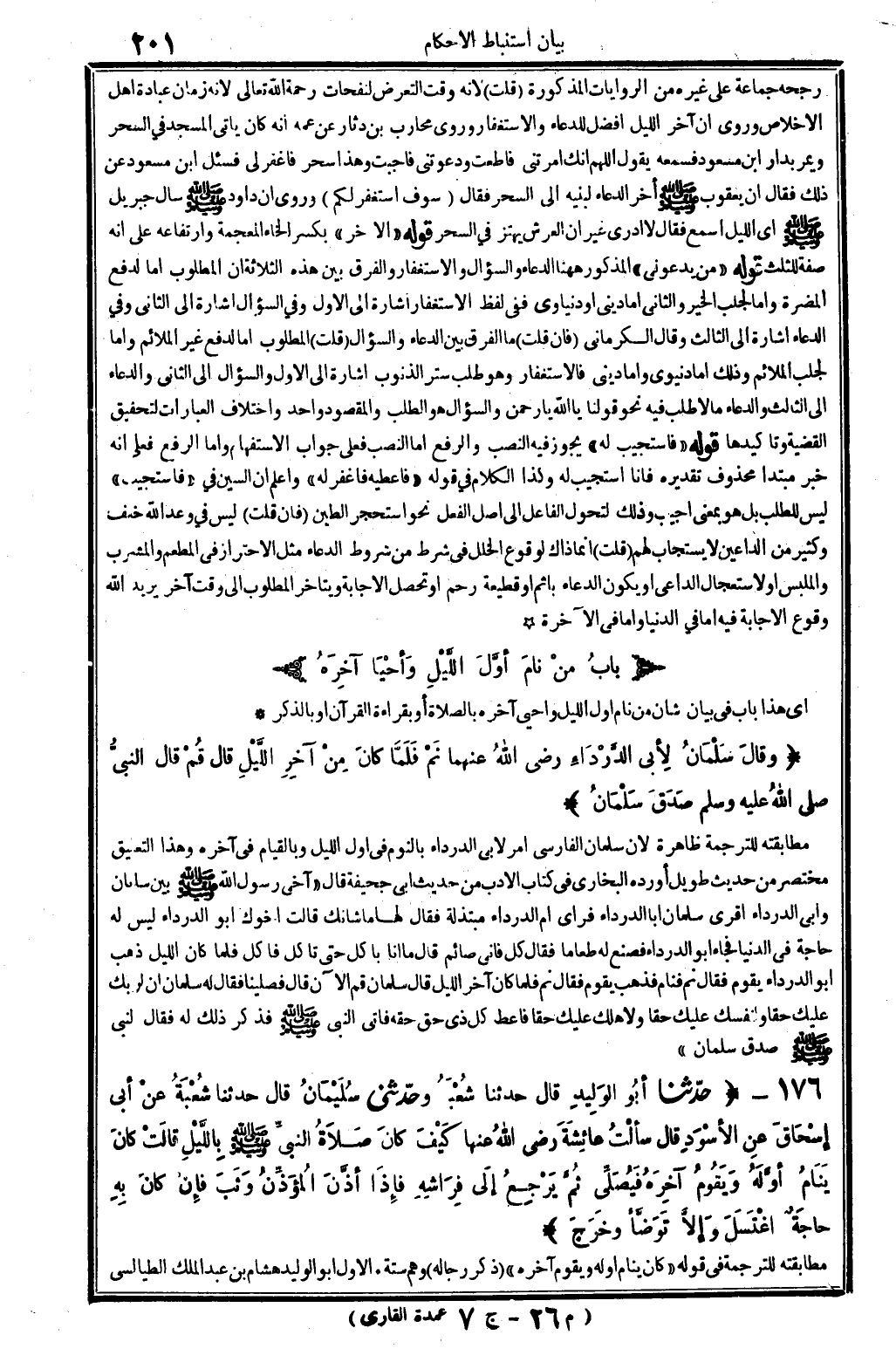 وقالَ سَلْمَانُ لأِبِي الدَّرّدَاءِ رَضِي الله تَعَالَى عَنْهُمَا نَمْ فَلَمَّا كانَ مِنْ آخِرِ اللَّيْلِ قَالَ قُمْ قَالَ النبيُّ صلى الله عَلَيْهِ وَسلم صَدَقَ سَلْمَانُ