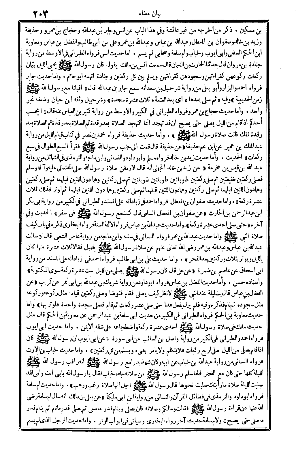 ذكر من أخرجه من غير عَائِشَة: وَفِي هَذَا الْبَاب عَن أنس وَجَابِر بن عبد الله وحجاج بن عَمْرو وَحُذَيْفَة وَزيد بن خَالِد وَصَفوَان بن الْمُعَطل وَعبد الله بن عَبَّاس وَعبد الله بن عمر وَعلي بن أبي طَالب وَالْفضل بن عَبَّاس وَمُعَاوِيَة ابْن الحكم السّلمِيّ وَأبي أَيُّوب وخباب وَأم سَلمَة وصحابي لم يسم. أما حَدِيث أنس: فَرَوَاهُ الطَّبَرَانِيّ فِي (الْأَوْسَط) من رِوَايَة جُنَادَة بن مَرْوَان، قَالَ: حَدثنَا الْحَارِث بن النُّعْمَان، قَالَ: سَمِعت أنس بن مَالك يَقُول: كَانَ رَسُول الله صلى الله عَلَيْهِ وَسلم يحيى اللَّيْل بثمان رَكْعَات ركوعهن كقراءتهن وسجودهن كقراءتهن، وَيسلم بَين كل رَكْعَتَيْنِ، وجنادة اتهمه أَبُو حَاتِم. وَأما حَدِيث جَابر فَرَوَاهُ أَحْمد وَالْبَزَّار وَأَبُو يعلى من رِوَايَة شُرَحْبِيل بن سعد أَنه سمع جَابر بن عبد الله قَالَ: (أَقبلنَا مَعَ رَسُول الله صلى الله عَلَيْهِ وَسلم زمن الْحُدَيْبِيَة) ، وَفِيه: (ثمَّ صلى بعْدهَا) أَي: بعد الْعَتَمَة، (ثَلَاث عشرَة سَجْدَة) وشرحبيل وَثَّقَهُ ابْن حبَان وَضَعفه غير وَاحِد. وَأما حَدِيث حجاج بن عَمْرو فَرَوَاهُ الطَّبَرَانِيّ فِي (الْكَبِير) و (الْأَوْسَط) من رِوَايَة كثير بن الْعَبَّاس عَنهُ، قَالَ: (أيحسب أحدكُم إِذا قَامَ من اللَّيْل يُصَلِّي حَتَّى يصبخ أَن قد تهجد، إِنَّمَا التَّهَجُّد الصَّلَاة بعد رقدة ثمَّ الصَّلَاة بعد رقدة ثمَّ الصَّلَاة بعد رقدة، تِلْكَ كَانَت صَلَاة رَسُول الله صلى الله عَلَيْهِ وَسلم) . وَأما حَدِيث حُذَيْفَة، فَرَوَاهُ مُحَمَّد بن نصر فِي (كتاب قيام اللَّيْل) من رِوَايَة عبد الْملك بن عُمَيْر عَن ابْن عَم حُذَيْفَة (عَن حُذَيْفَة، قَالَ: قُمْت إِلَى جنب رَسُول الله صلى الله عَلَيْهِ وَسلم فَقَرَأَ السَّبع الطوَال فِي سبع رَكْعَات. .) الحَدِيث. وَأما حَدِيث زيد بن خَالِد، فَرَوَاهُ مُسلم وَأَبُو دَاوُد وَالنَّسَائِيّ وَابْن مَاجَه وَالتِّرْمِذِيّ فِي الشَّمَائِل من رِوَايَة عبد الله بن قيس بن مخرمَة (عَن زيد بن خَالِد الْجُهَنِيّ، أَنه قَالَ: لأرمقن صَلَاة رَسُول الله، صلى الله عَلَيْهِ وَسلم، فصلى رَكْعَتَيْنِ خفيفتين، ثمَّ صلى رَكْعَتَيْنِ طويلتين طويلتين، ثمَّ صلى رَكْعَتَيْنِ وهما دون اللَّتَيْنِ قبلهمَا، ثمَّ صلى رَكْعَتَيْنِ وهما دون اللَّتَيْنِ قبلهمَا، ثمَّ صلى رَكْعَتَيْنِ وهما دون اللَّتَيْنِ قبلهمَا، ثمَّ صلى رَكْعَتَيْنِ وهما دون اللَّتَيْنِ قبلهمَا، ثمَّ أوتر فَذَلِك ثَلَاث عشرَة رَكْعَة) . وَأما حَدِيث صَفْوَان بن الْمُعَطل فَرَوَاهُ أَحْمد فِي زياداته على الْمسند وَالطَّبَرَانِيّ فِي (الْكَبِير) من رِوَايَة أبي بكر ابْن عبد الرَّحْمَن بن الْحَارِث (عَن صَفْوَان بن الْمُعَطل السّلمِيّ، قَالَ: كنت مَعَ رَسُول الله صلى الله عَلَيْهِ وَسلم فِي سفر. .) الحَدِيث، وَفِي آخِره: (حَتَّى صلى إِحْدَى عشرَة رَكْعَة) . وَأما حَدِيث عبد الله بن عَبَّاس فَرَوَاهُ الْأَئِمَّة السِّتَّة، فَرَوَاهُ البُخَارِيّ ذكره فِي: بَاب كَيفَ صَلَاة النَّبِي صلى الله عَلَيْهِ وَسلم، وَأما حَدِيث عبد الله بن عمر فَرَوَاهُ النَّسَائِيّ فِي (سنَنه) وَابْن مَاجَه من رِوَايَة عَامر الشّعبِيّ، قَالَ: (سَأَلت عبد الله بن عَبَّاس وَعبد الله بن عمر، رَضِي الله تَعَالَى عَنْهُم، عَن صَلَاة رَسُول الله صلى الله عَلَيْهِ وَسلم بِاللَّيْلِ فَقَالَا: ثَلَاث عشرَة، مِنْهَا ثَمَان بِاللَّيْلِ ويوتر بِثَلَاث وَرَكْعَتَيْنِ بعد الْفجْر) . وَأما حَدِيث عَليّ بن أبي طَالب، فَرَوَاهُ أَحْمد فِي زياداته على الْمسند من رِوَايَة أبي إِسْحَاق عَن عَاصِم بن ضَمرَة (عَن عَليّ، قَالَ: كَانَ رَسُول الله صلى الله عَلَيْهِ وَسلم يُصَلِّي من اللَّيْل سِتّ عشرَة رَكْعَة سوى الْمَكْتُوبَة) ، وَإِسْنَاده حسن. وَأما حَدِيث الْفضل بن عَبَّاس فَرَوَاهُ أَبُو دَاوُد من رِوَاي
