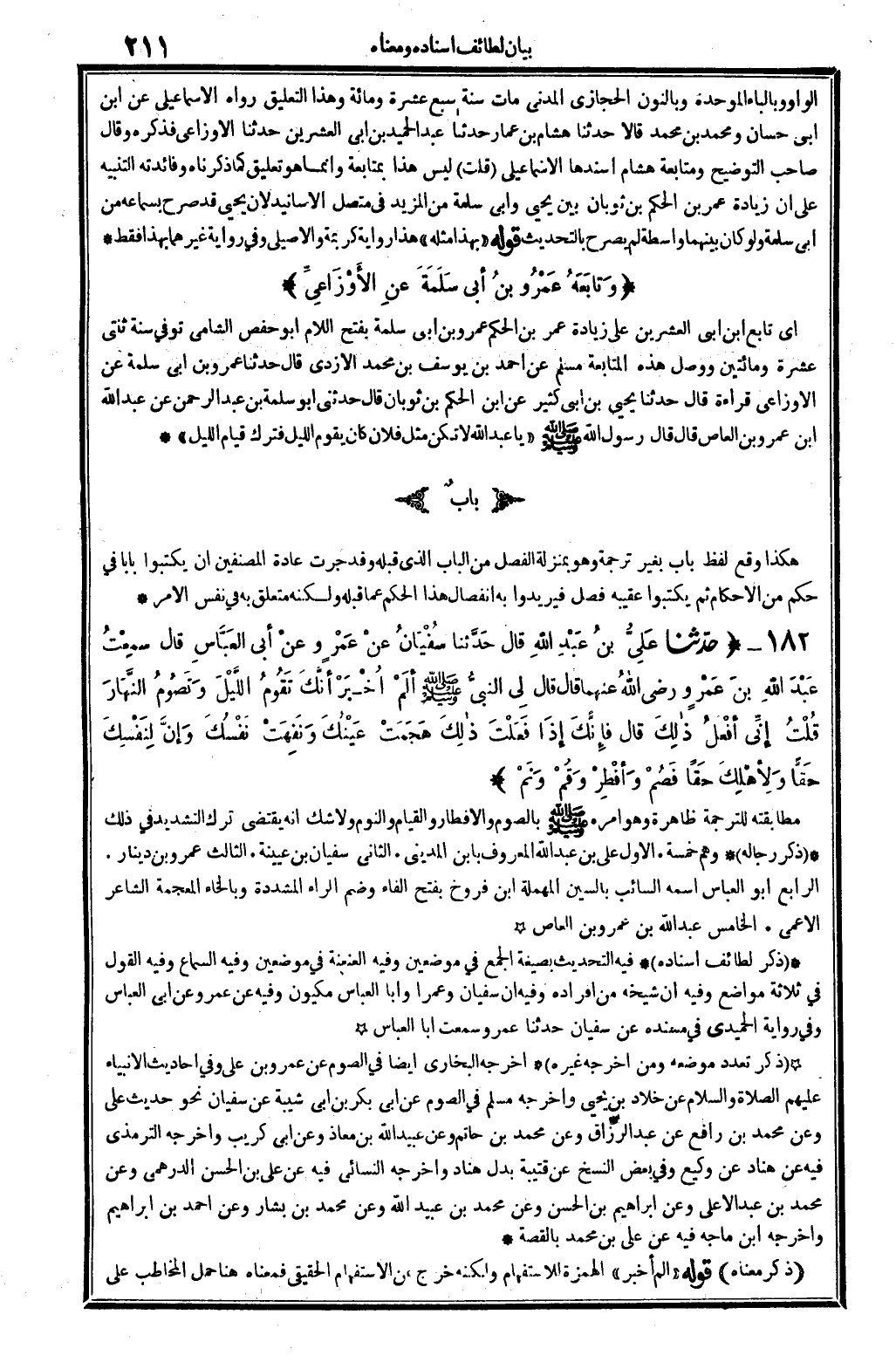 3511 - حدَّثنا عَلِيُّ بنُ عَبْدِ الله قَالَ حدَّثنا سُفْيَانُ عَنْ عَمْرٍ وعنْ أبِي العَبَّاسِ قَالَ سَمِعْتُ عَبْدَ الله بنَ عَمْرٍ وَرَضي الله تَعَالَى عَنْهُمَا قَالَ قَالَ لي النبيُّ صلى الله عَلَيْهِ وَسلم ألَمْ أُخْبَرْ أنَّكَ تَقُومُ اللَّيْلَ وَتَصُومُ النَّهَارَ قُلْتُ إنِّي أفْعلُ ذالِكَ قَالَ فإنَّكَ إذَا فَعَلْتَ ذالِكَ هَجَمَتْ عَيْنُكَ وَنَفِهَتْ نَفْسُكَ وَإنَّ لِنَفْسِكَ حقَّا وَلأِهْلِكَ حَقّا فَصُمْ وَأفْطِرْ وَقُمْ ونَمْ..