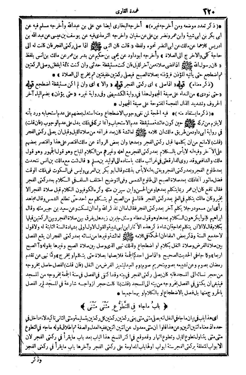 ذكر تعدد مَوْضِعه وَمن أخرجه غَيره: أخرجه البُخَارِيّ أَيْضا عَن عَليّ بن عبد الله. وَأخرجه مُسلم فِيهِ عَن أبي بكر بن أبي شيبَة وَابْن عمر ونضر بن عَليّ سُفْيَان. وَأخرجه التِّرْمِذِيّ فِيهِ عَن يُوسُف بن عِيسَى عَن عبد الله بن إِدْرِيس، كِلَاهُمَا عَن مَالك عَن أبي النَّضر نَحوه، وَلَفظه: (قَالَت كَانَ النَّبِي صلى الله عَلَيْهِ وَسلم إِذا صلى رَكْعَتي الْفجْر فَإِن كَانَت لَهُ إِلَيّ حَاجَة كلمني وإلاَّ خرج إِلَى الصَّلَاة) . وَأخرجه أَبُو دَاوُد عَن يحيى بن حَكِيم عَن بشر بن عمر عَن مَالك بن أنس بِلَفْظ: (كَانَ رَسُول الله صلى الله عَلَيْهِ وَسلم إِذا قضى صلَاته من آخر اللَّيْل، فَإِن كنت مستيقظة حَدثنِي، وَإِن كنت نَائِمَة إيقظني وَصلى الرَّكْعَتَيْنِ ثمَّ اضْطجع حَتَّى يَأْتِيهِ الْمُؤَذّن فيؤذنه بِصَلَاة الصُّبْح فَيصَلي رَكْعَتَيْنِ خفيفتين ثمَّ يخرج إِلَى الصَّلَاة) .