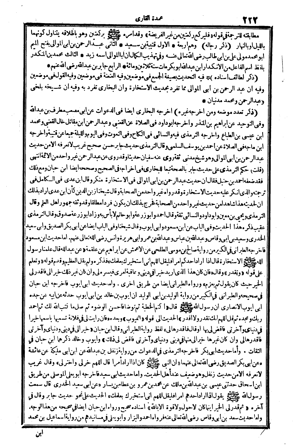 وَقَالَ التِّرْمِذِيّ: حَدِيث جَابر حسن صَحِيح غَرِيب لَا نعرفه إلاَّ من حَدِيث عبد الرَّحْمَن بن أبي الموَالِي، وَهُوَ شيخ مدنِي ثِقَة، روى عَنهُ سُفْيَان حَدِيثا، وَقد روى عَن عبد الرَّحْمَن غير وَاحِد من الْأَئِمَّة انْتهى. قلت: حكم التِّرْمِذِيّ على حَدِيث جَابر بِالصِّحَّةِ تبعا للْبُخَارِيّ فِي إِخْرَاجه فِي الصَّحِيح، وَصَححهُ أَيْضا ابْن حبَان، وَمَعَ ذَلِك فقد ضعفه أَحْمد بن حَنْبَل، فَقَالَ: إِن حَدِيث عبد الرَّحْمَن بن أبي الموَالِي فِي الاستخارة مُنكر، وَقَالَ ابْن عدي فِي (الْكَامِل) فِي تَرْجَمته: وَالَّذِي أنكر عَلَيْهِ حَدِيث الاستخارة، وَقد رَوَاهُ غير وَاحِد من الصَّحَابَة، وَقَالَ شَيخنَا زين الدّين: كَأَن ابْن عدي أَرَادَ بذلك أَن لحديثه هَذَا شَاهدا من حَدِيث غير وَاحِد من الصَّحَابَة، فَخرج بذلك أَن يكون فَردا مُطلقًا، وَقد وَثَّقَهُ جُمْهُور أهل الْعلم. وَقَالَ التِّرْمِذِيّ وَيحيى بن معِين وَأَبُو دَاوُد وَالنَّسَائِيّ: ثِقَة، وَقَالَ أَحْمد وَأَبُو زرْعَة وَأَبُو حَاتِم: لَا بَأْس بِهِ، وَزَاد أَبُو زرْعَة: صَدُوق.