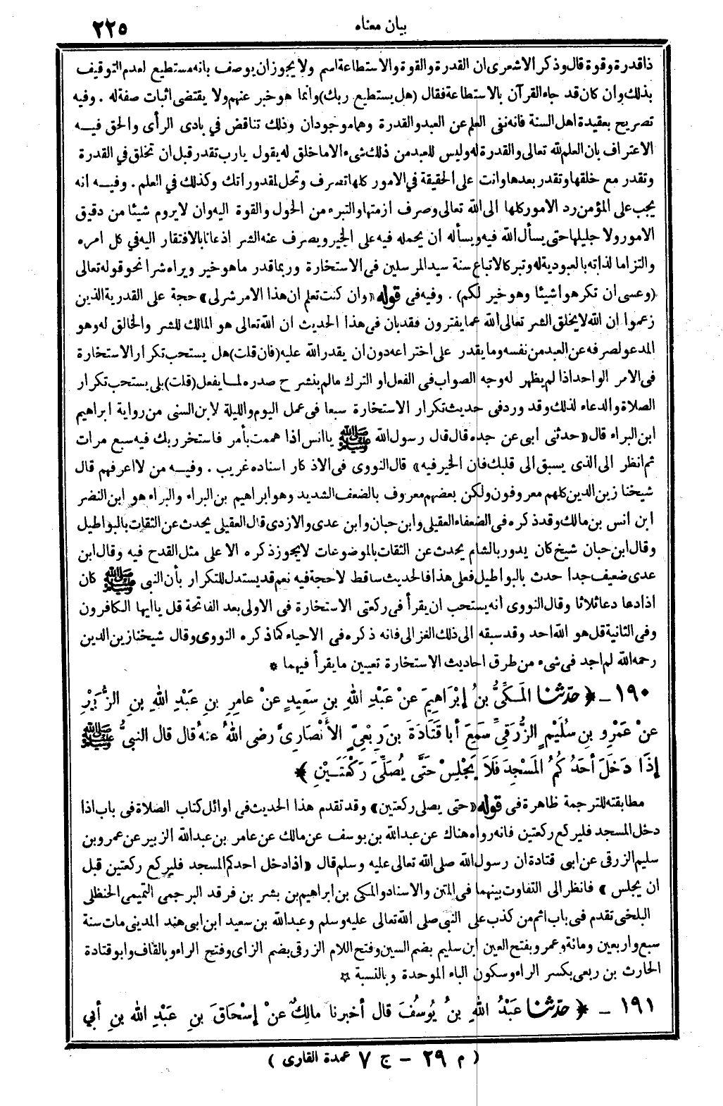ذَا قدرَة وَقُوَّة. وَقَالَ: وَذكر الْأَشْعَرِيّ أَن الْقُدْرَة وَالْقُوَّة والاستطاعة اسْم، وَلَا يجوز أَن يُوصف بِأَنَّهُ مستطيع لعدم التَّوْقِيف بذلك، وَإِن كَانَ قد جَاءَ الْقُرْآن بالاستطاعة فَقَالَ: {هَل يَسْتَطِيع رَبك} (الْمَائِدَة: 211) . وَإِنَّمَا هُوَ خبر عَنْهُم، وَلَا يَقْتَضِي إِثْبَات صفة لَهُ. وَفِيه: تَصْرِيح بعقيدة أهل السّنة، فَإِنَّهُ نفى الْعلم عَن العَبْد وَالْقُدْرَة، وهما موجودان، وَذَلِكَ تنَاقض فِي بادىء الرَّأْي، وَالْحق فِيهِ الِاعْتِرَاف بِأَن الْعلم لله تَعَالَى، وَالْقُدْرَة لَهُ، وَلَيْسَ للْعَبد من ذَلِك شَيْء إلاَّ مَا خلق لَهُ، يَقُول: يَا رب تقدر قبل أَن تخلق فِي الْقُدْرَة، وتقدر مَعَ خلقهَا، وتقدر بعْدهَا، وَأَنت على الْحَقِيقَة فِي الْأُمُور كلهَا تصرف، وَتحل لمقدوراتك، وَكَذَلِكَ فِي الْعلم. وَفِيه: أَنه يجب على الْمُؤمن رد الْأُمُور كلهَا إِلَى الله تَعَالَى وَصرف أزمتها والتبرء من الْحول وَالْقُوَّة إِلَيْهِ وَأَن لَا يروم شَيْئا من دَقِيق الْأُمُور وَلَا جليلها حَتَّى يسْأَل الله فِيهِ، ويسأله أَن يحملهُ فِيهِ على الْخَيْر، وَيصرف عَنهُ الشَّرّ إذعانا بالافتقار إِلَيْهِ فِي كل أمره، والتزاما لذاته بالعبودية لَهُ، وتبركا لاتباع سنة سيد الْمُرْسلين فِي الاستخارة، وَرُبمَا قدر مَا هُوَ خير وَيَرَاهُ شرا نَحْو قَوْله تَعَالَى: {وَعَسَى أَن تكْرهُوا شَيْئا وَهُوَ خير لكم} (الْبَقَرَة: 612) . وَفِيه فِي قَوْله: (وَإِن كنت تعلم أَن هَذَا الْأَمر شَرّ لي) حجَّة على الْقَدَرِيَّة الَّذين زَعَمُوا أَن الله لَا يخلق الشَّرّ تَعَالَى الله عَمَّا يفترون، فقد بَان فِي هَذَا الحَدِيث أَن الله تَعَالَى هُوَ الْمَالِك للشر والخالق لَهُ، وَهُوَ الْمَدْعُو لصرفه عَن العَبْد من نَفسه، وَمَا يقدر على اختراعه دون أَن يقدر الله عَلَيْهِ؟ فَإِن قلت: هَل يسْتَحبّ تكْرَار الاستخارة فِي الْأَمر الْوَاحِد إِذا لم يظْهر لَهُ وَجه الصَّوَاب فِي الْفِعْل أَو التّرْك مَا لم ينشرح صَدره لما يفعل؟ قلت: بلَى يسْتَحبّ تكْرَار الصَّلَاة وَالدُّعَاء لذَلِك، وَقد ورد فِي حَدِيث تكْرَار الاستخارة سبعا فِي عمل الْيَوْم وَاللَّيْلَة لِابْنِ السّني من رِوَايَة إِبْرَاهِيم ابْن الْبَراء، قَالَ: (حَدثنِي أبي عَن جده، قَالَ: قَالَ رَسُول الله صلى الله عَلَيْهِ وَسلم: يَا أنس إِذا هَمَمْت بِأَمْر فاستخر رَبك فِيهِ سبع مَرَّات ثمَّ انْظُر إِلَى الَّذِي يسْبق إِلَى قَلْبك، فَإِن الْخَيْر فِيهِ) . قَالَ النَّوَوِيّ: فِي (الْأَذْكَار) : إِسْنَاده غَرِيب، وَفِيه من لَا أعرفهم، قَالَ شَيخنَا زين الدّين: كلهم معروفون، وَلَكِن بَعضهم مَعْرُوف بالضعف الشَّديد وَهُوَ إِبْرَاهِيم بن الْبَراء، والبراء هُوَ ابْن النَّضر ابْن أنس بن مَالك، وَقد ذكره فِي (الضُّعَفَاء) الْعقيلِيّ وَابْن حبَان وَابْن عدي والأزدي. قَالَ الْعقيلِيّ: يحدث عَن الثِّقَات بِالْبَوَاطِيل. وَقَالَ ابْن حبَان: شيخ كَانَ يَدُور بِالشَّام يحدث عَن الثِّقَات بالموضوعات: لَا يجوز ذكره إلاَّ على مثل الْقدح فِيهِ. وَقَالَ ابْن عدي: ضَعِيف جدا، حدث بِالْبَوَاطِيل، فعلى هَذَا فَالْحَدِيث سَاقِط لَا حجَّة فِيهِ، نعم، قد يسْتَدلّ للتكرار بِأَن النَّبِي صلى الله عَلَيْهِ وَسلم كَانَ إِذا دَعَا دَعَا ثَلَاثًا، وَقَالَ النَّوَوِيّ: إِنَّه يسْتَحبّ أَن يقْرَأ فِي رَكْعَتي الإستخارة فِي الأولى بعد الْفَاتِحَة: قل يَا أَيهَا الْكَافِرُونَ، وَفِي الثَّانِيَة: قل هُوَ الله أحد، وَقد سبقه إِلَى ذَلِك الْغَزالِيّ، فَإِنَّهُ ذكره فِي الْإِحْيَاء كَمَا ذكره النَّوَوِيّ: وَقَالَ شَيخنَا زين الدّين، رَحمَه الله: لم أجد فِي شَيْء من طرق أَحَادِيث الاستخارة تعْيين مَا يقْرَأ فيهمَا.