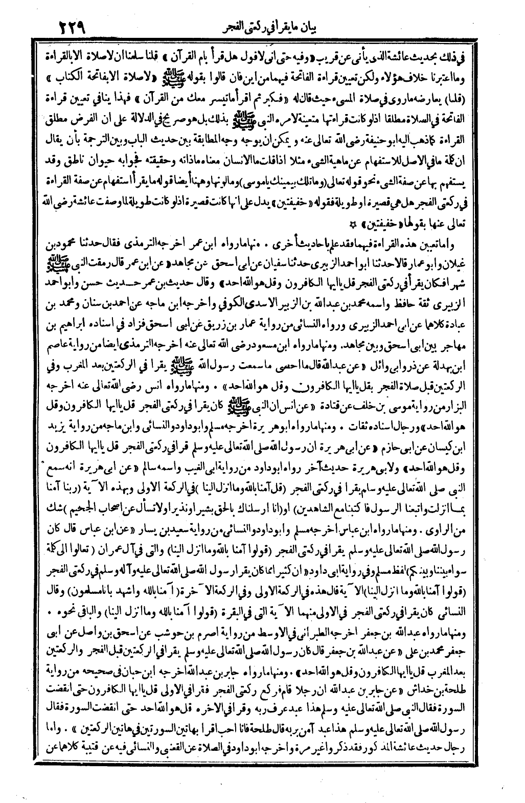 وَأما تعْيين هَذِه الْقِرَاءَة فيهمَا فقد علم بِأَحَادِيث أُخْرَى. مِنْهَا مَا رَوَاهُ ابْن عمر، أخرجه التِّرْمِذِيّ فَقَالَ: حَدثنَا مَحْمُود بن غيلَان، وَأَبُو عمار قَالَا: حَدثنَا أَبُو أَحْمد الزبيرِي حَدثنَا سُفْيَان عَن أبي إِسْحَاق عَن مُجَاهِد (عَن ابْن عمر، قَالَ: رمقت النَّبِي صلى الله عَلَيْهِ وَسلم شهرآ فَكَانَ يقْرَأ فِي رَكْعَتي الْفجْر: قل يَا أَيهَا الْكَافِرُونَ، وَقل هُوَ الله أحد) . وَقَالَ: حَدِيث ابْن عمر حَدِيث حسن، وَأَبُو أَحْمد الزبيرِي ثِقَة حَافظ، واسْمه: مُحَمَّد بن عبد الله بن الزبير الْأَسدي الْكُوفِي. وَأخرجه ابْن مَاجَه عَن أَحْمد بن سِنَان وَمُحَمّد بن عبَادَة كِلَاهُمَا عَن أبي أَحْمد الزبيرِي، وَرَوَاهُ النَّسَائِيّ من رِوَايَة عمار بن زُرَيْق عَن أبي إِسْحَاق فَزَاد فِي إِسْنَاده إِبْرَاهِيم بن مهَاجر بَين أبي إِسْحَاق وَبَين مُجَاهِد. وَمِنْهَا مَا رَوَاهُ ابْن مَسْعُود، رَضِي الله تَعَالَى عَنهُ: أخرجه التِّرْمِذِيّ أَيْضا من رِوَايَة عَاصِم ابْن بَهْدَلَة عَن ذَر وَأبي وَائِل، (عَن عبد الله قَالَ: مَا أحصي مَا سَمِعت رَسُول الله صلى الله عَلَيْهِ وَسلم يقْرَأ فِي الرَّكْعَتَيْنِ بعد الْمغرب، وَفِي الرَّكْعَتَيْنِ قبل صَلَاة الْفجْر: بقل يَا أَيهَا الْكَافِرُونَ، وَقل هُوَ الله أحد) . وَمِنْهَا مَا رَوَاهُ أنس، رَضِي الله تَعَالَى عَنهُ: أخرجه الْبَزَّار من رِوَايَة مُوسَى بن خلف عَن قَتَادَة (عَن أنس: أَن النَّبِي صلى الله عَلَيْهِ وَسلم كَانَ يقْرَأ فِي رَكْعَتي الْفجْر: قل يَا أَيهَا الْكَافِرُونَ وَقل هُوَ الله أحد) ، وَرِجَال إِسْنَاده ثِقَات. وَمِنْهَا مَا رَوَاهُ أَبُو هُرَيْرَة: أخرجه مُسلم وَأَبُو دَاوُد وَالنَّسَائِيّ وَابْن مَاجَه من رِوَايَة يزِيد ابْن كيسَان عَن أبي حَازِم (عَن أبي هُرَيْرَة: أَن رَسُول الله، صلى الله عَلَيْهِ وَسلم، قَرَأَ فِي رَكْعَتي الْفجْر: قل يَا أَيهَا الْكَافِرُونَ وَقل هُوَ الله أحد) . وَلأبي هُرَيْرَة حَدِيث آخر رَوَاهُ أَبُو دَاوُد من رِوَايَة أبي الْغَيْب، واسْمه: سَالم، (عَن أبي هُرَيْرَة: أَنه سمع النَّبِي، صلى الله عَلَيْهِ وَسلم، يقْرَأ فِي رَكْعَتي الْفجْر: {قل آمنا بِاللَّه وَمَا أنزل إِلَيْنَا} (آل عمرَان: 48) . فِي الرَّكْعَة الأولى وبهذه الْآيَة {رَبنَا آمنا بِمَا أنزلت وَاتَّبَعنَا الرَّسُول فاكتبنا مَعَ الشَّاهِدين} (آل عمرَان: 35) . أَو {إِنَّا أَرْسَلْنَاك بِالْحَقِّ بشيرا وَنَذِيرا وَلَا تسْأَل عَن أَصْحَاب الْجَحِيم} (الْبَقَرَة: 911 وفاطر: 42) . شكّ من الرَّاوِي. وَمِنْهَا مَا رَوَاهُ ابْن عَبَّاس: أخرجه مُسلم وَأَبُو دَاوُد وَالنَّسَائِيّ من رِوَايَة سعيد بن يسَار (عَن ابْن عَبَّاس، قَالَ: كَانَ رَسُول الله، صلى الله عَلَيْهِ وَسلم، يقْرَأ فِي رَكْعَتي الْفجْر: {قُولُوا آمنا بِاللَّه وَمَا أنزل إِلَيْنَا} (الْبَقَرَة: 631) . وَالَّتِي فِي آل عمرَان: {تَعَالَوْا إِلَى كلمة سَوَاء بَيْننَا وَبَيْنكُم} (آل عمرَان: 46) . لفظ مُسلم وَفِي رِوَايَة أبي دَاوُد (إِن كثيرا مِمَّا كَانَ يقْرَأ رَسُول الله، صلى الله عَلَيْهِ وَسلم، فِي رَكْعَتي الْفجْر {قُولُوا آمنا بِاللَّه وَمَا أنزل إِلَيْنَا} (الْبَقَرَة: 631) . الْآيَة، قَالَ: هَذِه فِي الرَّكْعَة الأولى، وَفِي الرَّكْعَة الْآخِرَة: {آمنا بِاللَّه وَأشْهد بِأَنا مُسلمُونَ} (آل عمرَان: 252 والمائدة: 111) . وَقَالَ النَّسَائِيّ: كَانَ يقْرَأ فِي رَكْعَتي الْفجْر فِي الأولى مِنْهُمَا الْآيَة الَّتِي فِي الْبَقَرَة: {قُولُوا آمنا بِاللَّه وَمَا أنزل إِلَيْنَا} (الْبَقَرَة: 631) . وَالْبَاقِي نَحوه. وَمِنْهَا مَا رَوَاهُ عبد الله بن جَعْفَر: أخرجه الطَّبَرَانِيّ فِي (الْأَوْسَط) من رِوَايَة أَصْرَم بن حَوْشَب عَن إِسْحَاق بن وَاصل عَن أبي جَعْفَر مُحَمَّد بن عَليّ (عَن عبد الله بن جَعْفَر، قَالَ: كَانَ رَسُول الله، 