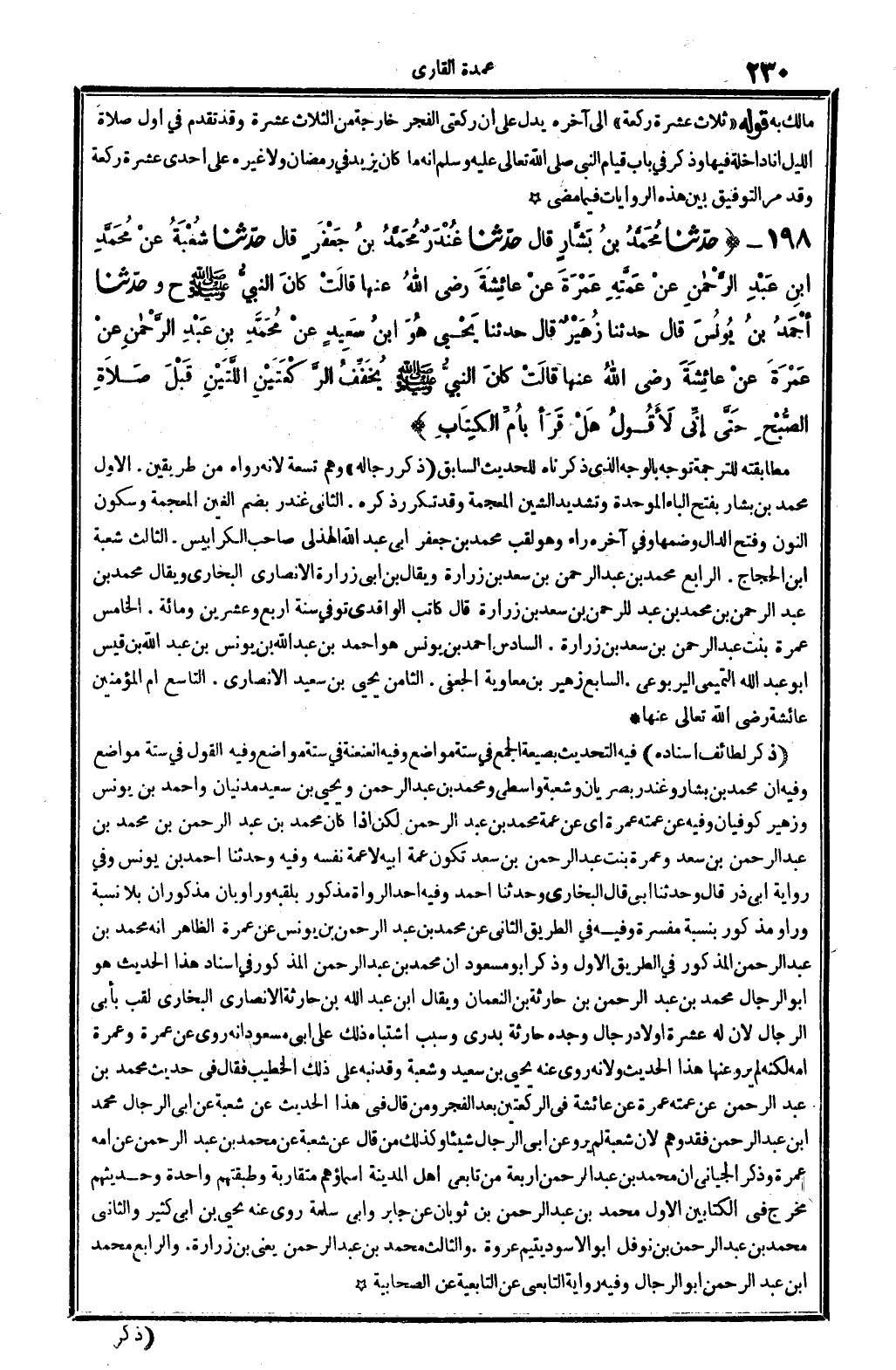 ذكر لطائف إِسْنَاده: فِيهِ: التحديث بِصِيغَة الْجمع فِي سِتَّة مَوَاضِع. وَفِيه العنعنة فِي سِتَّة مَوَاضِع وَفِيه: القَوْل فِي سِتَّة مَوَاضِع. وَفِيه: أَن مُحَمَّد بن بشار وغندر بصريان، وَشعْبَة واسطي، وَمُحَمّد بن عبد الرَّحْمَن وَيحيى بن سعيد مدنيان، وَأحمد بن يُونُس وَزُهَيْر كوفيان. وَفِيه: عَن عمته عمْرَة أَي: عَن عمَّة مُحَمَّد بن عبد الرَّحْمَن بن مُحَمَّد بن عبد الرَّحْمَن بن سعد، وَعمرَة بنت عبد الرَّحْمَن بن سعد، تكون عمَّة أَبِيه لَا عمَّة نَفسه. وَفِيه: وَحدثنَا أَحْمد بن يُونُس، وَفِي رِوَايَة أبي ذَر، قَالَ: وَحدثنَا أبي، قَالَ البُخَارِيّ: وَحدثنَا أَحْمد، وَفِيه أحد الروَاة مَذْكُور بلقبه، وراويان مذكوران بِلَا نِسْبَة، وراو مَذْكُور بِنِسْبَة مفسرة. وَفِيه: فِي الطَّرِيق الثَّانِي: عَن مُحَمَّد بن عبد الرَّحْمَن بن يُونُس عَن عمْرَة، الظَّاهِر أَنه مُحَمَّد بن عبد الرَّحْمَن الْمَذْكُور فِي الطَّرِيق الأول، وَذكر أَبُو مَسْعُود أَن مُحَمَّد بن عبد الرَّحْمَن الْمَذْكُور فِي إِسْنَاد هَذَا الحَدِيث هُوَ أَبُو الرِّجَال مُحَمَّد بن عبد الرَّحْمَن بن حَارِثَة بن النُّعْمَان، وَيُقَال: ابْن عبد الله بن حَارِثَة الْأنْصَارِيّ البُخَارِيّ، لقب بِأبي الرِّجَال لِأَن لَهُ عشرَة أَوْلَاد رجال، وجده حَارِثَة بَدْرِي، وَسبب اشْتِبَاه ذَلِك على أبي مَسْعُود أَنه روى عَن عمْرَة، وَعمرَة أمه، لكنه لم يرو عَنْهَا هَذَا الحَدِيث، وَلِأَنَّهُ روى عَنهُ يحيى بن سعيد، وَشعْبَة وَقد نبه على ذَلِك الْخَطِيب، فَقَالَ فِي حَدِيث مُحَمَّد بن عبد الرَّحْمَن عَن عمته عمْرَة عَن عَائِشَة فِي الرَّكْعَتَيْنِ بعد الْفجْر وَمن قَالَ فِي هَذَا الحَدِيث: عَن شُعْبَة عَن أبي الرِّجَال مُحَمَّد ابْن عبد الرَّحْمَن فقد وهم، لِأَن شُعْبَة لم يرو عَن أبي الرِّجَال شَيْئا، وَكَذَلِكَ من قَالَ عَن شُعْبَة عَن مُحَمَّد بن عبد الرَّحْمَن عَن أمه عمْرَة، وَذكر الجياني أَن مُحَمَّد بن عبد الرَّحْمَن أَرْبَعَة من تَابِعِيّ أهل الْمَدِينَة، اسماؤهم مُتَقَارِبَة وطبقتهم وَاحِدَة وحديثهم مخرج فِي الْكِتَابَيْنِ: الأول: مُحَمَّد بن عبد الرَّحْمَن بن ثَوْبَان عَن جَابر، وَأبي سَلمَة، روى عَنهُ يحيى بن أبي كثير. وَالثَّانِي: مُحَمَّد بن عبد الرَّحْمَن بن نَوْفَل، أَبُو الْأسود يَتِيم عُرْوَة. وَالثَّالِث: مُحَمَّد بن عبد الرَّحْمَن، يَعْنِي ابْن زُرَارَة. وَالرَّابِع: مُحَمَّد ابْن عبد الرَّحْمَن أَبُو الرِّجَال. وَفِيه: رِوَايَة التَّابِعِيّ عَن التابعية عَن الصحابية.