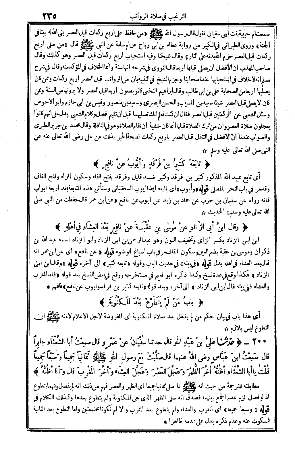 سَمِعت أم حَبِيبَة بنت أبي سُفْيَان تَقول قَالَ رَسُول الله صلى الله عَلَيْهِ وَسلم (من حَافظ على أَربع رَكْعَات قبل الْعَصْر بنى الله لَهُ بَيْتا فِي الْجنَّة) ، وروى الطَّبَرَانِيّ فِي (الْكَبِير) من رِوَايَة عَطاء بن أبي رَبَاح عَن أم سَلمَة عَن النَّبِي صلى الله عَلَيْهِ وَسلم قَالَ: (من صلى أَربع رَكْعَات قبل الْعَصْر حرم الله بدنه على النَّار) ، وَقَالَ شَيخنَا: وَفِيه اسْتِحْبَاب أَربع رَكْعَات قبل الْعَصْر، وَهُوَ كَذَلِك، وَقَالَ صَاحب (الْمُهَذّب) : إِن الْأَفْضَل أَن يُصَلِّي قبلهَا أَرْبعا، قَالَ النَّوَوِيّ فِي (شَرحه) : إِنَّهَا سنة، وَإِنَّمَا الْخلاف فِي الْمُؤَكّد مِنْهُ. وَقَالَ فِي (شرح مُسلم) : إِنَّه لَا خلاف فِي استحبابها عِنْد أَصْحَابنَا، وَجزم الشَّيْخ فِي التَّنْبِيه بِأَن من الرَّوَاتِب قبل الْعَصْر أَربع رَكْعَات، وَمِمَّنْ كَانَ يُصليهَا أَرْبعا من الصَّحَابَة: عَليّ بن أبي طَالب، وَقَالَ إِبْرَاهِيم النَّخعِيّ: كَانُوا يصلونَ أَرْبعا قبل الْعَصْر، وَلَا يرونها من السّنة، وَمِمَّنْ كَانَ لَا يُصَلِّي قبل الْعَصْر شَيْئا: سعيد بن الْمسيب وَالْحسن الْبَصْرِيّ وَسَعِيد بن مَنْصُور وَقيس بن أبي حَازِم وَأَبُو الْأَحْوَص، وَسُئِلَ الشّعبِيّ عَن الرَّكْعَتَيْنِ قبل الْعَصْر؟ فَقَالَ: إِن كنت تعلم أَنَّك تصليهما قبل أَن تقيم فصل، وَكَلَام الشّعبِيّ يدل على أَنهم كَانُوا يعجلون صَلَاة الْعَصْر، وَأَن من ترك الصَّلَاة قبلهَا إِنَّمَا كَانَ خشيَة أَن تُقَام الصَّلَاة وَهُوَ فِي النَّافِلَة، وَقَالَ مُحَمَّد بن جرير الطَّبَرِيّ: وَالصَّوَاب عندنَا أَن الْأَفْضَل فِي التَّنَفُّل قبل الْعَصْر بِأَرْبَع رَكْعَات لصِحَّة الْخَبَر بذلك عَن عَليّ، رَضِي الله تَعَالَى عَنهُ، عَن النَّبِي، صلى الله عَلَيْهِ وَسلم.