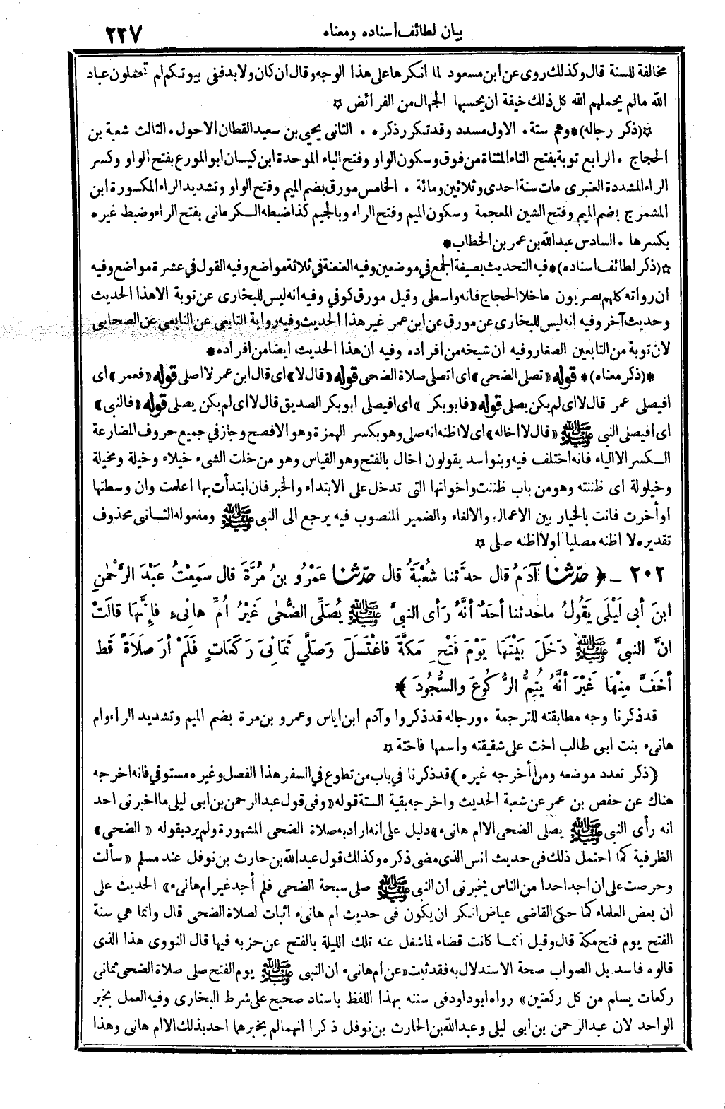 202 - (حَدثنَا آدم قَالَ حَدثنَا شُعْبَة قَالَ حَدثنَا عَمْرو بن مرّة قَالَ سَمِعت عبد الرَّحْمَن ابْن أبي ليلى يَقُول مَا حَدثنَا أحد أَنه رأى النَّبِي - صَلَّى اللَّهُ عَلَيْهِ وَسَلَّم َ - يُصَلِّي الضُّحَى غير أم هانىء فَإِنَّهَا قَالَت أَن النَّبِي - صَلَّى اللَّهُ عَلَيْهِ وَسَلَّم َ - دخل بَيتهَا يَوْم فتح مَكَّة فاغتسل وَصلى ثَمَانِي رَكْعَات فَلم أر صَلَاة قطّ أخف مِنْهَا غير أَنه يتم الرُّكُوع وَالسُّجُود) قد ذكرنَا وَجه مطابقته للتَّرْجَمَة. وَرِجَاله قد ذكرُوا وآدَم ابْن إِيَاس وَعَمْرو بن مرّة بِضَم الْمِيم وَتَشْديد الرَّاء وَأم هانىء بنت أبي طَالب أُخْت عَليّ شقيقته وَاسْمهَا فَاخِتَة (ذكر تعدد مَوْضِعه وَمن أخرجه غَيره) قد ذكرنَا فِي بَاب من تطوع فِي السّفر هَذَا الْفَصْل وَغير مُسْتَوفى فَإِنَّهُ أخرجه هُنَاكَ عَن حَفْص بن عمر عَن شُعْبَة الحَدِيث وَأخرجه بَقِيَّة السِّتَّة قَوْله " وَفِي قَول عبد الرَّحْمَن بن أبي ليلى مَا أَخْبرنِي أحد أَنه رأى النَّبِي - صَلَّى اللَّهُ عَلَيْهِ وَسَلَّم َ - يُصَلِّي الضُّحَى إِلَّا أم هانىء " دَلِيل على أَنه أَرَادَ بِهِ صَلَاة الضُّحَى الْمَشْهُورَة وَلم يرد بقوله " الضُّحَى " الظَّرْفِيَّة كَمَا احْتمل ذَلِك فِي حَدِيث أنس الَّذِي مضى ذكره وَكَذَلِكَ قَول عبد الله بن حَارِث بن نَوْفَل عِنْد مُسلم " سَأَلت وحرصت على أَن أجد أحدا من النَّاس يُخْبِرنِي أَن النَّبِي - صَلَّى اللَّهُ عَلَيْهِ وَسَلَّم َ - صلى سبْحَة الضُّحَى فَلم أجد غير أم هانىء " الحَدِيث على أَن بعض الْعلمَاء كَمَا حكى القَاضِي عِيَاض أنكر أَن يكون فِي حَدِيث أم هانىء إِثْبَات لصَلَاة الضُّحَى قَالَ وَإِنَّمَا هِيَ سنة الْفَتْح يَوْم فتح مَكَّة قَالَ وَقيل إِنَّمَا كَانَت قَضَاء لما شغل عَنهُ تِلْكَ اللَّيْلَة بِالْفَتْح عَن حزبه فِيهَا قَالَ النَّوَوِيّ هَذَا الَّذِي قَالُوهُ فَاسد بل الصَّوَاب صِحَة الِاسْتِدْلَال بِهِ فقد ثَبت " عَن أم هانىء أَن النَّبِي - صَلَّى اللَّهُ عَلَيْهِ وَسَلَّم َ - يَوْم الْفَتْح صلى صَلَاة الضُّحَى ثَمَانِي رَكْعَات يسلم من كل رَكْعَتَيْنِ " رَوَاهُ أَبُو دَاوُد فِي سنَنه بِهَذَا اللَّفْظ بِإِسْنَاد صَحِيح على شَرط البُخَارِيّ وَفِيه الْعَمَل بِخَبَر الْوَاحِد لِأَن عبد الرَّحْمَن بن أبي ليلى وَعبد الله بن الْحَارِث بن نَوْفَل ذكرا أَنَّهُمَا لم يخبرهما أحد بذلك إِلَّا أم هانىء وَهَذَا