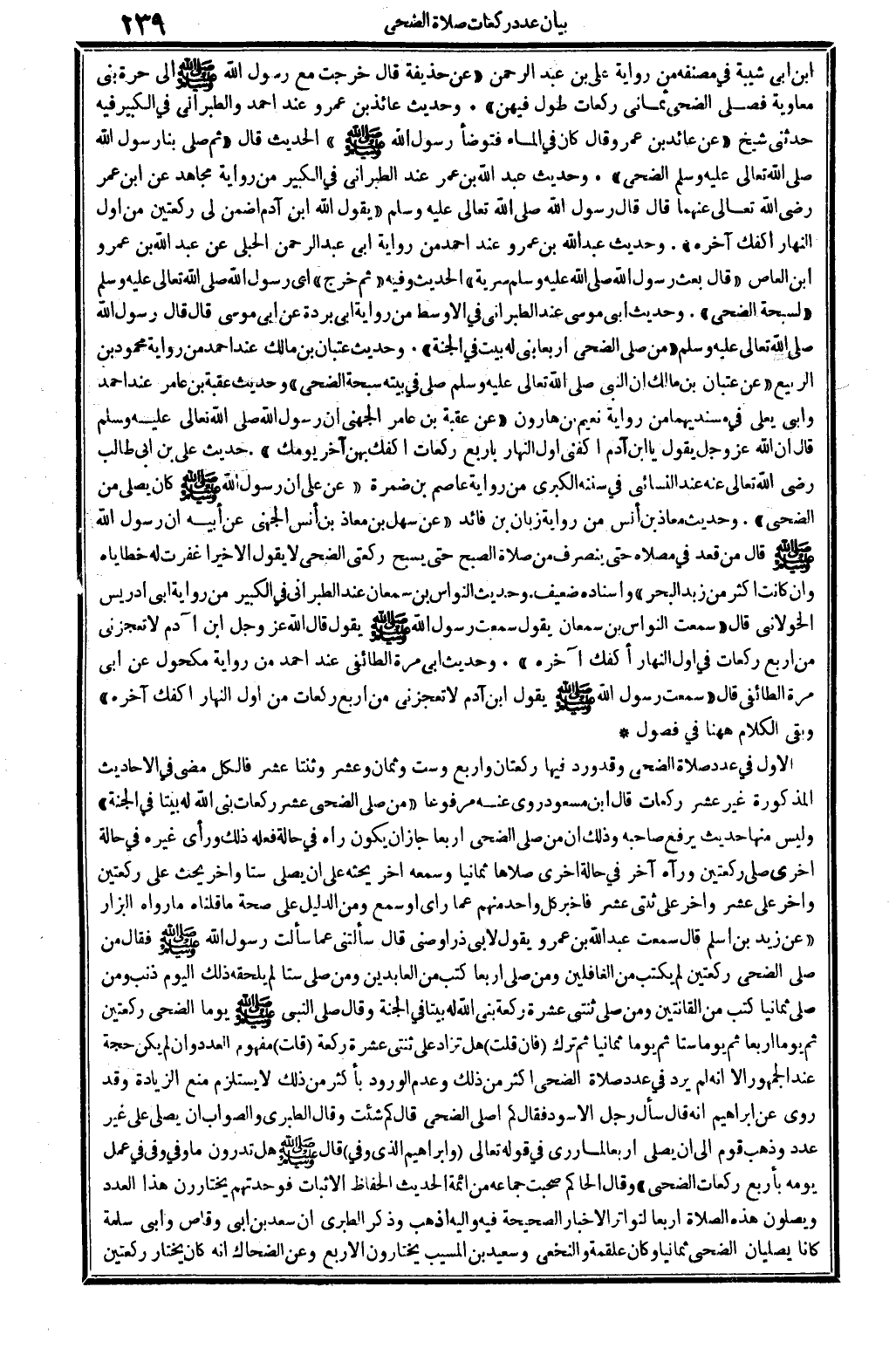 ابْن أبي شيبَة فِي مُصَنفه من رِوَايَة عَليّ بن عبد الرَّحْمَن " عَن حُذَيْفَة قَالَ خرجت مَعَ رَسُول الله - صَلَّى اللَّهُ عَلَيْهِ وَسَلَّم َ - إِلَى حرَّة بني مُعَاوِيَة فصلى الضُّحَى ثَمَانِي رَكْعَات طول فِيهِنَّ ". وَحَدِيث عَائِذ بن عَمْرو عِنْد أَحْمد وَالطَّبَرَانِيّ فِي الْكَبِير فِيهِ حَدثنِي شيخ " عَن عَائِذ بن عَمْرو قَالَ كَانَ فِي المَاء فَتَوَضَّأ رَسُول الله - صَلَّى اللَّهُ عَلَيْهِ وَسَلَّم َ - " الحَدِيث قَالَ " ثمَّ صلى بِنَا رَسُول الله - صَلَّى اللَّهُ عَلَيْهِ وَسَلَّم َ - الضُّحَى ". وَحَدِيث عبد الله بن عمر عِنْد الطَّبَرَانِيّ فِي الْكَبِير من رِوَايَة مُجَاهِد عَن ابْن عمر رَضِي الله تَعَالَى عَنْهُمَا قَالَ قَالَ رَسُول الله - صَلَّى اللَّهُ عَلَيْهِ وَسَلَّم َ - " يَقُول الله ابْن آدم اضمن لي رَكْعَتَيْنِ من أول النَّهَار أكفك آخِره ". وَحَدِيث عبد الله بن عَمْرو عِنْد أَحْمد من رِوَايَة أبي عبد الرَّحْمَن الحبلي عَن عبد الله بن عَمْرو بن الْعَاصِ " قَالَ بعث رَسُول الله - صَلَّى اللَّهُ عَلَيْهِ وَسَلَّم َ - سَرِيَّة " الحَدِيث وَفِيه " ثمَّ خرج " أَي رَسُول الله - صَلَّى اللَّهُ عَلَيْهِ وَسَلَّم َ - " لسبحة الضُّحَى ". وَحَدِيث أبي مُوسَى عِنْد الطَّبَرَانِيّ فِي الْأَوْسَط من رِوَايَة أبي بردة عَن أبي مُوسَى قَالَ قَالَ رَسُول الله - صَلَّى اللَّهُ عَلَيْهِ وَسَلَّم َ - " من صلى الضُّحَى أَرْبعا بني لَهُ بَيت فِي الْجنَّة ". وَحَدِيث عتْبَان بن مَالك عِنْد أَحْمد من رِوَايَة مَحْمُود بن الرّبيع " عَن عتْبَان بن مَالك أَن النَّبِي - صَلَّى اللَّهُ عَلَيْهِ وَسَلَّم َ - صلى فِي بَيته سبْحَة الضُّحَى " وَحَدِيث عقبَة بن عَامر عِنْد أَحْمد وَأبي يعلى فِي مسنديهما من رِوَايَة نعيم بن هَارُون " عَن عقبَة بن عَامر الْجُهَنِيّ أَن رَسُول الله - صَلَّى اللَّهُ عَلَيْهِ وَسَلَّم َ - قَالَ إِن الله عز وَجل يَقُول يَا ابْن آدم اكْفِنِي أول النَّهَار بِأَرْبَع رَكْعَات أكفك بِهن آخر يَوْمك ". حَدِيث عَليّ بن أبي طَالب رَضِي الله تَعَالَى عَنهُ عِنْد النَّسَائِيّ فِي سنَنه الْكُبْرَى من رِوَايَة عَاصِم بن ضَمرَة " عَن عَليّ أَن رَسُول الله - صَلَّى اللَّهُ عَلَيْهِ وَسَلَّم َ - كَانَ يُصَلِّي من الضُّحَى ". وَحَدِيث معَاذ بن أنس من رِوَايَة زبان بن فائد " عَن سهل بن معَاذ بن أنس الْجُهَنِيّ عَن أَبِيه أَن رَسُول الله - صَلَّى اللَّهُ عَلَيْهِ وَسَلَّم َ - قَالَ من قعد فِي مُصَلَّاهُ حَتَّى ينْصَرف من صَلَاة الصُّبْح حَتَّى يسبح رَكْعَتي الضُّحَى لَا يَقُول إِلَّا خيرا غفرت لَهُ خطاياه وَإِن كَانَت أَكثر من زبد الْبَحْر " وَإِسْنَاده ضَعِيف. وَحَدِيث النواس بن سمْعَان عِنْد الطَّبَرَانِيّ فِي الْكَبِير من رِوَايَة أبي إِدْرِيس الْخَولَانِيّ قَالَ " سَمِعت النواس بن سمْعَان يَقُول سَمِعت رَسُول الله - صَلَّى اللَّهُ عَلَيْهِ وَسَلَّم َ - يَقُول قَالَ الله عز وَجل ابْن آدم لَا تعجزني من أَربع رَكْعَات فِي أول النَّهَار أكفك آخِره ". وَحَدِيث أبي مرّة الطَّائِفِي عِنْد أَحْمد من رِوَايَة مَكْحُول عَن أبي مرّة الطَّائِفِي قَالَ " سَمِعت رَسُول الله - صَلَّى اللَّهُ عَلَيْهِ وَسَلَّم َ - ابْن آدم لَا تعجزني من أَربع رَكْعَات من أول النَّهَار أكفك آخِره " وَبَقِي الْكَلَام هَهُنَا فِي فُصُول الأول فِي عدد صَلَاة الضُّحَى وَقد ورد فِيهَا رَكْعَتَانِ وَأَرْبع وست وثمان وَعشر وثنتا عشر فَالْكل مضى فِي الْأَحَادِيث الْمَذْكُورَة غير عشر رَكْعَات قَالَ ابْن مَسْعُود رُوِيَ عَنهُ مَرْفُوعا " من صلى الضُّحَى عشر رَكْعَات بنى الله لَهُ بَيْتا فِي الْجنَّة " وَلَيْسَ مِنْهَا حَدِيث يرفع صَاحبه وَذَلِكَ أَن من صلى الضُّحَى أَرْبعا جَازَ أَن يكون رَآهُ فِي حَالَة فعله ذَلِك وَرَأى غَيره فِي حَالَة أُخْرَى صلى رَكْعَتَيْنِ وَرَآهُ آخر فِي حَالَة أُخْر