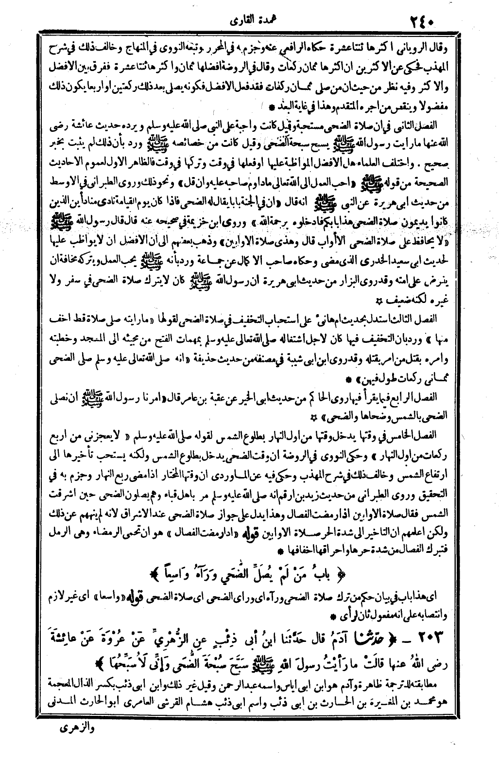 203 - (حَدثنَا آدم قَالَ حَدثنَا ابْن أبي ذِئْب عَن الزُّهْرِيّ عَن عُرْوَة عَن عَائِشَة رَضِي الله عَنْهَا قَالَت مَا رَأَيْت رَسُول الله - صَلَّى اللَّهُ عَلَيْهِ وَسَلَّم َ - سبح سبْحَة الضُّحَى وَإِنِّي لأسبحها) مطابقته للتَّرْجَمَة ظَاهِرَة وآدَم هُوَ ابْن أبي إِيَاس واسْمه عبد الرَّحْمَن وَقيل غير ذَلِك وَابْن أبي ذِئْب بِكَسْر الذَّال الْمُعْجَمَة هُوَ مُحَمَّد بن الْمُغيرَة بن الْحَارِث بن أبي ذِئْب وَاسم أبي ذِئْب هِشَام الْقرشِي العامري أَبُو الْحَارِث الْمدنِي