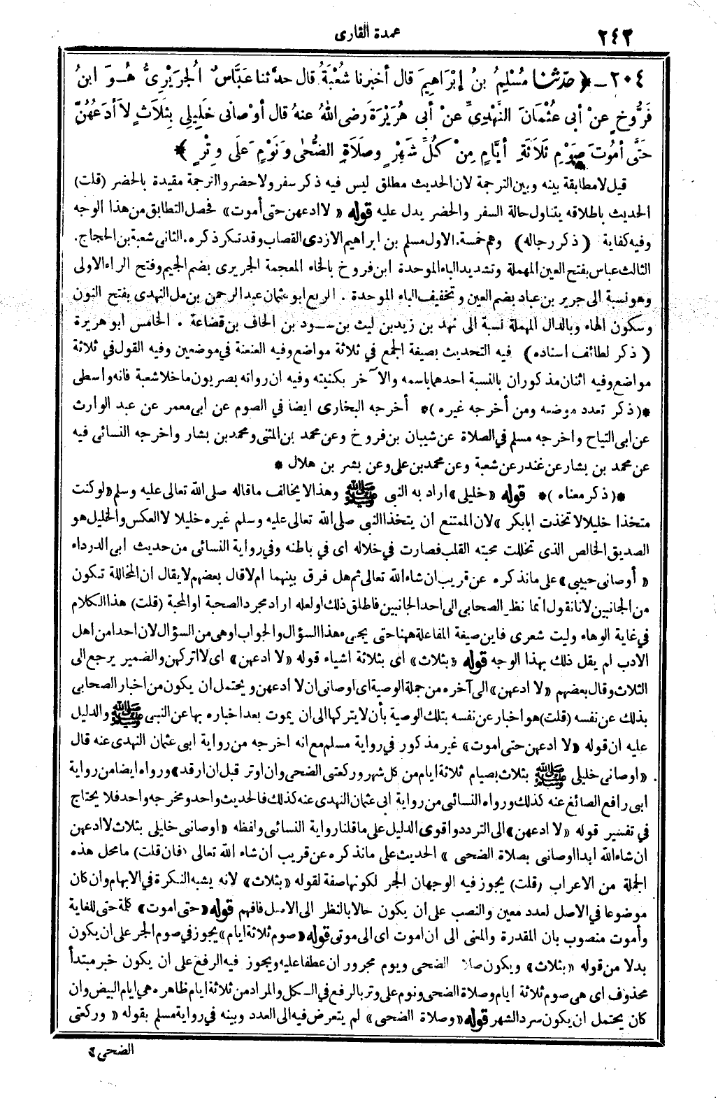 204 - (حَدثنَا مُسلم بن إِبْرَاهِيم قَالَ أخرنا شُعْبَة قَالَ حَدثنَا عَبَّاس الْجريرِي هُوَ ابْن فروخ عَن أبي عُثْمَان النَّهْدِيّ عَن أبي هُرَيْرَة رَضِي الله عَنهُ قَالَ أَوْصَانِي خليلي بِثَلَاث لَا أدعهن حَتَّى أَمُوت صَوْم ثَلَاثَة أَيَّام من كل شهر وَصَلَاة الضُّحَى ونوم على وتر) قيل لَا مُطَابقَة بَينه وَبَين التَّرْجَمَة لِأَن الحَدِيث مُطلق لَيْسَ فِيهِ ذكر سفر وَلَا حضر والترجمة مُقَيّدَة بالحضر (قلت) الحَدِيث بِإِطْلَاقِهِ يتَنَاوَل حَالَة السّفر والحضر يدل عَلَيْهِ قَوْله " لَا أدعهن حَتَّى أَمُوت " فَحصل التطابق من هَذَا الْوَجْه وَفِيه كِفَايَة (ذكر رِجَاله) وهم خَمْسَة. الأول مُسلم بن إِبْرَاهِيم الْأَزْدِيّ القصاب وَقد تكَرر ذكره. الثَّانِي شُعْبَة بن الْحجَّاج. الثَّالِث عَبَّاس بِفَتْح الْعين الْمُهْملَة وَتَشْديد الْبَاء الْمُوَحدَة ابْن فروخ بِالْخَاءِ الْمُعْجَمَة الْجريرِي بِضَم الْجِيم وَفتح الرَّاء الأولى وَهُوَ نِسْبَة إِلَى جرير بن عباد بِضَم الْعين وَتَخْفِيف الْبَاء الْمُوَحدَة. الرَّابِع أَبُو عُثْمَان عبد الرَّحْمَن بن مل النَّهْدِيّ بِفَتْح النُّون وَسُكُون الْهَاء وبالدال الْمُهْملَة نِسْبَة إِلَى نهد بن زيد بن لَيْث بن سود بن الحاف بن قضاعة. الْخَامِس أَبُو هُرَيْرَة (ذكر لطائف إِسْنَاده) فِيهِ التحديث بِصِيغَة الْجمع فِي ثَلَاثَة مَوَاضِع وَفِيه العنعنة فِي موضِعين وَفِيه القَوْل فِي ثَلَاثَة مَوَاضِع وَفِيه اثْنَان مذكوران بِالنِّسْبَةِ أَحدهمَا باسمه وَالْآخر بكنيته وَفِيه أَن رُوَاته بصريون مَا خلا شُعْبَة فَإِنَّهُ واسطي (ذكر تعدد مَوْضِعه وَمن أخرجه غَيره) أخرجه البُخَارِيّ أَيْضا فِي الصَّوْم عَن أبي معمر عَن عبد الْوَارِث عَن أبي التياح وَأخرجه مُسلم فِي الصَّلَاة عَن شَيبَان بن فروخ وَعَن مُحَمَّد بن الْمثنى وَمُحَمّد بن بشار وَأخرجه النَّسَائِيّ فِيهِ عَن مُحَمَّد بن بشار عَن غنْدر عَن شُعْبَة وَعَن مُحَمَّد بن عَليّ وَعَن بشر بن هِلَال. (ذكر مَعْنَاهُ) قَوْله " خليلي " أَرَادَ بِهِ النَّبِي - صَلَّى اللَّهُ عَلَيْهِ وَسَلَّم َ - وَهَذَا لَا يُخَالف مَا قَالَه - صَلَّى اللَّهُ عَلَيْهِ وَسَلَّم َ - " لَو كنت متخذا خَلِيلًا لاتخذت أَبَا بكر " لِأَن الْمُمْتَنع أَن يتَّخذ النَّبِي - صَلَّى اللَّهُ عَلَيْهِ وَسَلَّم َ - غَيره خَلِيلًا لَا الْعَكْس والخليل هُوَ الصّديق الْخَالِص الَّذِي تخللت محبته الْقلب فَصَارَت فِي خلاله أَي فِي بَاطِنه وَفِي رِوَايَة النَّسَائِيّ من حَدِيث أبي الدَّرْدَاء " أَوْصَانِي حَبِيبِي " على مَا نذكرهُ عَن قريب إِن شَاءَ الله تَعَالَى ثمَّ هَل فرق بَينهمَا أم لَا قَالَ بَعضهم لَا يُقَال أَن المخاللة تكون من الْجَانِبَيْنِ لأَنا نقُول إِنَّمَا نظر الصَّحَابِيّ إِلَى أحد الْجَانِبَيْنِ فَأطلق ذَلِك أَو لَعَلَّه أَرَادَ مُجَرّد الصُّحْبَة أَو الْمحبَّة (قلت) هَذَا الْكَلَام فِي غَايَة الوهاء وليت شعري فَأَيْنَ صِيغَة المفاعلة هَهُنَا حَتَّى يَجِيء هَذَا السُّؤَال وَالْجَوَاب أَو هِيَ من السُّؤَال لِأَن أحدا من أهل الْأَدَب لم يق لذَلِك بِهَذَا الْوَجْه قَوْله " بِثَلَاث " أَي بِثَلَاثَة أَشْيَاء قَوْله " لَا أدعهن " أَي لَا أتركهن وَالضَّمِير يرجع إِلَى الثَّلَاث وَقَالَ بَعضهم " لَا أدعهن " إِلَى آخِره من جملَة الْوَصِيَّة أَي أَوْصَانِي أَن لَا أدعهن وَيحْتَمل أَن يكون من أَخْبَار الصَّحَابِيّ بذلك عَن نَفسه (قلت) هُوَ إِخْبَار عَن نَفسه بِتِلْكَ الْوَصِيَّة بِأَن لَا يَتْرُكهَا إِلَى أَن يَمُوت بعد إخْبَاره بهَا عَن النَّبِي - صَلَّى اللَّهُ عَلَيْهِ وَسَلَّم َ - وَالدَّلِيل عَلَيْهِ أَن قَوْله " لَا أدعهن حَتَّى أَمُوت " غير مَذْكُور فِي رِوَايَة مُسلم مَعَ أَنه أخرجه من رِوَايَة أبي عُثْمَان النَّهْدِيّ عَنهُ قَالَ " أَوْصَانِي خليلي - صَلَّى اللَ
