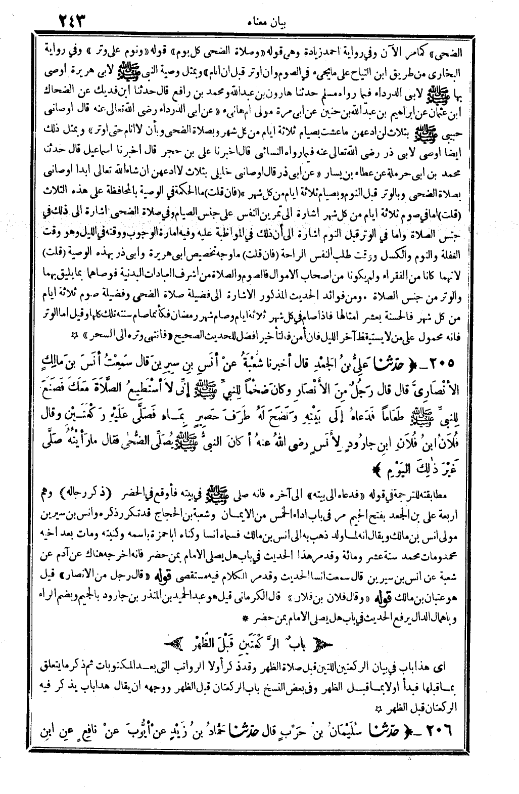 205 - (حَدثنَا عَليّ بن الْجَعْد قَالَ أخبرنَا شُعْبَة عَن أنس بن سِيرِين قَالَ سَمِعت أنس بن مَالك الْأنْصَارِيّ قَالَ قَالَ رجل من الْأَنْصَار وَكَانَ ضخما للنَّبِي - صَلَّى اللَّهُ عَلَيْهِ وَسَلَّم َ - إِنِّي لَا أَسْتَطِيع الصَّلَاة مَعَك فَصنعَ للنَّبِي - صَلَّى اللَّهُ عَلَيْهِ وَسَلَّم َ - طَعَاما فَدَعَاهُ إِلَى بَيته ونضح لَهُ طرف حَصِير بِمَاء فصلى عَلَيْهِ رَكْعَتَيْنِ وَقَالَ فلَان ابْن فلَان ابْن جارود لأنس رَضِي الله عَنهُ أَكَانَ النَّبِي - صَلَّى اللَّهُ عَلَيْهِ وَسَلَّم َ - يُصَلِّي الضُّحَى فَقَالَ مَا رَأَيْته صلى غير ذَلِك الْيَوْم) مطابقته للتَّرْجَمَة فِي قَوْله " فَدَعَاهُ إِلَى بَيته " إِلَى آخِره فَإِنَّهُ صلى - صَلَّى اللَّهُ عَلَيْهِ وَسَلَّم َ - فِي بَيته فأوقع فِي الْحَضَر (ذكر رِجَاله) وهم أَرْبَعَة عَليّ بن الْجَعْد بِفَتْح الْجِيم مر فِي بَاب أَدَاء الْخمس من الْإِيمَان وَشعْبَة بن الْحجَّاج قد تكَرر ذكره وَأنس بن سِيرِين مولى أنس بن مَالك وَيُقَال أَنه لما ولد ذهب بِهِ إِلَى أنس بن مَالك فَسَماهُ أنسا وكناه أَبَا حَمْزَة باسمه وكنيته وَمَات بعد أَخِيه مُحَمَّد وَمَات مُحَمَّد سنة عشر وَمِائَة وَقد مر هَذَا الحَدِيث فِي بَاب هَل يُصَلِّي الإِمَام بِمن حضر فَإِنَّهُ أخرجه هُنَاكَ عَن آدم عَن شُعْبَة عَن أنس بن سِيرِين قَالَ سَمِعت أنسا الحَدِيث وَقد مر الْكَلَام فِيهِ مستقصى قَوْله " قَالَ رجل من الْأَنْصَار " قيل هُوَ عتْبَان بن مَالك قَوْله " وَقَالَ فلَان بن فلَان " قَالَ الْكرْمَانِي قيل هُوَ عبد الحميد بن الْمُنْذر بن جارود بِالْجِيم وبضم الرَّاء وبإهمال الدَّال يرفع الحَدِيث فِي بَاب هَل يُصَلِّي الإِمَام بِمن حضر.