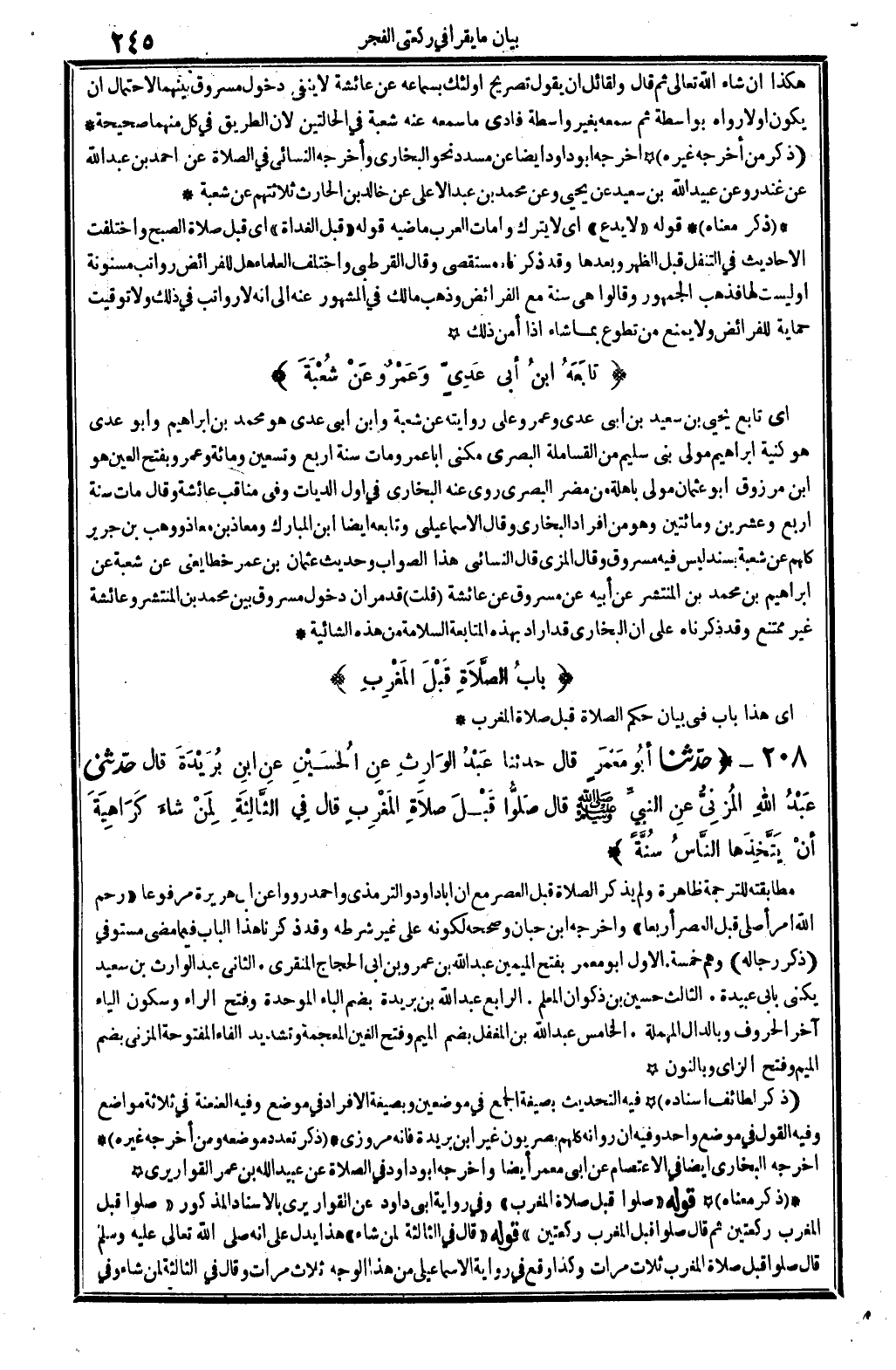 208 - (حَدثنَا أَبُو معمر قَالَ حَدثنَا عبد الْوَارِث عَن الْحُسَيْن عَن ابْن بُرَيْدَة قَالَ حَدثنِي عبد الله الْمُزنِيّ عَن النَّبِي - صَلَّى اللَّهُ عَلَيْهِ وَسَلَّم َ - قَالَ صلوا قبل صَلَاة الْمغرب قَالَ فِي الثَّالِثَة لمن شَاءَ كَرَاهِيَة أَن يتخذها النَّاس سنة) مطابقته للتَّرْجَمَة ظَاهِرَة وَلم يذكر الصَّلَاة قبل الْعَصْر مَعَ أَن أَبَا دَاوُد وَالتِّرْمِذِيّ وَأحمد رووا عَن أبي هُرَيْرَة مَرْفُوعا " رحم الله امْرأ صلى قبل الْعَصْر أَرْبعا " وَأخرجه ابْن حبَان وَصَححهُ لكَونه على غير شَرطه وَقد ذكرنَا هَذَا الْبَاب فِيمَا مضى مُسْتَوفى. (ذكر رِجَاله) وهم خَمْسَة. الأول أَبُو معمر بِفَتْح الميمين عبد الله بن عَمْرو بن أبي الْحجَّاج الْمنْقري. الثَّانِي عبد الْوَارِث بن سعيد يكنى بِأبي عُبَيْدَة. الثَّالِث حُسَيْن بن ذكْوَان الْمعلم. الرَّابِع عبد الله بن بُرَيْدَة بِضَم الْبَاء الْمُوَحدَة وَفتح الرَّاء وَسُكُون الْيَاء آخر الْحُرُوف وبالدال الْمُهْملَة. الْخَامِس عبد الله بن الْمُغَفَّل بِضَم الْمِيم وَفتح الْغَيْن الْمُعْجَمَة وَتَشْديد الْفَاء الْمَفْتُوحَة الْمُزنِيّ بِضَم الْمِيم وَفتح الزَّاي وبالنون. (ذكر لطائف إِسْنَاده) فِيهِ التحديث بِصِيغَة الْجمع فِي موضِعين وبصيغة الْإِفْرَاد فِي مَوضِع وَفِيه العنعنة فِي ثَلَاثَة مَوَاضِع وَفِيه القَوْل فِي مَوضِع وَاحِد وَفِيه أَن رُوَاته كلهم بصريون يغر ابْن بُرَيْدَة فَإِنَّهُ مروزي. (ذكر تعدد مَوْضِعه وَمن أخرجه غَيره) أخرجه البُخَارِيّ أَيْضا فِي الِاعْتِصَام عَن أبي معمر أَيْضا وَأخرجه أَبُو دَاوُد فِي الصَّلَاة عَن عبيد الله بن عمر القواريري. (ذكر مَعْنَاهُ) قَوْله " صلوا قبل صَلَاة الْمغرب " وَفِي رِوَايَة أبي دَاوُد عَن القواريري بِالْإِسْنَادِ الْمَذْكُور " صلوا قبل الْمغرب رَكْعَتَيْنِ ثمَّ قَالَ صلوا قبل الْمغرب رَكْعَتَيْنِ " قَوْله " قَالَ فِي الثَّالِثَة لمن شَاءَ " هَذَا يدل على أَنه - صَلَّى اللَّهُ عَلَيْهِ وَسَلَّم َ - قَالَ صلوا قبل صَلَاة الْمغرب ثَلَاث مَرَّات وَكَذَا وَقع فِي رِوَايَة الْإِسْمَاعِيلِيّ من هَذَا الْوَجْه ثَلَاث مَرَّات وَقَالَ فِي الثَّالِثَة لمن شَاءَ وَفِي