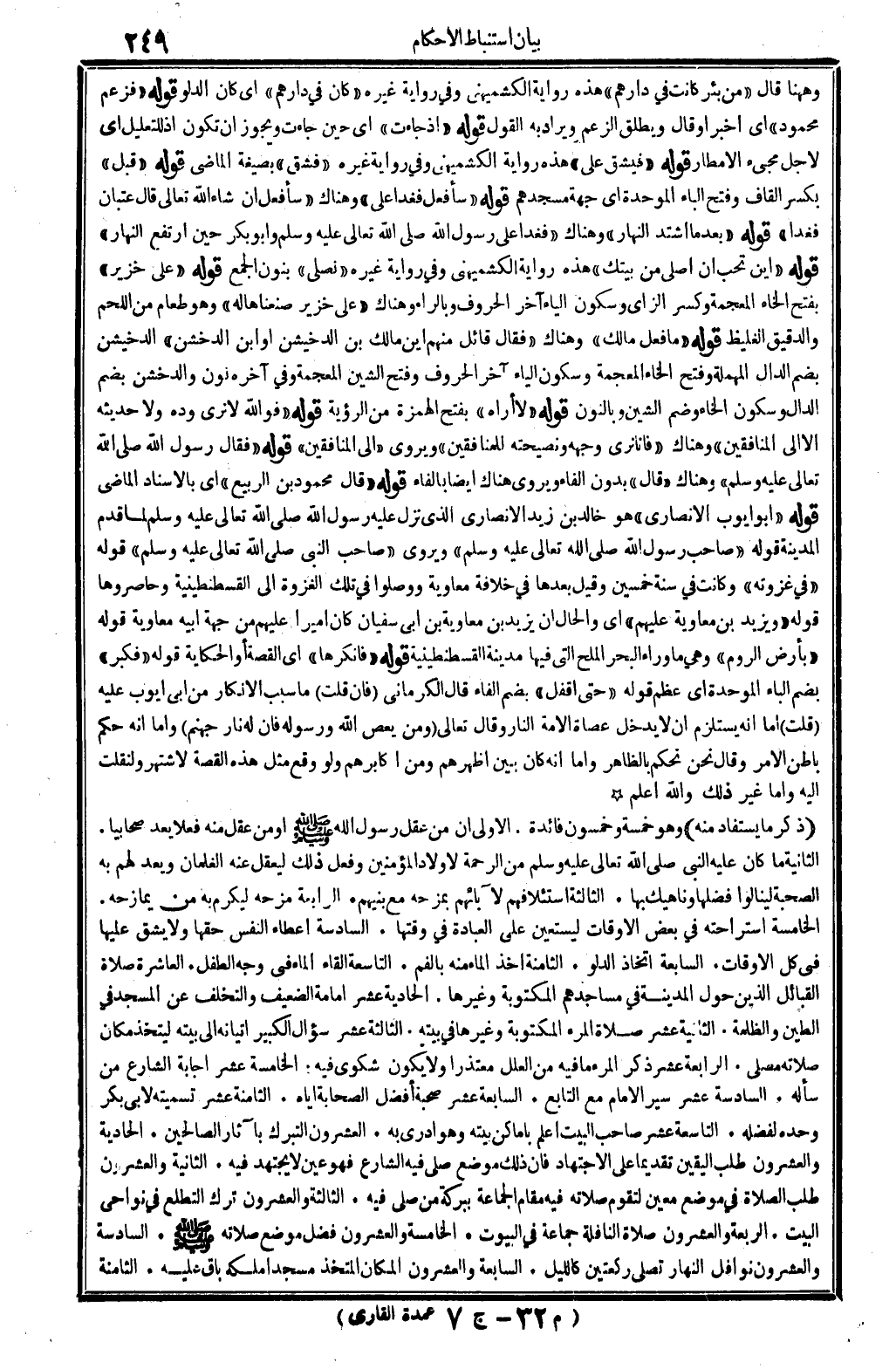 وَهَهُنَا قَالَ " من بِئْر كَانَت فِي دَارهم " هَذِه رِوَايَة الْكشميهني وَفِي رِوَايَة غَيره " كَانَ فِي دَارهم " أَي كَانَ الدَّلْو قَوْله " فَزعم مَحْمُود " أَي أخبر أَو قَالَ وَيُطلق الزَّعْم وَيُرَاد بِهِ القَوْل قَوْله " إِذْ جَاءَت " أَي حِين جَاءَت وَيجوز أَن تكون إِذْ للتَّعْلِيل أَي لأجل مَجِيء الأمطار قَوْله " فَيشق عَليّ " هَذِه رِوَايَة الْكشميهني وَفِي رِوَايَة غَيره " فشق " بِصِيغَة الْمَاضِي قَوْله " قبل " بِكَسْر الْقَاف وَفتح الْبَاء الْمُوَحدَة أَي جِهَة مَسْجِدهمْ قَوْله " سأفعل فغدا عَليّ " وَهُنَاكَ " سأفعل إِن شَاءَ الله تَعَالَى قَالَ عتْبَان فغدا " قَوْله " بَعْدَمَا اشْتَدَّ النَّهَار " وَهُنَاكَ " فغدا على رَسُول الله - صَلَّى اللَّهُ عَلَيْهِ وَسَلَّم َ - وَأَبُو بكر حِين ارْتَفع النَّهَار " قَوْله " أَيْن تحب أَن أُصَلِّي من بَيْتك " هَذِه رِوَايَة الْكشميهني وَفِي رِوَايَة غَيره " نصلي " بنُون الْجمع قَوْله " على خزير " بِفَتْح الْخَاء الْمُعْجَمَة وَكسر الزَّاي وَسُكُون الْيَاء آخر الْحُرُوف وبالراء وَهُنَاكَ " على خزير صنعناها لَهُ " وَهُوَ طَعَام من اللَّحْم والدقيق الغليظ قَوْله " مَا فعل مَالك " وَهُنَاكَ " فَقَالَ قَائِل مِنْهُم أَيْن مَالك بن الدخيشن أَو ابْن الدخشن " الدخيشن بِضَم الدَّال الْمُهْملَة وَفتح الْخَاء الْمُعْجَمَة وَسُكُون الْيَاء آخر الْحُرُوف وَفتح الشين الْمُعْجَمَة وَفِي آخِره نون والدخشن بِضَم الدَّال وَسُكُون الْخَاء وَضم الشين وبالنون قَوْله " لَا أرَاهُ " بِفَتْح الْهمزَة من الرُّؤْيَة قَوْله " فوَاللَّه لَا نرى وده وَلَا حَدِيثه إِلَّا إِلَى الْمُنَافِقين " وَهُنَاكَ " فَإنَّا نرى وَجهه ونصيحته لِلْمُنَافِقين " ويروى " إِلَى الْمُنَافِقين " قَوْله " فَقَالَ رَسُول الله - صَلَّى اللَّهُ عَلَيْهِ وَسَلَّم َ - " وَهُنَاكَ " قَالَ " بِدُونِ الْفَاء ويروى هُنَاكَ أَيْضا بِالْفَاءِ قَوْله " قَالَ مَحْمُود بن الرّبيع " أَي بِالْإِسْنَادِ الْمَاضِي قَوْله " أَبُو أَيُّوب الْأنْصَارِيّ " هُوَ خَالِد بن زيد الْأنْصَارِيّ الَّذِي نزل عَلَيْهِ رَسُول الله - صَلَّى اللَّهُ عَلَيْهِ وَسَلَّم َ - لما قدم الْمَدِينَة قَوْله " صَاحب رَسُول الله - صَلَّى اللَّهُ عَلَيْهِ وَسَلَّم َ - " ويروى " صَاحب النَّبِي - صَلَّى اللَّهُ عَلَيْهِ وَسَلَّم َ - " قَوْله " فِي غزوته " وَكَانَت فِي سنة خمسين وَقيل بعْدهَا فِي خلَافَة مُعَاوِيَة ووصلوا فِي تِلْكَ الْغَزْوَة إِلَى القسطنطينة وحاصروها قَوْله " وَيزِيد بن مُعَاوِيَة عَلَيْهِم " أَي وَالْحَال أَن يزِيد بن مُعَاوِيَة بن أبي سُفْيَان كَانَ أَمِيرا عَلَيْهِم من جِهَة أَبِيه مُعَاوِيَة قَوْله " بِأَرْض الرّوم " وَهِي مَا وَرَاء الْبَحْر الْملح الَّتِي فِيهَا مَدِينَة القسطنطينة قَوْله " فأنكرها " أَي الْقِصَّة أَو الْحِكَايَة قَوْله " فَكبر " بِضَم الْبَاء الْمُوَحدَة أَي عظم قَوْله " حَتَّى أقفل " بِضَم الْفَاء قَالَ الْكرْمَانِي (فَإِن قلت) مَا سَبَب الْإِنْكَار من أبي أَيُّوب عَلَيْهِ (قلت) إِمَّا أَنه يسْتَلْزم أَن لَا يدْخل عصاة الْأمة النَّار وَقَالَ تَعَالَى {وَمن يعْص الله وَرَسُوله فَإِن لَهُ نَار جَهَنَّم} وَإِمَّا أَنه حكم بَاطِن الْأَمر وَقَالَ نَحن نحكم بِالظَّاهِرِ وَإِمَّا أَنه كَانَ بَين أظهرهم وَمن أكابرهم وَلَو وَقع مثل هَذِه الْقِصَّة لاشتهر ولنقلت إِلَيْهِ وَإِمَّا غير ذَلِك وَالله أعلم (ذكر مَا يُسْتَفَاد مِنْهُ) وَهُوَ خَمْسَة وَخَمْسُونَ فَائِدَة. الأولى أَن من عقل رَسُول الله - صَلَّى اللَّهُ عَلَيْهِ وَسَلَّم َ - أَو من عقل مِنْهُ فعلا يعد صحابيا. الثَّانِيَة مَا كَانَ عَلَيْهِ - صَلَّى اللَّهُ عَلَيْهِ وَسَلَّم َ - من الرَّحْمَة لأَوْلَاد الْمُؤمنِينَ وَفعل ذَلِك ليعقل عَنهُ الغلمان ويعد لَهُم بِهِ الصُّحْبَة لينالوا فَضلهَا وناهيك بهَا. الثَّ