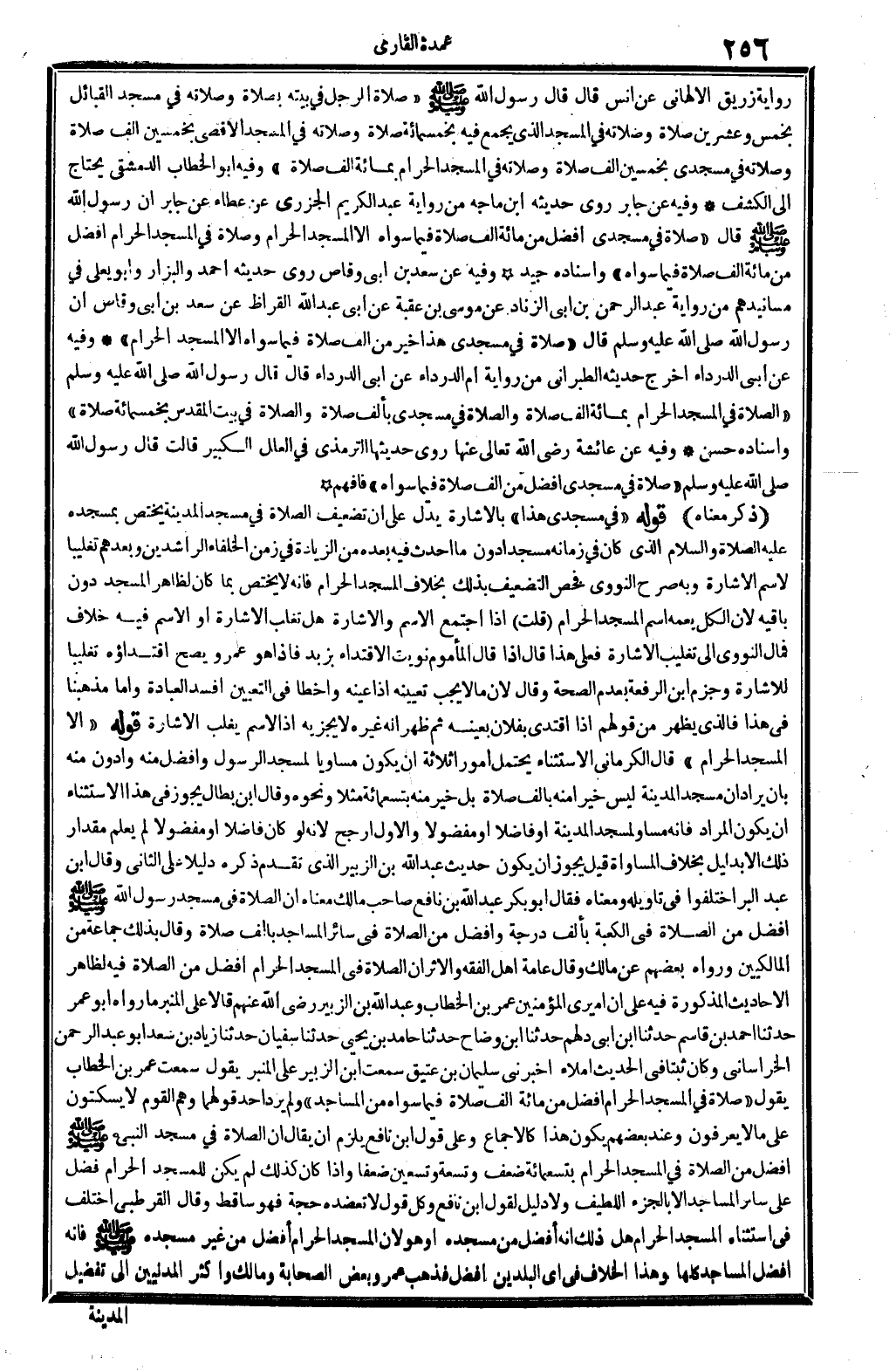 رِوَايَة رُزَيْق الْأَلْهَانِي عَن أنس قَالَ قَالَ رَسُول الله - صَلَّى اللَّهُ عَلَيْهِ وَسَلَّم َ - " صَلَاة الرجل فِي بَيته بِصَلَاة وَصلَاته فِي مَسْجِد الْقَبَائِل بِخمْس وَعشْرين صَلَاة وَصلَاته فِي الْمَسْجِد الَّذِي يجمع فِيهِ بِخَمْسِمِائَة صَلَاة وَصلَاته فِي الْمَسْجِد الْأَقْصَى بِخَمْسِينَ ألف صَلَاة وَصلَاته فِي مَسْجِدي بِخَمْسِينَ ألف صَلَاة وَصلَاته فِي الْمَسْجِد الْحَرَام بِمِائَة ألف صَلَاة " وَفِيه أَبُو الْخطاب الدِّمَشْقِي يحْتَاج إِلَى الْكَشْف وَفِيه عَن جَابر روى حَدِيثه ابْن ماجة من رِوَايَة عبد الْكَرِيم الْجَزرِي عَن عَطاء عَن جَابر أَن رَسُول الله - صَلَّى اللَّهُ عَلَيْهِ وَسَلَّم َ - قَالَ " صَلَاة فِي مَسْجِدي أفضل من مائَة ألف صَلَاة فِيمَا سواهُ إِلَّا الْمَسْجِد الْحَرَام وَصَلَاة فِي الْمَسْجِد الْحَرَام أفضل من مائَة ألف صَلَاة فِيمَا سواهُ " وَإِسْنَاده جيد وَفِيه عَن سعد بن أبي وَقاص روى حَدِيثه أَحْمد وَالْبَزَّار وَأَبُو يعلى فِي مسانيدهم من رِوَايَة عبد الرَّحْمَن بن أبي الزِّنَاد عَن مُوسَى بن عقبَة عَن أبي عبد الله الْقَرَّاظ عَن سعد بن أبي وَقاص أَن رَسُول الله - صَلَّى اللَّهُ عَلَيْهِ وَسَلَّم َ - قَالَ " صَلَاة فِي مَسْجِدي هَذَا خير من ألف صَلَاة فِيمَا سواهُ إِلَّا الْمَسْجِد الْحَرَام " وَفِيه عَن أبي الدَّرْدَاء أخرج حَدِيثه الطَّبَرَانِيّ من رِوَايَة أم الدَّرْدَاء عَن أبي الدَّرْدَاء قَالَ قَالَ رَسُول الله - صَلَّى اللَّهُ عَلَيْهِ وَسَلَّم َ - " الصَّلَاة فِي الْمَسْجِد الْحَرَام بِمِائَة ألف صَلَاة وَالصَّلَاة فِي مَسْجِدي بِأَلف صَلَاة وَالصَّلَاة فِي بَيت الْمُقَدّس بِخَمْسِمِائَة صَلَاة " وَإِسْنَاده حسن وَفِيه عَن عَائِشَة رَضِي الله تَعَالَى عَنْهَا روى حَدِيثهَا التِّرْمِذِيّ فِي الْعِلَل الْكَبِير قَالَت قَالَ رَسُول الله - صَلَّى اللَّهُ عَلَيْهِ وَسَلَّم َ - " صَلَاة فِي مَسْجِدي أفضل من ألف صَلَاة فِيمَا سواهُ " فَافْهَم (ذكر مَعْنَاهُ) قَوْله " فِي مَسْجِدي هَذَا " بِالْإِشَارَةِ يدل على أَن تَضْعِيف الصَّلَاة فِي مَسْجِد الْمَدِينَة يخْتَص بمسجده عَلَيْهِ الصَّلَاة وَالسَّلَام الَّذِي كَانَ فِي زَمَانه مَسْجِدا دون مَا أحدث فِيهِ بعده من الزِّيَادَة فِي زمن الْخُلَفَاء الرَّاشِدين وبعدهم تَغْلِيبًا لاسم الاشارة وَبِه صرح النَّوَوِيّ فَخص التَّضْعِيف بذلك بِخِلَاف الْمَسْجِد الْحَرَام فَإِنَّهُ لَا يخْتَص بِمَا كَانَ لظَاهِر الْمَسْجِد دون بَاقِيه لِأَن الْكل يعمه اسْم الْمَسْجِد الْحَرَام (قلت) إِذا اجْتمع الِاسْم وَالْإِشَارَة هَل تغلب الْإِشَارَة أَو الِاسْم فِيهِ خلاف فَمَال النَّوَوِيّ إِلَى تَغْلِيب الْإِشَارَة فعلى هَذَا قَالَ إِذا قَالَ الْمَأْمُوم نَوَيْت الِاقْتِدَاء بزيد فَإِذا هُوَ عَمْرو يَصح اقْتِدَاؤُهُ تَغْلِيبًا للْإِشَارَة وَجزم ابْن الرّفْعَة بِعَدَمِ الصِّحَّة وَقَالَ لِأَن مَا يجب تَعْيِينه إِذا عينه وَأَخْطَأ فِي التَّعْيِين أفسد الْعِبَادَة وَأما مَذْهَبنَا فِي هَذَا فَالَّذِي يظْهر من قَوْلهم إِذا اقْتدى بفلان بِعَيْنِه ثمَّ ظهر أَنه غَيره لَا يجْزِيه إِذْ الِاسْم يغلب الْإِشَارَة قَوْله " إِلَّا الْمَسْجِد الْحَرَام " قَالَ الْكرْمَانِي الِاسْتِثْنَاء يحْتَمل أمورا ثَلَاثَة أَن يكون مُسَاوِيا لمَسْجِد الرَّسُول وَأفضل مِنْهُ وأدون مِنْهُ بِأَن يرادان فِي مَسْجِد الْمَدِينَة لَيْسَ خيرا مِنْهُ بِأَلف صَلَاة بل خير مِنْهُ بتسعمائة مثلا وَنَحْوه وَقَالَ ابْن بطال يجوز فِي هَذَا الِاسْتِثْنَاء أَن يكون المُرَاد فَإِنَّهُ مسَاوٍ لمَسْجِد الْمَدِينَة أَو فَاضلا أَو مفضولا وَالْأول أرجح لِأَنَّهُ لَو كَانَ فَاضلا أَو مفضولا لم يعلم مِقْدَار ذَلِك إِلَّا بِدَلِيل بِخِلَاف الْمُسَاوَاة قيل يجوز أَن يكون حَدِيث 