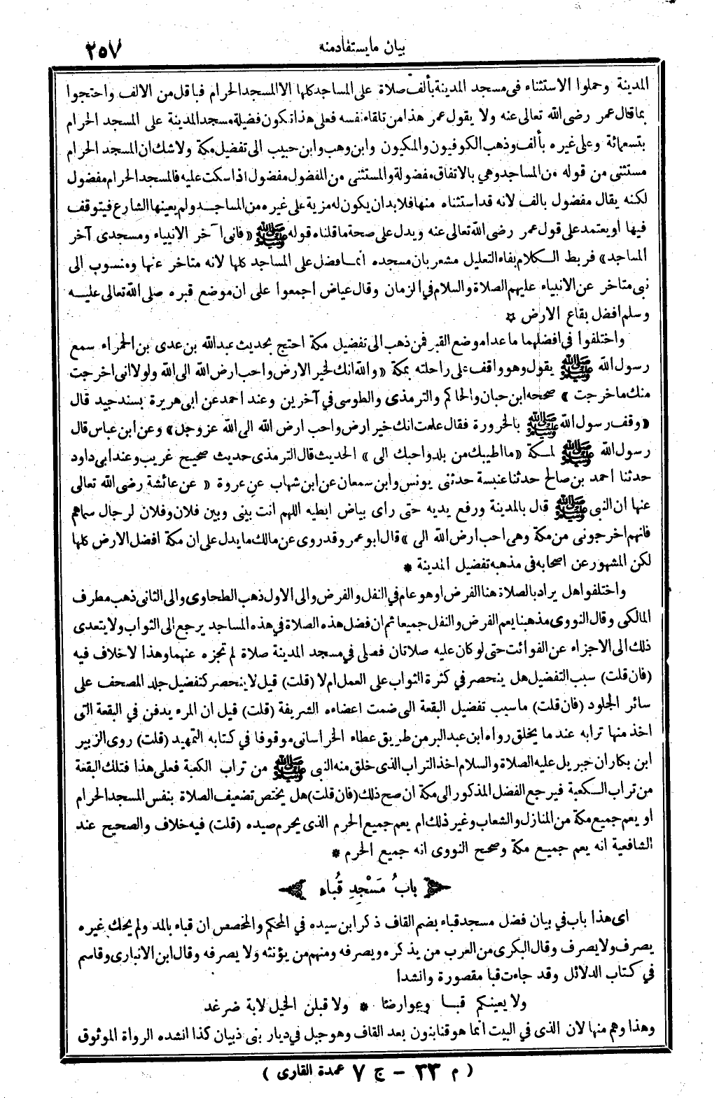 الْمَدِينَة وحملوا الِاسْتِثْنَاء فِي مَسْجِد الْمَدِينَة بِأَلف صَلَاة على الْمَسَاجِد كلهَا إِلَّا الْمَسْجِد الْحَرَام فبأقل من الْألف وَاحْتَجُّوا بِمَا قَالَ عمر رَضِي الله تَعَالَى عَنهُ وَلَا يَقُول عمر هَذَا من تِلْقَاء نَفسه فعلى هَذَا تكون فَضِيلَة مَسْجِد الْمَدِينَة على الْمَسْجِد الْحَرَام بتسعمائة وعَلى غَيره بِأَلف وَذهب الْكُوفِيُّونَ والمكيون وَابْن وهب وَابْن حبيب إِلَى تَفْضِيل مَكَّة وَلَا شكّ أَن الْمَسْجِد الْحَرَام مُسْتَثْنى من قَوْله من الْمَسَاجِد وَهِي بالِاتِّفَاقِ مفضولة والمستثنى من الْمَفْضُول مفضول إِذا سكت عَلَيْهِ فالمسجد الْحَرَام مفضول لكنه يُقَال مفضول بِأَلف لِأَنَّهُ قد اسْتَثْنَاهُ مِنْهَا فَلَا بُد أَن يكون لَهُ مزية على غَيره من الْمَسَاجِد وَلم يعينها الشَّارِع فَيتَوَقَّف فِيهَا أَو يعْتَمد على قَول عمر رَضِي الله تَعَالَى عَنهُ وَيدل على صِحَة مَا قُلْنَاهُ قَوْله - صَلَّى اللَّهُ عَلَيْهِ وَسَلَّم َ - " فَإِنِّي آخر الْأَنْبِيَاء ومسجدي آخر الْمَسَاجِد " فَربط الْكَلَام بفاء التَّعْلِيل مشْعر بِأَن مَسْجده إِنَّمَا فضل على الْمَسَاجِد كلهَا لِأَنَّهُ مُتَأَخّر عَنْهَا ومنسوب إِلَى نَبِي مُتَأَخّر عَن الْأَنْبِيَاء عَلَيْهِم الصَّلَاة وَالسَّلَام فِي الزَّمَان وَقَالَ عِيَاض أَجمعُوا على أَن مَوضِع قَبره - صَلَّى اللَّهُ عَلَيْهِ وَسَلَّم َ - أفضل بقاع الأَرْض وَاخْتلفُوا فِي أفضلهما مَا عدا مَوضِع الْقَبْر فَمن ذهب إِلَى تَفْضِيل مَكَّة احْتج بِحَدِيث عبد الله بن عدي بن الْحَمْرَاء سمع رَسُول الله - صَلَّى اللَّهُ عَلَيْهِ وَسَلَّم َ - يَقُول وَهُوَ وَاقِف على رَاحِلَته بِمَكَّة " وَالله إِنَّك لخير الأَرْض وَأحب أَرض الله إِلَى الله وَلَوْلَا أَنِّي أخرجت مِنْك مَا خرجت " صَححهُ ابْن حبَان وَالْحَاكِم وَالتِّرْمِذِيّ والطوسي فِي آخَرين وَعند أَحْمد عَن أبي هُرَيْرَة بِسَنَد جيد قَالَ " وقف رَسُول الله - صَلَّى اللَّهُ عَلَيْهِ وَسَلَّم َ - بالخرورة فَقَالَ علمت أَنَّك خير أَرض وَأحب أَرض الله إِلَى الله عز وَجل " وَعَن ابْن عَبَّاس قَالَ رَسُول الله - صَلَّى اللَّهُ عَلَيْهِ وَسَلَّم َ - لمَكَّة " مَا أطيبك من بلد وَأَحَبَّك إِلَيّ " الحَدِيث قَالَ التِّرْمِذِيّ حَدِيث صَحِيح غَرِيب وَعند أبي دَاوُد حَدثنَا أَحْمد بن صَالح حَدثنَا عَنْبَسَة حَدثنِي يُونُس وَابْن سمْعَان عَن ابْن شهَاب عَن عُرْوَة " عَن عَائِشَة رَضِي الله تَعَالَى عَنْهَا أَن النَّبِي - صَلَّى اللَّهُ عَلَيْهِ وَسَلَّم َ - قَالَ بِالْمَدِينَةِ وَرفع يَدَيْهِ حَتَّى رَأْي بَيَاض إبطَيْهِ اللَّهُمَّ أَنْت بيني وَبَين فلَان وَفُلَان لرجال سماهم فَإِنَّهُم أَخْرجُونِي من مَكَّة هِيَ أحب أَرض الله إِلَيّ " قَالَ أَبُو عَمْرو قد روى عَن مَالك مَا يدل على أَن مَكَّة أفضل الأَرْض كلهَا لَكِن الْمَشْهُور عَن أَصْحَابه فِي مذْهبه تَفْضِيل الْمَدِينَة وَاخْتلفُوا هَل يُرَاد بِالصَّلَاةِ هُنَا الْفَرْض أَو هُوَ عَام فِي النَّفْل وَالْفَرْض وَإِلَى الأول ذهب الطَّحَاوِيّ وَإِلَى الثَّانِي ذهب مطرف الْمَالِكِي وَقَالَ النَّوَوِيّ مَذْهَبنَا يعم الْفَرْض وَالنَّفْل جَمِيعًا ثمَّ إِن فضل هَذِه الصَّلَاة فِي هَذِه الْمَسَاجِد يرجع إِلَى الثَّوَاب وَلَا يتَعَدَّى ذَلِك إِلَّا الْإِجْزَاء عَن الْفَوَائِت حَتَّى لَو كَانَ عَلَيْهِ صلاتان فصلى فِي مَسْجِد الْمَدِينَة صَلَاة لم تجزه عَنْهُمَا وَهَذَا لَا خلاف فِيهِ (فَإِن قلت) سَبَب التَّفْضِيل هَل ينْحَصر فِي كَثْرَة الثَّوَاب على الْعَمَل أم لَا (قلت) قيل لَا ينْحَصر كتفضيل جلد الْمُصحف على سَائِر الْجُلُود (فَإِن قلت) مَا سَبَب تَفْضِيل الْبقْعَة الَّتِي ضمت أعضاءه الشَّرِيفَة (قلت) قيل أَن الْمَرْء يدْفن فِي الْبقْعَة الَّتِي أَخذ مِنْهَا ترابه عِنْدَمَا