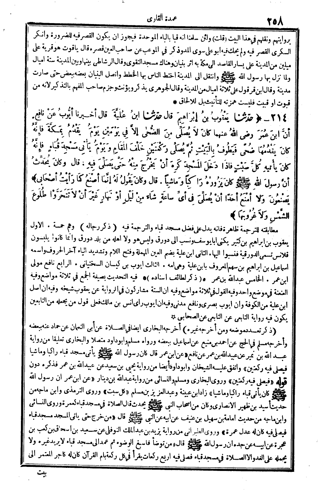 214 - (حَدثنَا يَعْقُوب بن إِبْرَاهِيم قَالَ حَدثنَا ابْن علية قَالَ أخبرنَا أَيُّوب عَن نَافِع أَن ابْن عمر رَضِي الله عَنْهُمَا كَانَ لَا يُصَلِّي من الضُّحَى إِلَّا فِي يَوْمَيْنِ يَوْم يقدم بِمَكَّة فَإِنَّهُ كَانَ يقدمهَا ضحى فيطوف بِالْبَيْتِ ثمَّ يُصَلِّي رَكْعَتَيْنِ خلف الْمقَام وَيَوْم يَأْتِي مَسْجِد قبَاء فَإِنَّهُ كَانَ يَأْتِيهِ كل سبت فَإِذا دخل الْمَسْجِد كره أَن يخرج مِنْهُ حَتَّى يُصَلِّي فِيهِ. قَالَ وَكَانَ يحدث أَن رَسُول الله - صَلَّى اللَّهُ عَلَيْهِ وَسَلَّم َ - كَانَ يزوره رَاكِبًا وماشيا. قَالَ وَكَانَ يَقُول لَهُ إِنَّمَا أصنع كَمَا رَأَيْت أَصْحَابِي يصنعون وَلَا أمنع أحدا أَن يُصَلِّي فِي أَي سَاعَة شَاءَ من ليل أَو نَهَار غير أَن لَا تتحروا طُلُوع الشَّمْس وَلَا غُرُوبهَا) مطابقته للتَّرْجَمَة ظَاهِرَة فَإِنَّهُ يدل على فضل مَسْجِد قبَاء والترجمة فِيهِ. (ذكر رِجَاله) وهم خَمْسَة. الأول يَعْقُوب بن إِبْرَاهِيم بن كثير يكنى أَبَا يُوسُف وَنسب إِلَى دورق وَلَيْسَ هُوَ وَلَا أَهله من بلد دورق وَإِنَّمَا كَانُوا يلبسُونَ قلانس تسمى الدورقية فنسبوا إِلَيْهَا. الثَّانِي ابْن علية بِضَم الْعين الْمُهْملَة وَفتح اللَّام وَتَشْديد الْيَاء آخر الْحُرُوف واسْمه إِسْمَاعِيل بن إِبْرَاهِيم بن سهم الْمَعْرُوف بِابْن علية وَهِي أمه. الثَّالِث أَيُّوب بن كيسَان السّخْتِيَانِيّ. الرَّابِع نَافِع مولى ابْن عمر. الْخَامِس عبد الله بن عمر. (ذكر لطائف إِسْنَاده) فِيهِ التحديث بِصِيغَة الْجمع فِي ثَلَاثَة مَوَاضِع وَفِيه العنعنة فِي مَوضِع وَاحِد وَفِيه القَوْل فِي ثَلَاثَة مَوَاضِع وَفِيه أَن السِّتَّة مشاركون فِي الرِّوَايَة عَن يَعْقُوب شَيْخه وَفِيه أَن أصل ابْن علية من الْكُوفَة وَأَن أَيُّوب بَصرِي وَنَافِع مدنِي وَفِيه أَن أَيُّوب رأى أنس بن مَالك فعلى قَول من يَجعله من التَّابِعين يكون فِيهِ رِوَايَة التَّابِعِيّ عَن التَّابِعِيّ عَن الصَّحَابِيّ (ذكر تعدد مَوْضِعه وَمن أخرجه غَيره) أخرجه البُخَارِيّ أَيْضا فِي الصَّلَاة عَن أبي النُّعْمَان عَن حَمَّاد عَنهُ بِبَعْضِه وَأخرجه مُسلم فِي الْحَج عَن أَحْمد بن منيع عَن إِسْمَاعِيل بِبَعْضِه وَرَوَاهُ مُسلم وَأَبُو دَاوُد مُتَّصِلا وَالْبُخَارِيّ تَعْلِيقا من رِوَايَة عبد الله بن نمير عَن عبيد الله بن عمر عَن نَافِع " عَن ابْن عمر قَالَ كَانَ رَسُول الله - صَلَّى اللَّهُ عَلَيْهِ وَسَلَّم َ - يَأْتِي مَسْجِد قبَاء رَاكِبًا وماشيا فَيصَلي فِيهِ رَكْعَتَيْنِ " وَاتفقَ عَلَيْهِ الشَّيْخَانِ وَأَبُو دَاوُد أَيْضا من رِوَايَة يحيى بن سعيد عَن عبيد الله بن عمر فَذكره دون قَوْله " فَيصَلي فِيهِ رَكْعَتَيْنِ " وروى البُخَارِيّ وَمُسلم وَالنَّسَائِيّ من رِوَايَة عبد الله بن دِينَار " عَن ابْن عمر أَن رَسُول الله - صَلَّى اللَّهُ عَلَيْهِ وَسَلَّم َ - كَانَ يَأْتِي قبَاء رَاكِبًا وماشيا " زَاد ابْن عُيَيْنَة وَعبد الْعَزِيز بن مُسلم " كل سبت " وروى التِّرْمِذِيّ وَابْن ماجة من حَدِيث أسيد بن ظهير الْأنْصَارِيّ وَكَانَ من أَصْحَاب النَّبِي - صَلَّى اللَّهُ عَلَيْهِ وَسَلَّم َ - يحدث قَالَ الصَّلَاة فِي مَسْجِد قبَاء كعمرة وروى النَّسَائِيّ وَابْن ماجة من حَدِيث أُمَامَة بن سُهَيْل بن عنيف عَن أَبِيه عَن النَّبِي - صَلَّى اللَّهُ عَلَيْهِ وَسَلَّم َ - قَالَ " من خرج حَتَّى يَأْتِي الْمَسْجِد مَسْجِد قبَاء فَيصَلي فِيهِ كَانَ لَهُ عدل عمْرَة " وروى الطَّبَرَانِيّ من رِوَايَة يزِيد بن عبد الْملك النَّوْفَلِي عَن سعيد بن إِسْحَاق بن كَعْب بن عجْرَة عَن أَبِيه عَن جده أَن رَسُول الله - صَلَّى اللَّهُ عَلَيْهِ وَسَلَّم َ - قَالَ " من تَوَضَّأ فأسبغ الْوضُوء ثمَّ عمد إِلَى مَسْجِد قبَاء لَا يُرِيد غَيره وَلَا يحملهُ على الغدو إِلَّا الصَّلَاة فِي مَسْجِد قبَاء فصلى فِيهِ أَربع