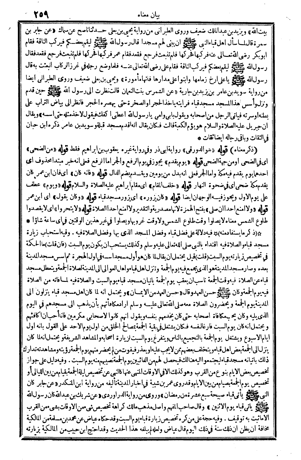 بَيت الله " وَيزِيد بن عبد الْملك ضَعِيف وروى الطَّبَرَانِيّ من رِوَايَة يحيى بن يعلى حَدثنَا نَاصح عَن سماك " عَن جَابر بن سَمُرَة قَالَ لما سَأَلَ أهل قبَاء النَّبِي - صَلَّى اللَّهُ عَلَيْهِ وَسَلَّم َ - أَن يَبْنِي لَهُم مَسْجِدا قَالَ رَسُول الله - صَلَّى اللَّهُ عَلَيْهِ وَسَلَّم َ - ليقمْ بَعْضكُم فيركب النَّاقة فَقَامَ أَبُو بكر رَضِي الله تَعَالَى عَنهُ فركبها فحركها فَلم تنبعث فَرجع فَقعدَ فَقَامَ عمر فركبها فحركها فَلم تنبعث فَرجع فَقعدَ فَقَالَ رَسُول الله - صَلَّى اللَّهُ عَلَيْهِ وَسَلَّم َ - ليقمْ بَعْضكُم فيركب النَّاقة فَقَامَ عَليّ رَضِي الله تَعَالَى عَنهُ فَلَمَّا وضع رجله فِي غرز الركاب انبعثت بِهِ قَالَ رَسُول الله - صَلَّى اللَّهُ عَلَيْهِ وَسَلَّم َ - يَا عَليّ أرخ زمامها وَابْنُوا على مدارها فَإِنَّهَا مأمورة " وَيحيى بن يعلى ضَعِيف وروى الطَّبَرَانِيّ أَيْضا من رِوَايَة سُوَيْد بن عَامر بن يزِيد بن جَارِيَة " عَن الشمرس بنت النُّعْمَان قَالَت نظرت إِلَى رَسُول الله - صَلَّى اللَّهُ عَلَيْهِ وَسَلَّم َ - حِين قدم وَنزل وَأسسَ هَذَا الْمَسْجِد مَسْجِد قبَاء فرأيته يَأْخُذ الْحجر أَو الصَّخْرَة حَتَّى يهصره الْحجر فَانْظُر إِلَى بَيَاض التُّرَاب على بَطْنه أَو سرته فَيَأْتِي الرجل من أَصْحَابه وَيَقُول بِأبي وَأمي يَا رَسُول الله أَعْطِنِي أكفك فَيَقُول لأخذ مثله حَتَّى أسسه " وَيُقَال أَن جِبْرِيل عَلَيْهِ الصَّلَاة وَالسَّلَام هُوَ يؤم الْكَعْبَة قَالَت فَكَانَ يُقَال أَنه أقدم مَسْجِد قبْلَة وسُويد بن عَامر ذكره ابْن حبَان فِي الثِّقَات وَبَاقِي رِجَاله أَيْضا ثِقَات (ذكر مَعْنَاهُ) قَوْله " هُوَ الدَّوْرَقِي " رِوَايَة أبي ذَر وَفِي رِوَايَة غَيره يَعْقُوب بن إِبْرَاهِيم فَقَط قَوْله " من الضُّحَى " أَي فِي الضُّحَى أَو من جِهَة الضُّحَى قَوْله " يَوْم يقدم " يجوز فِي يَوْم الرّفْع والجر أما الرّفْع فعلى أَنه خبر مُبْتَدأ مَحْذُوف أَي أَحدهمَا يَوْم يقدم فِيهِ مَكَّة وَأما الْجَرّ فعلى أَنه بدل من يَوْمَيْنِ وَيقدم بِضَم الدَّال قَوْله " فَإِنَّهُ كَانَ " أَي فَإِن ابْن عمر كَانَ يقدم مَكَّة ضحى أَي فِي ضحوة النَّهَار قَوْله " خلف الْمقَام " أَي مقَام إِبْرَاهِيم عَلَيْهِ الصَّلَاة وَالسَّلَام قَوْله " وَيَوْم " عطف على يَوْم الأول وَيجوز فِيهِ الْوَجْهَانِ أَيْضا قَوْله " كَانَ يزوره " أَي يزور مَسْجِد قبَاء قَوْله " وَكَانَ يَقُول " أَي ابْن عمر قَوْله " وَلَا أمنع أحدا إِن صلى " بِفَتْح الْهمزَة لِأَنَّهَا مَصْدَرِيَّة وَالتَّقْدِير وَلَا أمنع أحدا الصَّلَاة قَوْله " لَا يتحروا " أَي لَا يقصدوا طُلُوع الشَّمْس مَعْنَاهُ لَا يصلوا وَقت طُلُوع الشَّمْس وَلَا وَقت غُرُوبهَا ويصلوا فِي غير هذَيْن الْوَقْتَيْنِ فِي أَي سَاعَة شاؤا (ذكر مَا يُسْتَفَاد مِنْهُ) فِيهِ دلَالَة على فضل قبَاء وَفضل الْمَسْجِد الَّذِي بهَا وَفضل الصَّلَاة فِيهِ. وَفِيه اسْتِحْبَاب زِيَارَة مَسْجِد قبَاء وَالصَّلَاة فِيهِ اقْتِدَاء بِالنَّبِيِّ - صَلَّى اللَّهُ عَلَيْهِ وَسَلَّم َ - وَكَذَلِكَ يسْتَحبّ أَن يكون يَوْم السبت (فَإِن قلت) مَا الْحِكْمَة فِي تَخْصِيص زيارته يَوْم السبت (قلت) قيل يحْتَمل أَن يُقَال لما كَانَ هُوَ أول مَسْجِد أسسه فِي أول الْهِجْرَة ثمَّ أسس مَسْجِد الْمَدِينَة بعده وَصَارَ مَسْجِد الْمَدِينَة هُوَ الَّذِي يجمع فِيهِ يَوْم الْجُمُعَة وتنزل أهل قبَاء وَأهل العوالي إِلَى الْمَدِينَة لصَلَاة الْجُمُعَة ويتعطل مَسْجِد قبَاء عَن الصَّلَاة فِيهِ وَقت الْجُمُعَة ناسب أَن يعقب يَوْم الْجُمُعَة بإتيان مَسْجِد قبَاء يَوْم السبت وَالصَّلَاة فِيهِ لما فَاتَهُ من الصَّلَاة فِيهِ يَوْم الْجُمُعَة وَكَانَ - صَلَّى اللَّهُ عَلَيْهِ وَسَلَّم َ - حسن الْعَهْد وَقَالَ " حسن الْعَهْد من الْإِيمَان " وَيحْتَمل أَنه لما كَ