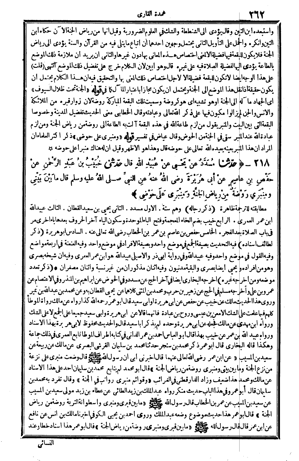 218 - (حَدثنَا مُسَدّد عَن يحيى عَن عبيد الله قَالَ حَدثنِي خبيب بن عبد الرَّحْمَن عَن حَفْص بن عَاصِم عَن أبي هُرَيْرَة رَضِي الله عَنهُ عَن النَّبِي - صَلَّى اللَّهُ عَلَيْهِ وَسَلَّم َ - قَالَ مَا بَين بَيْتِي ومنبري رَوْضَة من رياض الْجنَّة ومنبري على حَوْضِي) مطابقته للتَّرْجَمَة ظَاهِرَة. (ذكر رِجَاله) وهم سِتَّة. الأول مُسَدّد. الثَّانِي يحيى بن سعيد الْقطَّان. الثَّالِث عبيد الله بن عمر الْعمريّ. الرَّابِع خبيب بِضَم الْخَاء الْمُعْجَمَة وَفتح الْبَاء الْمُوَحدَة وَسُكُون الْيَاء آخر الْحُرُوف بعْدهَا بَاء أُخْرَى مر فِي بَاب الصَّلَاة بعد الْفجْر. الْخَامِس حَفْص بن عَاصِم بن عمر بن الْخطاب رَضِي الله تَعَالَى عَنهُ. السَّادِس أَبُو هُرَيْرَة. (ذكر لطائف إِسْنَاده) فِيهِ التحديث بِصِيغَة الْجمع فِي مَوضِع وَاحِد وبصيغة الْإِفْرَاد فِي مَوضِع وَاحِد وَفِيه العنعنة فِي أَرْبَعَة مَوَاضِع وَفِيه القَوْل فِي مَوضِع وَاحِد وَفِيه عبيد الله وَفِي رِوَايَة أبي ذَر والأصيلي عبيد الله هُوَ ابْن عمر الْعمريّ وَفِيه أَن شَيْخه بَصرِي وَهُوَ من أَفْرَاده وَيحيى أَيْضا بَصرِي والبقية مدنيون وَفِيه اثْنَان مذكوران من غير نِسْبَة وَاثْنَانِ مصغران (ذكر تعدد مَوْضِعه وَمن أخرجه غَيره) أخرجه البُخَارِيّ أَيْضا فِي آخر الْحَج عَن مُسَدّد وَفِي الْحَوْض عَن إِبْرَاهِيم بن الْمُنْذر وَفِي الِاعْتِصَام عَن عَمْرو بن عَليّ وَأخرجه مُسلم فِي الْحَج عَن زُهَيْر بن حَرْب وَمُحَمّد بن الْمثنى كِلَاهُمَا عَن يحيى الْقطَّان بِهِ وَعَن مُحَمَّد بن عبد الله بن نمير وروى هَذَا الحَدِيث مَالك عَن خبيب عَن حَفْص عَن أبي هُرَيْرَة أَو أبي سعيد قَالَ أَبُو عمر رَحمَه الله كَذَا رَوَاهُ عَن مَالك رُوَاة الْمُوَطَّأ كلهم فِيمَا علمت على الشَّك إِلَّا معن بن عِيسَى وروح بن عبَادَة فَإِنَّهُمَا قَالَا عَن أبي هُرَيْرَة وَأبي سعيد جَمِيعًا على الْجمع لَا على الشَّك وَرَوَاهُ ابْن مهْدي عَن مَالك فَجعله عَن أبي هُرَيْرَة وَحده لم يذكر أَبَا سعيد قَالَ والْحَدِيث مَحْفُوظ لأبي هُرَيْرَة بِهَذَا الْإِسْنَاد وَرَوَاهُ عبيد الله بن عمر عَن خبيب بِهَذَا قَالَ أَبُو الْعَبَّاس أَحْمد بن عمر الداني فِي كِتَابه أَطْرَاف الْمُوَطَّأ تَابع الْعمريّ فِي ذَلِك جمَاعَة وَهَكَذَا قَالَه البُخَارِيّ قَالَ أَبُو عمر ذكر مُحَمَّد بن سنجر حَدثنَا مُحَمَّد بن سُلَيْمَان الْقرشِي الْبَصْرِيّ عَن مَالك عَن ربيعَة عَن سعيد بن الْمسيب " عَن ابْن عمر رَضِي الله تَعَالَى عَنْهُمَا قَالَ أَخْبرنِي أبي أَن رَسُول الله - صَلَّى اللَّهُ عَلَيْهِ وَسَلَّم َ - قَالَ وضعت منبري على نَزعَة من نزع الْجنَّة وَمَا بَين بَيْتِي ومنبري رَوْضَة من رياض الْجنَّة " قَالَ أَبُو مُحَمَّد لم يُتَابع مُحَمَّد بن سُلَيْمَان أحد على هَذَا الْإِسْنَاد عَن مَالك وَمُحَمّد هَذَا ضَعِيف وَزَاد الدَّارَقُطْنِيّ فِي الغرائب " وقوائم منبري رواتب فِي الْجنَّة " وَقَالَ تفرد بِهِ مُحَمَّد بن سُلَيْمَان قَالَ أَبُو عَمْرو فِي هَذَا الْبَاب حَدِيث مُنكر رَوَاهُ عبد الْملك بن زيد الطَّائِي عَن عَطاء بن زيد مولى سعيد بن الْمسيب عَن سعيد بن الْمسيب عَن عمر بن الْخطاب قَالَ رَسُول الله - صَلَّى اللَّهُ عَلَيْهِ وَسَلَّم َ - " مَا بَين قَبْرِي ومنبري وأسطوانة التربة رَوْضَة من رياض الْجنَّة " قَالَ أَبُو عمر هَذَا حَدِيث مَوْضُوع وَضعه عبد الْملك وروى أَحْمد بن يحيى الْكُوفِي أخبرنَا مَالك بن أنس عَن نَافِع عَن ابْن عمر قَالَ قَالَ رَسُول الله - صَلَّى اللَّهُ عَلَيْهِ وَسَلَّم َ - " مَا بَين قَبْرِي ومنبري رَوْضَة من رياض الْجنَّة " قَالَ أَبُو عمر هَذَا إِسْنَاد خطأ وَعند
