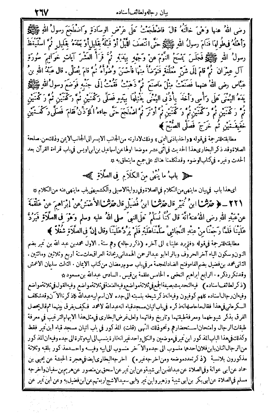 221 - (حَدثنَا ابْن نمير قَالَ حَدثنَا ابْن فُضَيْل قَالَ حَدثنَا الْأَعْمَش عَن إِبْرَاهِيم عَن عَلْقَمَة عَن عبد الله رَضِي الله عَنهُ أَنه قَالَ كُنَّا نسلم على النَّبِي - صَلَّى اللَّهُ عَلَيْهِ وَسَلَّم َ - وَهُوَ فِي الصَّلَاة فَيرد علينا فَلَمَّا رَجعْنَا من عِنْد النَّجَاشِيّ سلمنَا عَلَيْهِ فَلم يرد علينا وَقَالَ إِن فِي الصَّلَاة شغلا) مطابقته للتَّرْجَمَة فِي قَوْله " فَلم يرد علينا " إِلَى آخِره. (ذكر رِجَاله) وهم سِتَّة. الأول مُحَمَّد بن عبد الله بن نمير بِضَم النُّون وَسُكُون الْيَاء آخر الْحُرُوف وبالراء أَبُو عبد الرَّحْمَن الْهَمدَانِي رَيْحَانَة الْعرَاق مَاتَ سنة أَربع وَثَلَاثِينَ وَمِائَتَيْنِ. الثَّانِي مُحَمَّد بن فُضَيْل بِضَم الْفَاء وَفتح الضَّاد الْمُعْجَمَة مر فِي بَاب صَوْم رَمَضَان من كتاب الْإِيمَان. الثَّالِث سُلَيْمَان الْأَعْمَش وَقد تكَرر ذكره. الرَّابِع إِبْرَاهِيم النَّخعِيّ. الْخَامِس عَلْقَمَة بن قيس. السَّادِس عبد الله بن مَسْعُود (ذكر لطائف إِسْنَاده) فِيهِ التحديث بِصِيغَة الْجمع فِي ثَلَاثَة مَوَاضِع وَفِيه العنعنة فِي ثَلَاثَة مَوَاضِع وَفِيه القَوْل فِي ثَلَاثَة مَوَاضِع وَفِيه أَن رجال إِسْنَاده كلهم كوفيون وَفِيه أَنه ذكر شَيْخه بنسبته إِلَى جده لِأَن اسْم أَبِيه عبد الله كَمَا ذكرنَا الْآن وَقد تكلّف الْكرْمَانِي فِي هَذَا فَقَالَ مَا حَاصله أَنه ذكره فِي بَاب إتْيَان مَسْجِد قبَاء أَنه عبد الله لَا مُحَمَّد فَكيف يفرق بَينهمَا ثمَّ قَالَ يحصل الْفرق بِذكر شيوخهما وَمَعْرِفَة طبقتهما وتاريخ وفاتهما وَلَعَلَّ غَرَض البُخَارِيّ فِي مثل هَذَا الْإِبْهَام التَّرْغِيب فِي معرفَة طَبَقَات الرِّجَال وامتحان استحضارهم وَنَحْو ذَلِك انْتهى (قلت) الْمَذْكُور فِي بَاب إتْيَان مَسْجِد قبَاء ابْن نمير فَقَط وَكَذَلِكَ فِي هَذَا الْبَاب الْمَذْكُور ابْن نمير فِي موضِعين وَالْكل وَاحِد غير أَنه تَارَة ينْسب إِلَى أَبِيه وَتارَة إِلَى جده وَفِيه أَن الْمَذْكُور من الرِّجَال اثْنَان بِابْن فلَان أَحدهمَا مَنْسُوب إِلَى جده وَالْآخر مَنْسُوب إِلَى أَبِيه وَفِيه وَاحِد مَذْكُور بلقبه وَثَلَاثَة مذكورون بِلَا نِسْبَة. (ذكر تعدد مَوْضِعه وَمن أخرجه غَيره) أخرجه البُخَارِيّ أَيْضا فِي هِجْرَة الْحَبَشَة عَن يحيى بن حَمَّاد عَن أبي عوَانَة وَفِي الصَّلَاة عَن عبد الله بن أبي شيبَة وَعَن ابْن نمير عَن إِسْحَق بن مَنْصُور عَن هريم بن سُفْيَان وَأخرجه مُسلم فِي الصَّلَاة عَن أبي بكر بن أبي شيبَة وَزُهَيْر وَابْن نمير وَأبي سعيد الْأَشَج أربعتهم عَن ابْن فُضَيْل بِهِ وَعَن ابْن نمير عَن