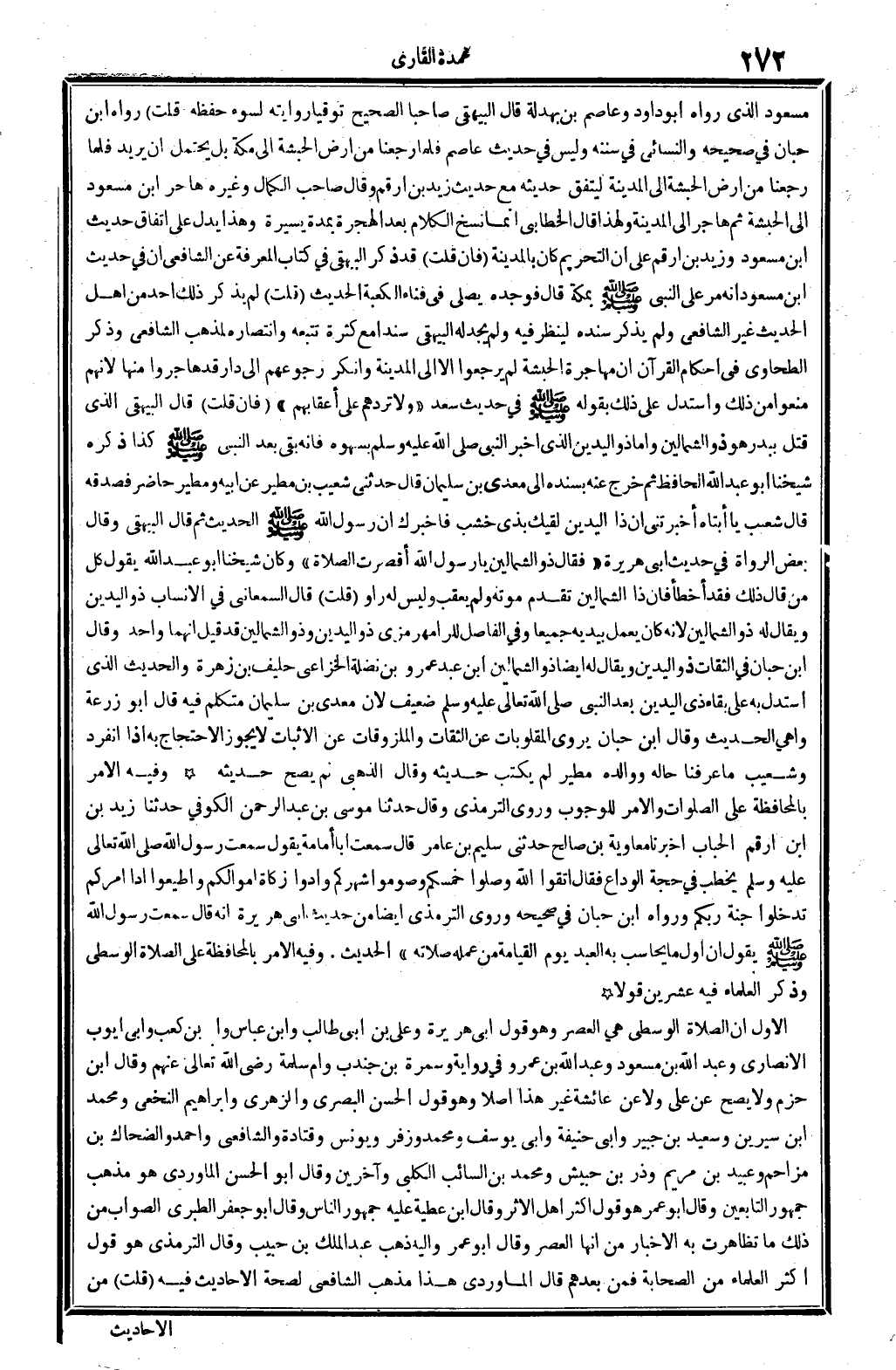 مَسْعُود الَّذِي رَوَاهُ أَبُو دَاوُد وَعَاصِم بن بَهْدَلَة قَالَ الْبَيْهَقِيّ صاحبا الصَّحِيح توقيا رِوَايَته لسوء حفظه (قلت) رَوَاهُ ابْن حبَان فِي صَحِيحه وَالنَّسَائِيّ فِي سنَنه وَلَيْسَ فِي حَدِيث عَاصِم فَلَمَّا رَجعْنَا من أَرض الْحَبَشَة إِلَى مَكَّة بل يحْتَمل أَن يُرِيد فَلَمَّا رَجعْنَا من أَرض الْحَبَشَة إِلَى الْمَدِينَة ليتفق حَدِيثه مَعَ حَدِيث زيد بن أَرقم وَقَالَ صَاحب الْكَمَال وَغَيره هَاجر ابْن مَسْعُود إِلَى الْحَبَشَة ثمَّ هَاجر إِلَى الْمَدِينَة وَلِهَذَا قَالَ الْخطابِيّ إِنَّمَا نسخ الْكَلَام بعد الْهِجْرَة بِمدَّة يسيرَة وَهَذَا يدل على اتِّفَاق حَدِيث ابْن مَسْعُود وَزيد بن أَرقم على أَن التَّحْرِيم كَانَ بِالْمَدِينَةِ (فَإِن قلت) قد ذكر الْبَيْهَقِيّ فِي كتاب الْمعرفَة عَن الشَّافِعِي أَن فِي حَدِيث ابْن مَسْعُود أَنه مر على النَّبِي - صَلَّى اللَّهُ عَلَيْهِ وَسَلَّم َ - بِمَكَّة قَالَ فَوَجَدَهُ يُصَلِّي فِي فنَاء الْكَعْبَة الحَدِيث (قلت) لم يذكر ذَلِك أحد من أهل الحَدِيث غير الشَّافِعِي وَلم يذكر سَنَده لينْظر فِيهِ وَلم يجد لَهُ الْبَيْهَقِيّ سندا مَعَ كَثْرَة تتبعه وانتصاره لمَذْهَب الشَّافِعِي وَذكر الطَّحَاوِيّ فِي أَحْكَام الْقُرْآن أَن مهاجرة الْحَبَشَة لم يرجِعوا إِلَّا إِلَى الْمَدِينَة وَأنكر رجوعهم إِلَى دَار قد هَاجرُوا مِنْهَا لأَنهم منعُوا من ذَلِك وَاسْتدلَّ على ذَلِك بقوله - صَلَّى اللَّهُ عَلَيْهِ وَسَلَّم َ - فِي حَدِيث سعد " وَلَا تردهم على أَعْقَابهم " (فَإِن قلت) قَالَ الْبَيْهَقِيّ الَّذِي قتل ببدر هُوَ ذُو الشمالين وَأما ذُو الْيَدَيْنِ الَّذِي أخبر النَّبِي - صَلَّى اللَّهُ عَلَيْهِ وَسَلَّم َ - بسهوه فَإِنَّهُ بَقِي بعد النَّبِي - صَلَّى اللَّهُ عَلَيْهِ وَسَلَّم َ - كَذَا ذكره شَيخنَا أَبُو عبد الله الْحَافِظ ثمَّ خرج عَنهُ بِسَنَدِهِ إِلَى معدي بن سُلَيْمَان قَالَ حَدثنِي شُعَيْب بن مطير عَن أَبِيه ومطير حَاضر فَصدقهُ قَالَ شُعَيْب يَا أبتاه أَخْبَرتنِي أَن ذَا الْيَدَيْنِ لقيك بِذِي خشب فأخبرك أَن رَسُول الله - صَلَّى اللَّهُ عَلَيْهِ وَسَلَّم َ - الحَدِيث ثمَّ قَالَ الْبَيْهَقِيّ وَقَالَ بعض الروَاة فِي حَدِيث أبي هُرَيْرَة " فَقَالَ ذُو الشمالين يَا رَسُول الله أقصرت الصَّلَاة " وَكَانَ شَيخنَا أَبُو عبد الله يَقُول كل من قَالَ ذَلِك فقد أَخطَأ فَإِن ذَا الشمالين تقدم مَوته وَلم يعقب وَلَيْسَ لَهُ راو (قلت) قَالَ السَّمْعَانِيّ فِي الْأَنْسَاب ذُو الْيَدَيْنِ وَيُقَال لَهُ ذُو الشمالين لِأَنَّهُ كَانَ يعْمل بيدَيْهِ جَمِيعًا وَفِي الْفَاصِل للرامهرمزي ذُو الْيَدَيْنِ وَذُو الشمالين قد قيل أَنَّهُمَا وَاحِد وَقَالَ ابْن حبَان فِي الثِّقَات ذُو الْيَدَيْنِ وَيُقَال لَهُ أَيْضا ذُو الشمالين ابْن عبد عَمْرو بن نَضْلَة الْخُزَاعِيّ حَلِيف بن زهرَة والْحَدِيث الَّذِي اسْتدلَّ بِهِ على بَقَاء ذِي الْيَدَيْنِ بعد النَّبِي - صَلَّى اللَّهُ عَلَيْهِ وَسَلَّم َ - ضَعِيف لِأَن معدي بن سُلَيْمَان مُتَكَلم فِيهِ قَالَ أَبُو زرْعَة واهي الحَدِيث وَقَالَ ابْن حبَان يروي المقلوبات عَن الثِّقَات والملزوقات عَن الْأَثْبَات لَا يجوز الِاحْتِجَاج بِهِ إِذا انْفَرد وَشُعَيْب مَا عرفنَا حَاله ووالده مطير لم يكْتب حَدِيثه وَقَالَ الذَّهَبِيّ لم يَصح حَدِيثه وَفِيه الْأَمر بالمحافظة على الصَّلَوَات وَالْأَمر للْوُجُوب وروى التِّرْمِذِيّ وَقَالَ حَدثنَا مُوسَى بن عبد الرَّحْمَن الْكُوفِي حَدثنَا زيد بن أَرقم الْحباب أخبرنَا مُعَاوِيَة بن صَالح حَدثنِي سليم بن عَامر قَالَ سَمِعت أَبَا أُمَامَة يَقُول سَمِعت رَسُول الله - صَلَّى اللَّهُ عَلَيْهِ وَسَلَّم َ - يخْطب فِي حجَّة الْوَدَاع فَقَالَ اتَّقوا الله وصلوا خمسكم وصوموا شهركم وأدوا زَكَاة أَمْوَالكُم وَأَطيعُو