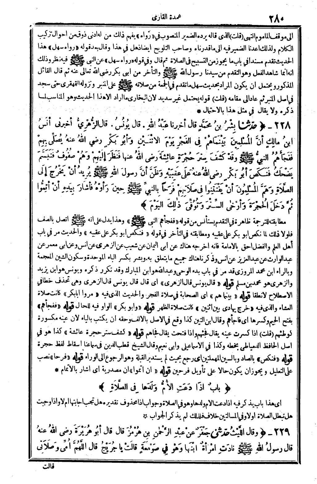 228 - (حَدثنَا بشر بن مُحَمَّد قَالَ أخبرنَا عبد الله. قَالَ يُونُس. قَالَ الزُّهْرِيّ أَخْبرنِي أنس بن مَالك أَن الْمُسلمين بَيْنَمَا هم فِي الْفجْر يَوْم الِاثْنَيْنِ وَأَبُو بكر رَضِي الله عَنهُ يُصَلِّي بهم ففجأهم النَّبِي - صَلَّى اللَّهُ عَلَيْهِ وَسَلَّم َ - وَقد كشف ستر حجرَة عَائِشَة رَضِي الله عَنْهَا فَنظر إِلَيْهِم وهم صُفُوف فَتَبَسَّمَ يضْحك فنكص أَبُو بكر رَضِي الله عَنهُ على عَقِبَيْهِ وَظن أَن رَسُول الله - صَلَّى اللَّهُ عَلَيْهِ وَسَلَّم َ - يُرِيد أَن يخرج إِلَى الصَّلَاة وهم الْمُسلمُونَ أَن يفتتنوا فِي صلَاتهم فَرحا بِالنَّبِيِّ - صَلَّى اللَّهُ عَلَيْهِ وَسَلَّم َ - حِين رَأَوْهُ فَأَشَارَ بِيَدِهِ أَن أَتموا ثمَّ دخل الْحُجْرَة وأرخى السّتْر وَتُوفِّي ذَلِك الْيَوْم) مطابقته للتَّرْجَمَة ظَاهِرَة فِي التَّقَدُّم يسْتَأْنس من قَوْله " ففجأهم النَّبِي - صَلَّى اللَّهُ عَلَيْهِ وَسَلَّم َ - " وَهَذَا يدل على أَنه - صَلَّى اللَّهُ عَلَيْهِ وَسَلَّم َ - اتَّصل بالصف فلولا ذَلِك لما نكص أَبُو بكر على عَقِبَيْهِ ومطابقته فِي التَّأَخُّر فِي قَوْله " فنكص أَبُو بكر على عَقِبَيْهِ " والْحَدِيث مر فِي بَاب أهل الْعلم وَالْفضل أَحَق بِالْإِمَامَةِ فَإِنَّهُ أخرجه هُنَاكَ عَن أبي الْيَمَان عَن شُعَيْب عَن الزُّهْرِيّ عَن أنس وَعَن أبي معمر عَن عبد الْوَارِث عَن عبد الْعَزِيز عَن أنس وَذكرنَا هُنَاكَ جَمِيع مَا يتَعَلَّق بِهِ. وَبشر بِكَسْر الْبَاء الْمُوَحدَة وَسُكُون الشين الْمُعْجَمَة وبالراء ابْن مُحَمَّد الْمروزِي قد مر فِي بَاب بَدْء الْوَحْي وَعبد الله هُوَ ابْن الْمُبَارك وَقد تكَرر ذكره وَيُونُس هُوَ ابْن يزِيد وَالزهْرِيّ هُوَ مُحَمَّد بن مُسلم قَوْله " قَالَ يُونُس قَالَ الزُّهْرِيّ " أَي قَالَ قَالَ يُونُس قَالَ الزُّهْرِيّ وَهِي تحذف خطأ فِي الِاصْطِلَاح لَا نطقا قَوْله " بَيْنَمَا هم " أَي الصَّحَابَة فِي صَلَاة الْفجْر والْحَدِيث الَّذِي فِيهِ " مروا أَبَا بكر " كَانَت صَلَاة الْعشَاء وَالَّذِي فِيهِ " خرج يهادي بَين اثْنَيْنِ " كَانَت صَلَاة الظّهْر قَوْله " وَأَبُو بكر " الْوَاو فِيهِ للْحَال قَوْله " ففجأهم " بِفَتْح الْجِيم وَكسرهَا أَي فاجأهم وَقَالَ ابْن التِّين كَذَا وَقع فِي الأَصْل بِالْألف وَحقه أَن يكْتب بِالْيَاءِ لِأَن عينه مَكْسُورَة كوطئهم (قلت) إِذا كسرت عينه يُقَال فَجِئَهُمْ وَإِذا فتحت يُقَال فجأهم قَوْله " كشف ستر حجرَة عَائِشَة " كَذَا هُوَ فِي أصل الْحَافِظ الدمياطي بِخَطِّهِ وَكَذَا فِي الْإِسْمَاعِيلِيّ وَأبي نعيم وَقَالَ الشَّيْخ قطب الدّين فِي سَمَاعنَا إِسْقَاط لفظ حجرَة قَوْله " فنكص " بالصَّاد وبالسين الْمُهْمَلَتَيْنِ أَي رَجَعَ بِحَيْثُ لم يستدبر الْقبْلَة وَهُوَ الرُّجُوع إِلَى الوراء قَوْله " فَرحا " نصب على التَّعْلِيل وَيجوز أَن يكون حَالا على تَأْوِيل فرحين قَوْله " أَن أَتموا " أَن مَصْدَرِيَّة أَي أَشَارَ بالإتمام
