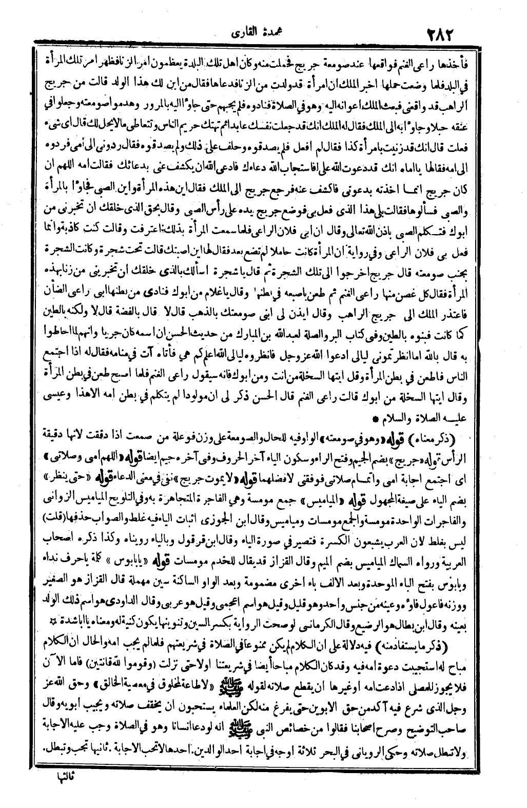 فَأَخذهَا راعي الْغنم فواقعها عِنْد صومعة جريج فَحملت مِنْهُ وَكَانَ أهل تِلْكَ الْبَلدة يعظمون أَمر الزِّنَا فَظهر أَمر تِلْكَ الْمَرْأَة فِي الْبَلَد فَلَمَّا وضعت حملهَا أخبر الْملك أَن امْرَأَة قد ولدت من الزِّنَا فَدَعَاهَا فَقَالَ من أَيْن لَك هَذَا الْوَلَد قَالَت من جريج الراهب قد واقعني فَبعث الْملك أعوانه إِلَيْهِ وَهُوَ فِي الصَّلَاة فَنَادَوْهُ فَلم يجبهم حَتَّى جَاءُوا إِلَيْهِ بالمرور وهدموا صومعته وَجعلُوا فِي عُنُقه حبلا وجاؤا بِهِ إِلَى الْملك فَقَالَ لَهُ الْملك إِنَّك قد جعلت نَفسك عابدا ثمَّ تهتك حَرِيم النَّاس وتتعاطى مَا لَا يحل لَك قَالَ أَي شَيْء فعلت قَالَ إِنَّك قد زَنَيْت بِامْرَأَة كَذَا فَقَالَ لم أفعل فَلم يصدقوه وَحلف على ذَلِك وَلم يصدقوه فَقَالَ ردوني إِلَى أُمِّي فَردُّوهُ إِلَى أمه فَقَالَ لَهَا يَا أُمَّاهُ إِنَّك قد دَعَوْت الله عَليّ أفاستجاب الله دعاءك فادعي الله أَن يكْشف عني بدعائك فَقَالَت أمه اللَّهُمَّ إِن كَانَ جريج إِنَّمَا أَخَذته بدعوتي فاكشف عَنهُ فَرجع جريج إِلَى الْملك فَقَالَ أَيْن هَذِه الْمَرْأَة وَأَيْنَ الصَّبِي فجاؤا بِالْمَرْأَةِ وَالصَّبِيّ فَسَأَلُوهَا فَقَالَت بلَى هَذَا الَّذِي فعل بِي فَوضع جريج يَده على رَأس الصَّبِي وَقَالَ بِحَق الَّذِي خلق أَن تُخبرنِي من أَبوك فَتكلم الصَّبِي بِإِذن الله تَعَالَى وَقَالَ إِن أبي فلَان الرَّاعِي فَلَمَّا سَمِعت الْمَرْأَة بذلك اعْترفت وَقَالَت كنت كَاذِبَة وَإِنَّمَا فعل بِي فلَان الرَّاعِي وَفِي رِوَايَة أَن الْمَرْأَة كَانَت حَامِلا لم تضع بعد فَقَالَ لَهَا أَيْن أصبتك قَالَت تَحت شَجَرَة وَكَانَت الشَّجَرَة بِجنب صومعته قَالَ جريج أخرجُوا إِلَى تِلْكَ الشَّجَرَة ثمَّ قَالَ يَا شَجَرَة أَسأَلك بِالَّذِي خلقك أَن تخبريني من زنا بِهَذِهِ الْمَرْأَة فَقَالَ كل غُصْن مِنْهَا راعي الْغنم ثمَّ طعن بِأُصْبُعِهِ فِي بَطنهَا وَقَالَ يَا غُلَام من أَبوك فَنَادَى من بَطنهَا أبي راعي الضَّأْن فَاعْتَذر الْملك إِلَى جريج الراهب وَقَالَ إيذن لي ابْني صومعتك بِالذَّهَب قَالَ لَا قَالَ بِالْفِضَّةِ قَالَ لَا وَلكنه بالطين كَمَا كَانَت فبنوه بالطين وَفِي كتاب الْبر والصلة لعبد الله بن الْمُبَارك من حَدِيث الْحسن أَن اسْمه كَانَ جَريا وَأَنَّهُمْ لما أحاطوا بِهِ قَالَ بِاللَّه أما أنظرتموني ليَالِي أدعوا الله عز وَجل فأنظروه ليَالِي الله أعلم كم هِيَ فَأَتَاهُ آتٍ فِي مَنَامه فَقَالَ لَهُ إِذا اجْتمع النَّاس فاطعن فِي بطن الْمَرْأَة وَقل أيتها السخلة من أَنْت وَمن أَبوك فَإِنَّهُ سَيَقُولُ راعي الْغنم فَلَمَّا أصبح طعن فِي بطن الْمَرْأَة وَقَالَ أيتها السخلة من أَبوك قَالَت راعي الْغنم قَالَ الْحسن ذكر لي أَن مولودا لم يتَكَلَّم فِي بطن أمه إِلَّا هَذَا وَعِيسَى عَلَيْهِ الصَّلَاة وَالسَّلَام (ذكر مَعْنَاهُ) قَوْله " وَهُوَ فِي صومته " الْوَاو فِيهِ للْحَال والصومعة على وزن فوعلة من صمعت إِذا دققت لِأَنَّهَا دقيقة الرَّأْس قَوْله " جريج " بِضَم الْجِيم وَفتح الرَّاء وَسُكُون الْيَاء آخر الْحُرُوف وَفِي آخِره جِيم أَيْضا قَوْله " اللَّهُمَّ أُمِّي وصلاتي " أَي اجْتمع إِجَابَة أُمِّي وإتمام صَلَاتي فوفقني لأفضلهما قَوْله " لَا يَمُوت جريج " نفي فِي معنى الدُّعَاء قَوْله " حَتَّى ينظر " بِضَم الْيَاء على صِيغَة الْمَجْهُول قَوْله " المياميس " جمع مومسة وَهِي الْفَاجِرَة المتجاهرة بِهِ وَفِي التَّلْوِيح المياميس الزواني والفاجرات الْوَاحِدَة مومسة وَالْجمع مومسات ومياميس وَقَالَ ابْن الْجَوْزِيّ إِثْبَات الْيَاء فِيهِ غلط وَالصَّوَاب حذفهَا (قلت) لَيْسَ بغلط لِأَن الْعَرَب يشبعون الكسرة فَتَصِير فِي صُورَة الْيَاء وَقَالَ ابْن قرقول وبالياء روينَا وَكَذَا ذكره أَصْحَاب الْعَرَبيَّة وَرَوَاهُ السماك المياميس بِضَم الْمِ