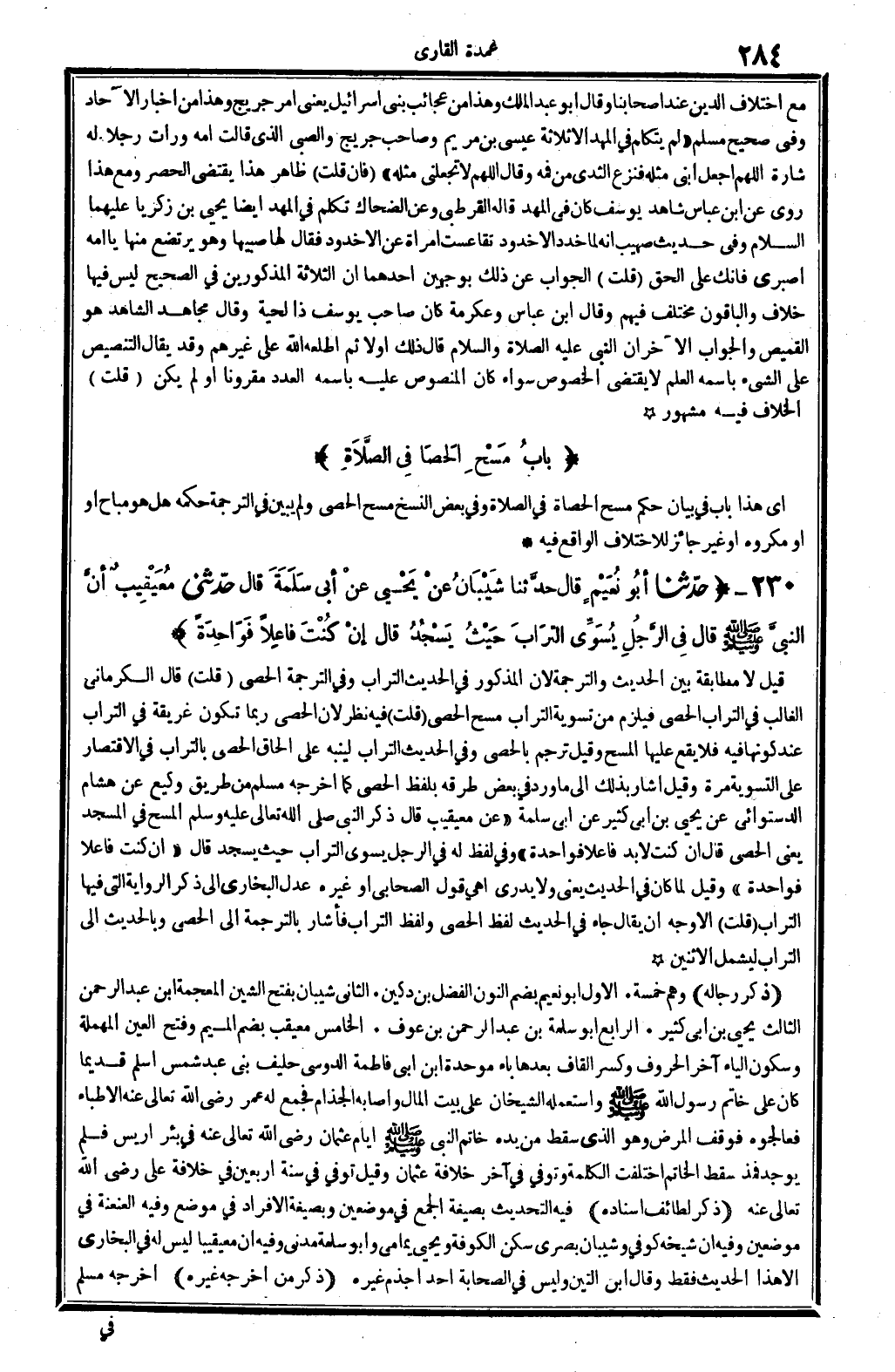 230 - (حَدثنَا أَبُو نعيم قَالَ حَدثنَا شَيبَان عَن يحيى عَن أبي سَلمَة قَالَ حَدثنِي معيقيب أَن النَّبِي - صَلَّى اللَّهُ عَلَيْهِ وَسَلَّم َ - قَالَ فِي الرجل يُسَوِّي التُّرَاب حَيْثُ يسْجد قَالَ إِن كنت فَاعِلا فَوَاحِدَة) قيل لَا مُطَابقَة بَين الحَدِيث والترجمة لِأَن الْمَذْكُور فِي الحَدِيث التُّرَاب وَفِي التَّرْجَمَة الْحَصَى (قلت) قَالَ الْكرْمَانِي الْغَالِب فِي التُّرَاب الْحَصَى فَيلْزم من تَسْوِيَة التُّرَاب مسح الْحَصَى (قلت) فِيهِ نظر لِأَن الْحَصَى رُبمَا تكون غريقة فِي التُّرَاب عِنْد كَونهَا فِيهِ فَلَا يَقع عَلَيْهَا الْمسْح وَقيل ترْجم بالحصى وَفِي الحَدِيث التُّرَاب لينبه على إِلْحَاق الْحَصَى بِالتُّرَابِ فِي الِاقْتِصَار على التَّسْوِيَة مرّة وَقيل أَشَارَ بذلك إِلَى مَا ورد فِي بعض طرقه بِلَفْظ الْحَصَى كَمَا أخرجه مُسلم من طَرِيق وَكِيع عَن هِشَام الدستوَائي عَن يحيى بن أبي كثير عَن أبي سَلمَة " عَن معيقيب قَالَ ذكر النَّبِي - صَلَّى اللَّهُ عَلَيْهِ وَسَلَّم َ - الْمسْح فِي الْمَسْجِد يَعْنِي الْحَصَى قَالَ إِن كنت لَا بُد فَاعِلا فَوَاحِدَة " وَفِي لفظ لَهُ فِي الرجل يُسَوِّي التُّرَاب حَيْثُ يسْجد قَالَ " إِن كنت فَاعِلا فَوَاحِدَة " وَقيل لما كَانَ فِي الحَدِيث يَعْنِي وَلَا يدْرِي أَهِي قَول الصَّحَابِيّ أَو غَيره عدل البُخَارِيّ إِلَى ذكر الرِّوَايَة الَّتِي فِيهَا التُّرَاب (قلت) الْأَوْجه أَن يُقَال جَاءَ فِي الحَدِيث لفظ الْحَصَى وَلَفظ التُّرَاب فَأَشَارَ بالترجمة إِلَى الْحَصَى وَبِالْحَدِيثِ إِلَى التُّرَاب ليشْمل الِاثْنَيْنِ (ذكر رِجَاله) وهم خَمْسَة. الأول أَبُو نعيم بِضَم النُّون الْفضل بن دُكَيْن. الثَّانِي شَيبَان بِفَتْح الشين الْمُعْجَمَة ابْن عبد الرَّحْمَن. الثَّالِث يحيى بن أبي كثير. الرَّابِع أَبُو سَلمَة بن عبد الرَّحْمَن بن عَوْف. الْخَامِس معيقب بِضَم الْمِيم وَفتح الْعين الْمُهْملَة وَسُكُون الْيَاء آخر الْحُرُوف وَكسر الْقَاف بعْدهَا بَاء مُوَحدَة ابْن أبي فَاطِمَة الدوسي حَلِيف بني عبد شمس أسلم قَدِيما كَانَ على خَاتم رَسُول الله - صَلَّى اللَّهُ عَلَيْهِ وَسَلَّم َ - وَاسْتَعْملهُ الشَّيْخَانِ على بَيت المَال وأصابه الجذام فَجمع لَهُ عمر رَضِي الله تَعَالَى عَنهُ الْأَطِبَّاء فعالجوه فَوقف الْمَرَض وَهُوَ الَّذِي سقط من يَده خَاتم النَّبِي - صَلَّى اللَّهُ عَلَيْهِ وَسَلَّم َ - أَيَّام عُثْمَان رَضِي الله تَعَالَى عَنهُ فِي بِئْر أريس فَلم يُوجد فمذ سقط الْخَاتم اخْتلفت الْكَلِمَة وَتُوفِّي فِي آخر خلَافَة عُثْمَان وَقيل توفّي فِي سنة أَرْبَعِينَ فِي خلَافَة عَليّ رَضِي الله تَعَالَى عَنهُ (ذكر لطائف إِسْنَاده) فِيهِ التحديث بِصِيغَة الْجمع فِي موضِعين وبصيغة الْإِفْرَاد فِي مَوضِع وَفِيه العنعنة فِي موضِعين وَفِيه أَن شَيْخه كُوفِي وشيبان بَصرِي سكن الْكُوفَة وَيحيى يمامي وَأَبُو سَلمَة مدنِي وَفِيه أَن معيقيبا لَيْسَ لَهُ فِي البُخَارِيّ إِلَّا هَذَا الحَدِيث فَقَط وَقَالَ ابْن التِّين وَلَيْسَ فِي الصَّحَابَة أحد أَجْذم غَيره (ذكر من أخرجه غَيره) أخرجه مُسلم