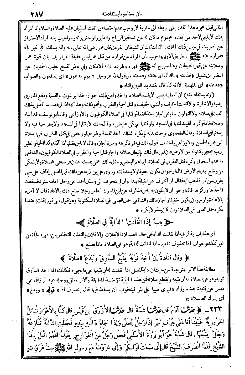 الثَّانِي قيل مُجَرّد هَذَا الْقدر يَعْنِي ربطه إِلَى سَارِيَة لَا يُوجب عدم اخْتِصَاص الْملك لِسُلَيْمَان عَلَيْهِ الصَّلَاة وَالسَّلَام إِذْ المُرَاد بِملك لَا يَنْبَغِي لأحد من بعده مَجْمُوع مَا كَانَ لَهُ من تسخير الرِّيَاح وَالطير والوحش وَنَحْوه وَأجِيب بِأَنَّهُ أَرَادَ الِاحْتِرَاز عَن الشَّرِيك فِي جنس ذَلِك الْملك. الثَّالِث ثَبت أَن الشَّيْطَان يفر من ظلّ عمر رَضِي الله تَعَالَى عَنهُ وَأَنه يسْلك فجا غير فجه ففراره عَنهُ - صَلَّى اللَّهُ عَلَيْهِ وَسَلَّم َ - بِالطَّرِيقِ الأولى وَأجِيب بِأَن المُرَاد من فراره من ظلّ عمر لَيْسَ حَقِيقَة الْفِرَار بل بَيَان قُوَّة عمر وصلابته على قهر الشَّيْطَان وَهنا صَرِيح أَنه - صَلَّى اللَّهُ عَلَيْهِ وَسَلَّم َ - قهره وطرده غَايَة الْإِمْكَان وَفِي بعض النّسخ عقيب الحَدِيث عَن النّظر من شُمَيْل " فذعته " بِالذَّالِ أَي خنقته وفدعته من قَول الله عز وَجل {يَوْم يدعونَ} أَي يدْفَعُونَ وَالصَّوَاب " فدعته " أَي بِالْمُهْمَلَةِ إِلَّا أَنه كَذَا قَالَ بتَشْديد الْعين وَالتَّاء (وَمِمَّا يُسْتَفَاد مِنْهُ) أَن الْعَمَل الْيَسِير لَا يفْسد الصَّلَاة وَأخذُوا من ذَلِك جَوَاز أَخذ البرغوث والقملة وَدفع الْمَار بَين يَدَيْهِ وَالْإِشَارَة والالتفات الْخَفِيف وَالْمَشْي الْخَفِيف وَقتل الْحَيَّة وَالْعَقْرَب وَنَحْو ذَلِك وَهَذَا كُله إِذا لم يقْصد الْمُصَلِّي بذلك الْعَبَث فِي صلَاته وَلَا التهاون بهَا وَمِمَّنْ أجَاز أَخذ القملة وقتلها فِي الصَّلَاة الْكُوفِيُّونَ وَالْأَوْزَاعِيّ وَقَالَ أَبُو يُوسُف قد أَسَاءَ وَصلَاته تَامَّة وَكره اللَّيْث قَتلهَا فِي الْمَسْجِد وَلَو قَتلهَا لم يكن عَلَيْهِ شَيْء وَقَالَ مَالك لَا يَقْتُلهَا فِي الْمَسْجِد وَلَا يَطْرَحهَا فِيهِ وَلَا يدفنها فِي الصَّلَاة وَقَالَ الطَّحَاوِيّ لَو حك بدنه لم يكره كَذَلِك أَخذ القملة وطرحها وَرخّص فِي قتل الْعَقْرَب فِي الصَّلَاة ابْن عمر وَالْحسن وَالْأَوْزَاعِيّ وَاخْتلف قَول مَالك فِيهِ فَمرَّة كرهه وَمرَّة أجَازه وَقَالَ لَا بَأْس بقتلها إِذا آذته وَكَذَا الْحَيَّة وَالطير يرميه بِحجر يتَنَاوَلهُ من الأَرْض فَإِن لم يطلّ ذَلِك لم تبطل صلَاته وَأَجَازَ قتل الْحَيَّة وَالْعَقْرَب فِي الصَّلَاة الْكُوفِيُّونَ وَالشَّافِعِيّ وَأحمد وَإِسْحَاق وَكره قتل الْعَقْرَب فِي الصَّلَاة إِبْرَاهِيم النَّخعِيّ وَسُئِلَ مَالك عَمَّن يمسك عنان فرسه فِي الصَّلَاة وَلَا يتَمَكَّن من وضع يَدَيْهِ بِالْأَرْضِ قَالَ أَرْجُو أَن يكون خَفِيفا وَلَا يبعد ذَلِك وروى عَليّ بن زِيَاد عَن مَالك فِي الْمُصَلِّي يخَاف على صبي يقرب من نَار فَذهب إِلَيْهِ فَقَالَ إِن انحرف عَن الْقبْلَة ابتدا وَإِن لم ينحرف بنى وَسُئِلَ أَحْمد عَن رجل أَمَامه ستْرَة فَسَقَطت فَأَخذهَا وركزها قَالَ أَرْجُو أَن لَا يكون بِهِ بَأْس فَذكر لَهُ عَن ابْن الْمُبَارك أَنه أَمر رجلا صنع ذَلِك بِالْإِعَادَةِ قَالَ لَا آمره بِالْإِعَادَةِ وَأَرْجُو أَن يكون خَفِيفا وَأَجَازَ مَالك وَالشَّافِعِيّ حمل الصَّبِي فِي الصَّلَاة الْمَكْتُوبَة وَهُوَ قَول أبي ثَوْر (قلت) عندنَا يكره حمل الصَّبِي فِي الصَّلَاة وَإِن كَانَ بِعُذْر لَا يكره