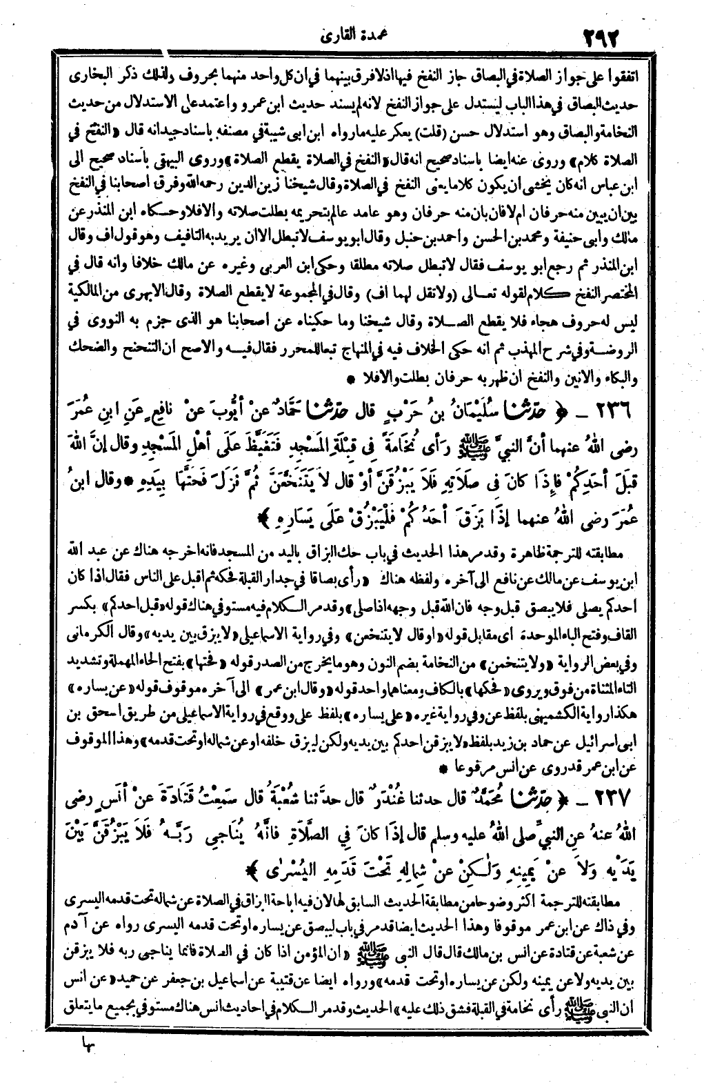 236 - (حَدثنَا سُلَيْمَان بن حَرْب قَالَ حَدثنَا حَمَّاد عَن أَيُّوب عَن نَافِع عَن ابْن عمر رَضِي الله عَنْهُمَا أَن النَّبِي - صَلَّى اللَّهُ عَلَيْهِ وَسَلَّم َ - رأى نخامة فِي قبْلَة الْمَسْجِد فتغيظ على أهل الْمَسْجِد وَقَالَ إِن الله قبل أحدكُم فَإِذا كَانَ فِي صلَاته فَلَا يبزقن أَو قَالَ لَا يتنخعن ثمَّ نزل فحتها بِيَدِهِ وَقَالَ ابْن عمر رَضِي الله عَنْهُمَا إِذا بزق أحدكُم فليبزق على يسَاره) مطابقته للتَّرْجَمَة ظَاهِرَة وَقد مر هَذَا الحَدِيث فِي بَاب حك البزاق بِالْيَدِ من الْمَسْجِد فَإِنَّهُ أخرجه هُنَاكَ عَن عبد الله بن يُوسُف عَن مَالك عَن نَافِع إِلَى آخِره وَلَفظه هُنَاكَ " رأى بصاقا فِي جِدَار الْقبْلَة فحكه ثمَّ أقبل على النَّاس فَقَالَ إِذا كَانَ أحدكُم يُصَلِّي فَلَا يبصق قبل وَجه فَإِن الله قبل وَجهه إِذا صلى " وَقد مر الْكَلَام فِيهِ مُسْتَوفى هُنَاكَ قَوْله " قبل أحدكُم " بِكَسْر الْقَاف وَفتح الْبَاء الْمُوَحدَة أَي مُقَابل قَوْله " أَو قَالَ لَا يتنخعن " وَفِي رِوَايَة الْإِسْمَاعِيلِيّ " لَا يبزق بَين يَدَيْهِ " وَقَالَ الْكرْمَانِي وَفِي بعض الرِّوَايَة " وَلَا يتنخمن " من النخامة بِضَم النُّون وَهُوَ مَا يخرج من الصَّدْر قَوْله " فحتها " بِفَتْح الْحَاء الْمُهْملَة وَتَشْديد التَّاء الْمُثَنَّاة من فَوق ويروى " فحكها " بِالْكَاف ومعناهما وَاحِد قَوْله " وَقَالَ ابْن عمر " إِلَى آخِره مَوْقُوف قَوْله " عَن يسَاره " هَكَذَا رِوَايَة الْكشميهني بِلَفْظ عَن وَفِي رِوَايَة غَيره " على يسَاره " بِلَفْظ على وَوَقع فِي رِوَايَة الْإِسْمَاعِيلِيّ من طَرِيق اسحق بن أبي إِسْرَائِيل عَن حَمَّاد بن زيد بِلَفْظ " لَا يبزقن أحدكُم بَين يَدَيْهِ وَلَكِن ليبزق خَلفه أَو عَن شِمَاله أَو تَحت قدمه " وَهَذَا الْمَوْقُوف عَن ابْن عمر قد رُوِيَ عَن أنس مَرْفُوعا