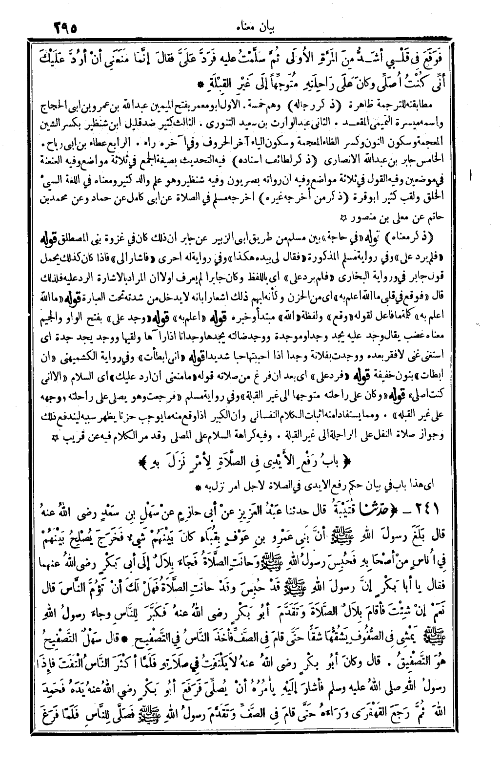 241 - (حَدثنَا قُتَيْبَة قَالَ حَدثنَا عبد الْعَزِيز عَن أبي حَازِم عَن سهل بن سعد رَضِي الله عَنهُ قَالَ بلغ رَسُول الله - صَلَّى اللَّهُ عَلَيْهِ وَسَلَّم َ - أَن بني عَمْرو بن عَوْف بقباء كَانَ بَينهم شَيْء فَخرج يصلح بَينهم فِي أنَاس من أَصْحَابه فحبس رَسُول الله - صَلَّى اللَّهُ عَلَيْهِ وَسَلَّم َ - وحانت الصَّلَاة فجَاء بِلَال إِلَى أبي بكر رَضِي الله عَنْهُمَا فَقَالَ يَا أَبَا بكر إِن رَسُول الله - صَلَّى اللَّهُ عَلَيْهِ وَسَلَّم َ - قد حبس وَقد حانت الصَّلَاة فَهَل لَك أَن تؤم النَّاس قَالَ نعم إِن شِئْت فَأَقَامَ بِلَال الصَّلَاة وَتقدم أَبُو بكر رَضِي الله عَنهُ فَكبر للنَّاس وَجَاء رَسُول الله - صَلَّى اللَّهُ عَلَيْهِ وَسَلَّم َ - يمشي فِي الصُّفُوف يشقها شقا حَتَّى قَامَ فِي الصَّفّ فَأخذ النَّاس فِي التصفيح قَالَ سهل التصفيح هُوَ التصفيق. قَالَ وَكَانَ أَبُو بكر رَضِي الله عَنهُ لَا يلْتَفت فِي صلَاته فَلَمَّا أَكثر النَّاس الْتفت فَإِذا رَسُول الله - صَلَّى اللَّهُ عَلَيْهِ وَسَلَّم َ - فَأَشَارَ إِلَيْهِ يَأْمُرهُ أَن يُصَلِّي فَرفع أَبُو بكر رَضِي الله عِنْده يَده فَحَمدَ الله ثمَّ رَجَعَ الْقَهْقَرِي وَرَاءه حَتَّى قَامَ فِي الصَّفّ وَتقدم رَسُول الله - صَلَّى اللَّهُ عَلَيْهِ وَسَلَّم َ - فصلى للنَّاس فَلَمَّا فرغ