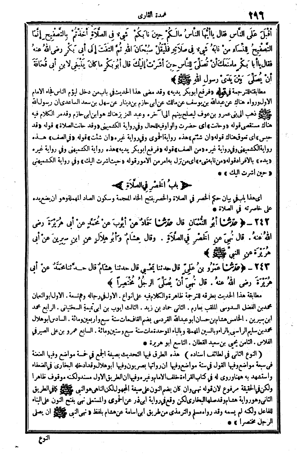 243 - (حَدثنَا عَمْرو بن عَليّ قَالَ حَدثنَا يحيى قَالَ حَدثنَا هِشَام قَالَ حَدثنَا مُحَمَّد عَن أبي هُرَيْرَة رَضِي الله عَنهُ. قَالَ نهي أَن يُصَلِّي الرجل مُخْتَصرا) مُطَابقَة هَذَا الحَدِيث بِطرقِهِ للتَّرْجَمَة ظَاهِرَة وَالْكَلَام فِيهِ على أَنْوَاع. الأول فِي رِجَاله وهم تِسْعَة. الأول أَبُو النُّعْمَان مُحَمَّد بن الْفضل السدُوسِي الملقب بعارم. الثَّانِي حَمَّاد بن زيد. الثَّالِث أَيُّوب بن أبي تَمِيمَة السّخْتِيَانِيّ. الرَّابِع مُحَمَّد بن سِيرِين. الْخَامِس هِشَام بن حسان أَبُو عبد الله القردسي بِضَم الْقَاف مَاتَ سنة سبع وَأَرْبَعين وَمِائَة. السَّادِس أَبُو هِلَال مُحَمَّد بن سليم الرَّاسِبِي بالراء وبالسين الْمُهْملَة وبالباء الْمُوَحدَة مَاتَ سنة سبع وَسِتِّينَ وَمِائَة. السَّابِع عَمْرو بن عَليّ الصَّيْرَفِي الفلاس. الثَّامِن يحيى بن سعيد الْقطَّان. التَّاسِع أَبُو هُرَيْرَة (النَّوْع الثَّانِي فِي لطائف إِسْنَاده) هَذِه الطّرق فِيهَا التحديث بِصِيغَة الْجمع فِي خَمْسَة مَوَاضِع وفيهَا العنعنة فِي سَبْعَة مَوَاضِع وفيهَا القَوْل فِي سِتَّة مَوَاضِع وفيهَا أَن رواتها بصريون وفيهَا أَبُو هِلَال وَقد أدخلهُ البُخَارِيّ فِي الضُّعَفَاء وَاسْتشْهدَ بِهِ هَهُنَا وَرُوِيَ لَهُ فِي كتاب الْقِرَاءَة خلف الإِمَام وَغَيره وفيهَا أَن الطَّرِيق الأول مُسْند وَلكنه مَوْقُوف ظَاهرا وَلَكِن فِي الْحَقِيقَة مَرْفُوع لِأَن قَوْله نهي وَإِن كَانَ بِضَم النُّون على صِيغَة الْمَجْهُول لَكِن الناهي هُوَ النَّبِي - صَلَّى اللَّهُ عَلَيْهِ وَسَلَّم َ - كَمَا فِي الطَّرِيق الثَّانِي وَهُوَ رِوَايَة هِشَام وَقد صلها البُخَارِيّ لَكِن وَقع فِي رِوَايَة أبي ذَر عَن الْحَمَوِيّ وَالْمُسْتَمْلِي نهى بِفَتْح النُّون على الْبناء للْفَاعِل وَلكنه لم يسمه وَقد رَوَاهُ مُسلم وَالتِّرْمِذِيّ من طَرِيق أبي أُسَامَة عَن هِشَام بِلَفْظ " نهى النَّبِي - صَلَّى اللَّهُ عَلَيْهِ وَسَلَّم َ - أَن يُصَلِّي الرجل مُخْتَصرا "