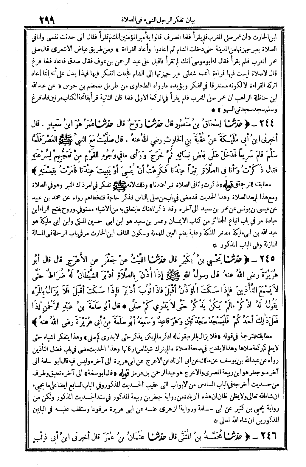 244 - (حَدثنَا إِسْحَاق بن مَنْصُور قَالَ حَدثنَا روح قَالَ حَدثنَا عمر هُوَ ابْن سعيد. قَالَ أَخْبرنِي ابْن أبي مليكَة عَن عقبَة بن الْحَارِث رَضِي الله عَنهُ. قَالَ صليت مَعَ النَّبِي - صَلَّى اللَّهُ عَلَيْهِ وَسَلَّم َ - الْعَصْر فَلَمَّا سلم قَامَ سَرِيعا فَدخل على بعض نِسَائِهِ ثمَّ خرج وَرَأى مَا فِي وُجُوه الْقَوْم من تعجبهم لسرعته فَقَالَ ذكرت وَأَنا فِي الصَّلَاة تبرا عندنَا فَكرِهت أَن يُمْسِي أَو يبيت عندنَا فَأمرت بقسمته) مطابقته للتَّرْجَمَة فِي قَوْله " ذكرت وَأَنا فِي الصَّلَاة تبرا عندنَا " وَذَلِكَ لِأَنَّهُ - صَلَّى اللَّهُ عَلَيْهِ وَسَلَّم َ - تفكر فِي أَمر ذَاك التبر وَهُوَ فِي الصَّلَاة وَمَعَ هَذَا لم يعد الصَّلَاة وَهَذَا الحَدِيث قد مضى فِي بَاب من صلى بِالنَّاسِ فَذكر حَاجَة فتخطاهم رَوَاهُ عَن مُحَمَّد بن عبيد عَن عِيسَى بن يُونُس عَن عمر بن سعيد إِلَى آخِره وَقد ذكرنَا هُنَاكَ مَا يتَعَلَّق بِهِ من الْأَشْيَاء مُسْتَوْفِي. وروح بِفَتْح الرَّاء ابْن عبَادَة مر فِي بَاب اتِّبَاع الْجَنَائِز من كتاب الْإِيمَان وَعمر بن سعيد هُوَ ابْن أبي حُسَيْن الْمَكِّيّ وَابْن أبي مليكَة هُوَ عبد الله بن أبي مليكَة مصغر الملكة وَعقبَة بِضَم الْعين الْمُهْملَة وَسُكُون الْقَاف ابْن الْحَارِث مر فِي بَاب الرحلة فِي الْمَسْأَلَة النَّازِلَة وَفِي الْبَاب الْمَذْكُور.