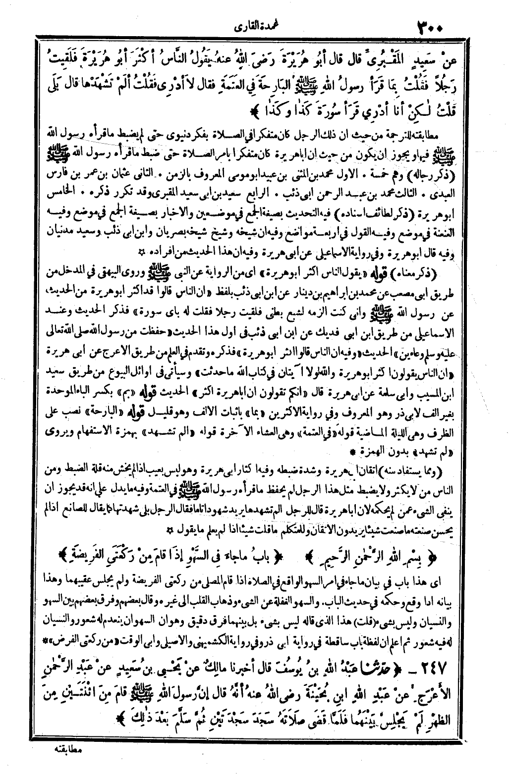 عَن سعيد المَقْبُري قَالَ قَالَ أَبُو هُرَيْرَة رَضِي الله عَنهُ يَقُول النَّاس أَكثر أَبُو هُرَيْرَة فَلَقِيت رجلا فَقلت بِمَا قَرَأَ رَسُول الله - صَلَّى اللَّهُ عَلَيْهِ وَسَلَّم َ - البارحة فِي الْعَتَمَة فَقَالَ لَا أَدْرِي فَقلت ألم تشهدها قَالَ بلَى قلت لَكِن أَنا أَدْرِي قَرَأَ سُورَة كَذَا وَكَذَا) مطابقته للتَّرْجَمَة من حَيْثُ أَن ذَلِك الرجل كَانَ متفكرا فِي الصَّلَاة بفكر دُنْيَوِيّ حَتَّى لم يضْبط مَا قَرَأَهُ رَسُول الله - صَلَّى اللَّهُ عَلَيْهِ وَسَلَّم َ - فِيهَا وَيجوز أَن يكون من حَيْثُ أَن أَبَا هُرَيْرَة كَانَ متفكرا بِأَمْر الصَّلَاة حَتَّى ضبط مَا قَرَأَهُ رَسُول الله - صَلَّى اللَّهُ عَلَيْهِ وَسَلَّم َ -. (ذكر رِجَاله) وهم خَمْسَة. الأول مُحَمَّد بن الْمثنى بن عبيد أَبُو مُوسَى الْمَعْرُوف بالزمن. الثَّانِي عُثْمَان بن عمر بن فَارس الْعَبْدي. الثَّالِث مُحَمَّد بن عبد الرَّحْمَن أبي ذِئْب. الرَّابِع سعيد بن أبي سعيد المَقْبُري وَقد تكَرر ذكره. الْخَامِس أَبُو هُرَيْرَة. (ذكر لطائف إِسْنَاده) فِيهِ التحديث بِصِيغَة الْجمع فِي موضِعين والإخبار بِصِيغَة الْجمع فِي مَوضِع وَفِيه العنعنة فِي مَوضِع وَفِيه القَوْل فِي أَرْبَعَة مَوَاضِع وَفِيه أَن شَيْخه وَشَيخ شَيْخه بصريان وَابْن أبي ذِئْب وَسَعِيد مدنيان وَفِيه قَالَ أَبُو هُرَيْرَة وَفِي رِوَايَة الْإِسْمَاعِيلِيّ عَن أبي هُرَيْرَة وَفِيه أَن هَذَا الحَدِيث من أَفْرَاده. (ذكر مَعْنَاهُ) قَوْله " يَقُول النَّاس أَكثر أَبُو هُرَيْرَة " أَي من الرِّوَايَة عَن النَّبِي - صَلَّى اللَّهُ عَلَيْهِ وَسَلَّم َ - وروى الْبَيْهَقِيّ فِي الْمدْخل من طَرِيق أبي مُصعب عَن مُحَمَّد بن إِبْرَاهِيم بن دِينَار عَن ابْن أبي ذِئْب بِلَفْظ " أَن النَّاس قَالُوا قد أَكثر أَبُو هُرَيْرَة من الحَدِيث عَن رَسُول الله - صَلَّى اللَّهُ عَلَيْهِ وَسَلَّم َ - وَإِنِّي كنت ألزمهُ لشبع بَطْني فَلَقِيت رجلا فَقلت لَهُ بِأَيّ سُورَة " فَذكر الحَدِيث وَعند الْإِسْمَاعِيلِيّ من طَرِيق ابْن أبي فديك عَن ابْن أبي ذِئْب فِي أول هَذَا الحَدِيث " حفظت من رَسُول الله - صَلَّى اللَّهُ عَلَيْهِ وَسَلَّم َ - وعاءين " الحَدِيث " وَفِيه أَن النَّاس قَالُوا أَكثر أَبُو هُرَيْرَة " فَذكره وَتقدم فِي الْعلم من طَرِيق الْأَعْرَج عَن أبي هُرَيْرَة " أَن النَّاس يَقُولُونَ أَكثر أَبُو هُرَيْرَة وَالله لَوْلَا آيتان فِي كتاب الله مَا حدثت " وَسَيَأْتِي فِي أَوَائِل الْبيُوع من طَرِيق سعيد ابْن الْمسيب وَأبي سَلمَة عَن أبي هُرَيْرَة قَالَ " إِنَّكُم تَقولُونَ أَن أَبَا هُرَيْرَة أَكثر " الحَدِيث قَوْله " بِمَ " بِكَسْر الْبَاء الْمُوَحدَة بِغَيْر ألف لأبي ذَر وَهُوَ الْمَعْرُوف وَفِي رِوَايَة الْأَكْثَرين " بِمَا " بِإِثْبَات الْألف وَهُوَ قَلِيل قَوْله " البارحة " نصب على الظّرْف وَهِي اللَّيْلَة الْمَاضِيَة قَوْله " فِي الْعَتَمَة " وَهِي الْعشَاء الْآخِرَة قَوْله " ألم تشهد " بِهَمْزَة الِاسْتِفْهَام ويروى " لم تشهد " بِدُونِ الْهمزَة (وَمِمَّا يُسْتَفَاد مِنْهُ) إتقان أبي هُرَيْرَة وَشدَّة ضَبطه وَفِيه إكثار أبي هُرَيْرَة وَهُوَ لَيْسَ بِعَيْب إِذا لم يخْش مِنْهُ قلَّة الضَّبْط وَمن النَّاس من لَا يكثر وَلَا يضْبط مثل هَذَا الرجل لم يحفظ مَا قَرَأَهُ رَسُول الله - صَلَّى اللَّهُ عَلَيْهِ وَسَلَّم َ - فِي الْعَتَمَة وَفِيه مَا يدل على أَنه قد يجوز أَن يَنْفِي الشَّيْء عَمَّن لم يحكمه لِأَن أَبَا هُرَيْرَة قَالَ للرجل ألم تشهدها يُرِيد شُهُودًا تَاما فَقَالَ الرجل بلَى شهدتها كَمَا يُقَال للصانع إِذا لم يحسن صَنعته مَا صنعت شَيْئا يُرِيدُونَ الإتقان وللمتكلم مَا قلت شَيْئا إِذا لم يعلم مَا يَقُول