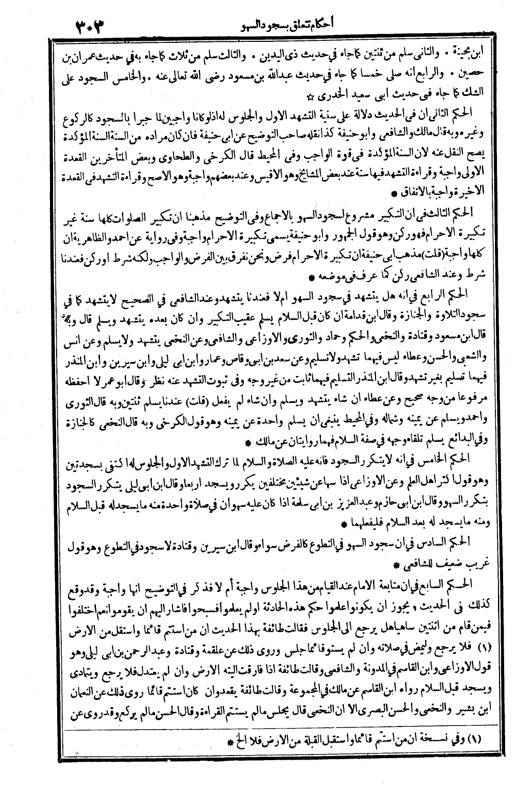 ابْن بُحَيْنَة. وَالثَّانِي سلم من ثِنْتَيْنِ كَمَا جَاءَ فِي حَدِيث ذِي الْيَدَيْنِ. وَالثَّالِث سلم من ثَلَاث كَمَا جَاءَ بِهِ فِي حَدِيث عمرَان بن حُصَيْن. وَالرَّابِع أَنه صلى خمْسا كَمَا جَاءَ فِي حَدِيث عبد الله بن مَسْعُود رَضِي الله تَعَالَى عَنهُ. وَالْخَامِس السُّجُود على الشَّك كَمَا جَاءَ فِي حَدِيث أبي سعيد الْخُدْرِيّ الحكم الثَّانِي أَن فِي الحَدِيث دلَالَة على سنية التَّشَهُّد الأول وَالْجُلُوس لَهُ إِذْ لَو كَانَا واجبين لما جبرا بِالسُّجُود كالركوع وَغَيره وَبِه قَالَ مَالك وَالشَّافِعِيّ وَأَبُو حنيفَة كَذَا نَقله صَاحب التَّوْضِيح عَن أبي حنيفَة فَإِن كَانَ مُرَاده من السّنة السّنة الْمُؤَكّدَة يَصح النَّقْل عَنهُ لِأَن السّنة الْمُؤَكّدَة فِي قُوَّة الْوَاجِب وَفِي الْمُحِيط قَالَ الْكَرْخِي والطَّحَاوِي وَبَعض الْمُتَأَخِّرين الْقعدَة الأولى وَاجِبَة وَقِرَاءَة التَّشَهُّد فِيهَا سنة عِنْد بعض الْمَشَايِخ وَهُوَ الأقيس وَعند بَعضهم وَاجِبَة وَهُوَ الْأَصَح وَقِرَاءَة التَّشَهُّد فِي الْقعدَة الْأَخِيرَة وَاجِبَة بالِاتِّفَاقِ الحكم الثَّالِث فِي أَن التَّكْبِير مَشْرُوع لسجود السَّهْو بِالْإِجْمَاع وَفِي التَّوْضِيح مَذْهَبنَا أَن تَكْبِير الصَّلَوَات كلهَا سنة غير تَكْبِيرَة الْإِحْرَام فَهُوَ ركن وَهُوَ قَول الْجُمْهُور وَأَبُو حنيفَة يُسمى تَكْبِيرَة الْإِحْرَام وَاجِبَة وَفِي رِوَايَة عَن أَحْمد والظاهرية أَن كلهَا وَاجِبَة (قلت) مَذْهَب أبي حنيفَة أَن تَكْبِيرَة الْإِحْرَام فرض وَنحن نفرق بَين الْفَرْض وَالْوَاجِب وَلكنه شَرط أَو ركن فعندنا شَرط وَعند الشَّافِعِي ركن كَمَا عرف فِي مَوْضِعه الحكم الرَّابِع فِي أَنه هَل يتَشَهَّد فِي سُجُود السَّهْو أم لَا فعندنا يتَشَهَّد وَعند الشَّافِعِي فِي الصَّحِيح لَا يتَشَهَّد كَمَا فِي سُجُود التِّلَاوَة والجنازة وَقَالَ ابْن قدامَة إِن كَانَ قبل السَّلَام يسلم عقيب التَّكْبِير وَإِن كَانَ بعده يتَشَهَّد وَيسلم قَالَ وَبِه قَالَ ابْن مَسْعُود وَقَتَادَة وَالنَّخَعِيّ وَالْحكم وَحَمَّاد وَالثَّوْري وَالْأَوْزَاعِيّ وَالشَّافِعِيّ وَعَن النَّخعِيّ يتَشَهَّد وَلَا يسلم وَعَن أنس وَالشعْبِيّ وَالْحسن وَعَطَاء لَيْسَ فيهمَا تشهد وَلَا تَسْلِيم وَعَن سعد بن أبي وَقاص وعمار وَابْن أبي ليلى وَابْن سِيرِين وَابْن الْمُنْذر فيهمَا تَسْلِيم بِغَيْر تشهد وَقَالَ ابْن الْمُنْذر التَّسْلِيم فيهمَا ثَابت من غير وَجه وَفِي ثُبُوت التَّشَهُّد عَنهُ نظر وَقَالَ أَبُو عمر لَا أحفظه مَرْفُوعا من وَجه صَحِيح وَعَن عَطاء إِن شَاءَ يتَشَهَّد وَيسلم وَإِن شَاءَ لم يفعل (قلت) عندنَا يسلم ثِنْتَيْنِ وَبِه قَالَ الثَّوْريّ وَأحمد وَيسلم عَن يَمِينه وشماله وَفِي الْمُحِيط يَنْبَغِي أَن يسلم وَاحِدَة عَن يَمِينه وَهُوَ قَول الْكَرْخِي وَبِه قَالَ النَّخعِيّ كالجنازة وَفِي الْبَدَائِع يسلم تِلْقَاء وَجهه فِي صفة السَّلَام فهما رِوَايَتَانِ عَن مَالك الحكم الْخَامِس فِي أَنه لَا يتَكَرَّر السُّجُود فَإِنَّهُ - صَلَّى اللَّهُ عَلَيْهِ وَسَلَّم َ - لما ترك التَّشَهُّد الأول وَالْجُلُوس لَهُ اكْتفى بسجدتين وَهُوَ قَول أَكثر أهل الْعلم وَعَن الْأَوْزَاعِيّ إِذا سَهَا عَن شَيْئَيْنِ مُخْتَلفين يُكَرر وَيسْجد أَرْبعا وَقَالَ ابْن أبي ليلى يتَكَرَّر السُّجُود بِتَكَرُّر السَّهْو وَقَالَ ابْن أبي حَازِم وَعبد الْعَزِيز بن أبي سَلمَة إِذا كَانَ عَلَيْهِ سهوان فِي صَلَاة وَاحِدَة مِنْهُ مَا يسْجد لَهُ قبل السَّلَام وَمِنْه مَا يسْجد لَهُ بعد السَّلَام فليفعلهما الحكم السَّادِس فِي أَن سُجُود السَّهْو فِي التَّطَوُّع كالفرض سَوَاء وَقَالَ ابْن سِيرِين وَقَتَادَة لَا سُجُود فِي التَّطَوُّع وَهُوَ قَول غَرِيب ضَعِيف للشَّافِعِيّ الحكم السَّابِع فِي 