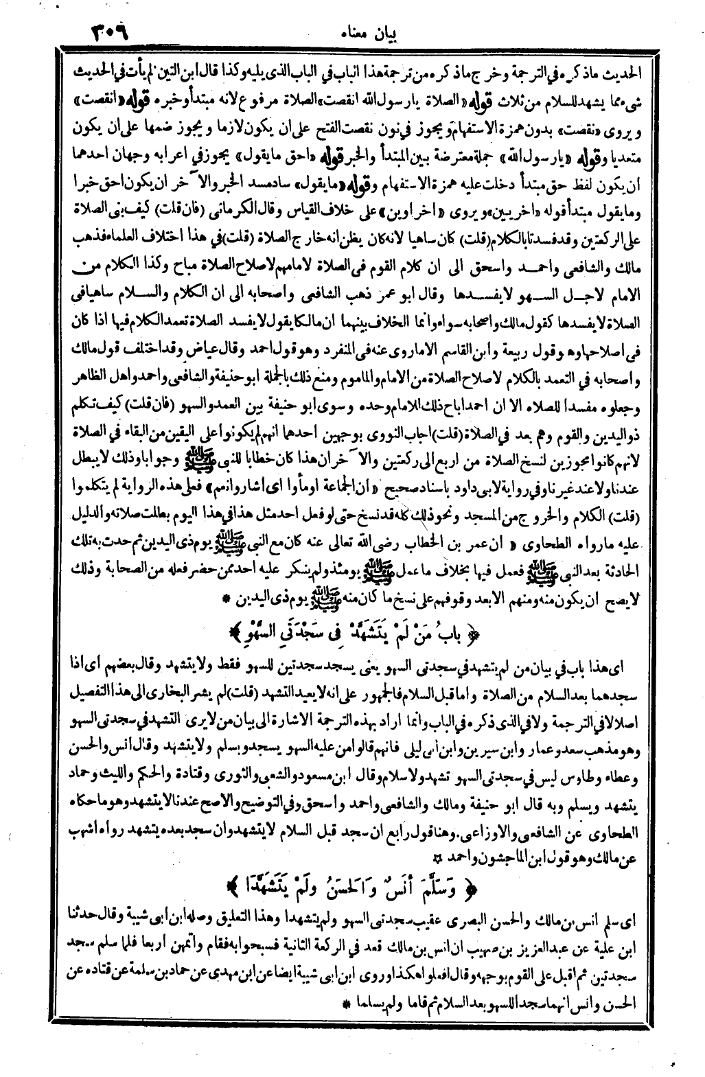 الحَدِيث مَا ذكره فِي التَّرْجَمَة وَخرج مَا ذكره من تَرْجَمَة هَذَا الْبَاب فِي الْبَاب الَّذِي يَلِيهِ وَكَذَا قَالَ ابْن التِّين لم يَأْتِ فِي الحَدِيث شَيْء مِمَّا يشْهد للسلام من ثَلَاث قَوْله " الصَّلَاة يَا رَسُول الله أنقصت " الصَّلَاة مَرْفُوع لِأَنَّهُ مُبْتَدأ وَخَبره قَوْله " أنقصت " ويروى " نقصت " بِدُونِ همزَة الِاسْتِفْهَام وَيجوز فِي نون نقصت الْفَتْح على أَن يكون لَازِما وَيجوز ضمهَا على أَن يكون مُتَعَدِّيا وَقَوله " يَا رَسُول الله " جملَة مُعْتَرضَة بَين الْمُبْتَدَأ وَالْخَبَر قَوْله " أَحَق مَا يَقُول " يجوز فِي إعرابه وَجْهَان أَحدهمَا أَن يكون لفظ حق مُبْتَدأ دخلت عَلَيْهِ همزَة الِاسْتِفْهَام وَقَوله " مَا يَقُول " سَاد مسد الْخَبَر وَالْآخر أَن يكون أَحَق خَبرا وَمَا يَقُول مُبْتَدأ قَوْله " أُخْرَيَيْنِ " ويروى " أخراوين " على خلاف الْقيَاس وَقَالَ الْكرْمَانِي (فَإِن قلت) كَيفَ بنى الصَّلَاة على الرَّكْعَتَيْنِ وَقد فسدتا بالْكلَام (قلت) كَانَ سَاهِيا لِأَنَّهُ كَانَ يظنّ أَنه خَارج الصَّلَاة (قلت) فِي هَذَا اخْتِلَاف الْعلمَاء فَذهب مَالك وَالشَّافِعِيّ وَأحمد وَإِسْحَق إِلَى أَن كَلَام الْقَوْم فِي الصَّلَاة لإمامهم لإِصْلَاح الصَّلَاة مُبَاح وَكَذَا الْكَلَام من الإِمَام لأجل السَّهْو لَا يُفْسِدهَا وَقَالَ أَبُو عمر ذهب الشَّافِعِي وَأَصْحَابه إِلَى أَن الْكَلَام وَالسَّلَام سَاهِيا فِي الصَّلَاة لَا يُفْسِدهَا كَقَوْل مَالك وَأَصْحَابه سَوَاء وَإِنَّمَا الْخلاف بَينهمَا أَن مَالِكًا يَقُول لَا يفْسد الصَّلَاة تعمد الْكَلَام فِيهَا إِذا كَانَ فِي إصلاحها وَهُوَ قَول ربيعَة وَابْن الْقَاسِم إِلَّا مَا رُوِيَ عَنهُ فِي الْمُنْفَرد وَهُوَ قَول أَحْمد وَقَالَ عِيَاض وَقد اخْتلف قَول مَالك وَأَصْحَابه فِي التعمد بالْكلَام لإِصْلَاح الصَّلَاة من الإِمَام وَالْمَأْمُوم وَمنع ذَلِك بِالْجُمْلَةِ أَبُو حنيفَة وَالشَّافِعِيّ وَأحمد وَأهل الظَّاهِر وجعلوه مُفْسِدا للصَّلَاة إِلَّا أَن أَحْمد أَبَاحَ ذَلِك للْإِمَام وَحده وَسوى أَبُو حنيفَة بَين الْعمد والسهو (فَإِن قلت) كَيفَ تكلم ذُو الْيَدَيْنِ وَالْقَوْم وهم بعد فِي الصَّلَاة (قلت) أجَاب النَّوَوِيّ بِوَجْهَيْنِ أَحدهمَا أَنهم لم يَكُونُوا على الْيَقِين من الْبَقَاء فِي الصَّلَاة لأَنهم كَانُوا مجوزين لنسخ الصَّلَاة من أَربع إِلَى رَكْعَتَيْنِ وَالْآخر أَن هَذَا كَانَ خطابا للنَّبِي - صَلَّى اللَّهُ عَلَيْهِ وَسَلَّم َ - وجوابا وَذَلِكَ لَا يبطل عندنَا وَلَا عِنْد غَيرنَا وَفِي رِوَايَة لأبي دَاوُد بِإِسْنَاد صَحِيح " أَن الْجَمَاعَة أومأوا أَي أشاروا نعم " فعلى هَذِه الرِّوَايَة لم يتكلموا (قلت) الْكَلَام وَالْخُرُوج من الْمَسْجِد وَنَحْو ذَلِك كُله قد نسخ حَتَّى لَو فعل أحد مثل هَذَا فِي هَذَا الْيَوْم بطلت صلَاته وَالدَّلِيل عَلَيْهِ مَا رَوَاهُ الطَّحَاوِيّ " أَن عمر بن الْخطاب رَضِي الله تَعَالَى عَنهُ كَانَ مَعَ النَّبِي - صَلَّى اللَّهُ عَلَيْهِ وَسَلَّم َ - يَوْم ذِي الْيَدَيْنِ ثمَّ حدث بِهِ تِلْكَ الْحَادِثَة بعد النَّبِي - صَلَّى اللَّهُ عَلَيْهِ وَسَلَّم َ - فَعمل فِيهَا بِخِلَاف مَا عمل - صَلَّى اللَّهُ عَلَيْهِ وَسَلَّم َ - يَوْمئِذٍ وَلم يُنكر عَلَيْهِ أحد مِمَّن حضر فعله من الصَّحَابَة وَذَلِكَ لَا يَصح أَن يكون مِنْهُ وَمِنْهُم إِلَّا بعد وقوفهم على نسخ مَا كَانَ مِنْهُ - صَلَّى اللَّهُ عَلَيْهِ وَسَلَّم َ - يَوْم ذِي الْيَدَيْنِ