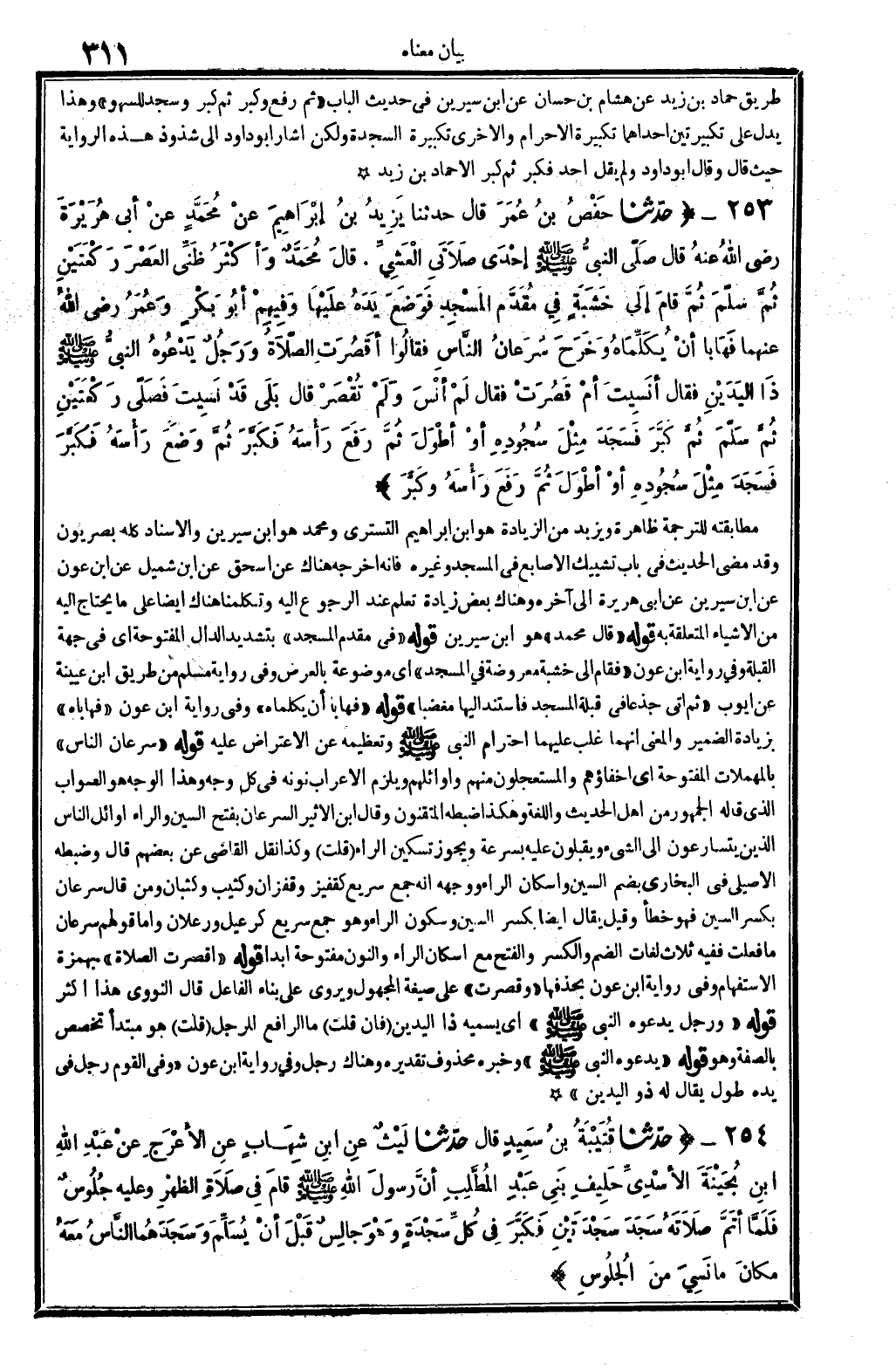 253 - (حَدثنَا حَفْص بن عمر قَالَ حَدثنَا يزِيد بن إِبْرَاهِيم عَن مُحَمَّد عَن أبي هُرَيْرَة رَضِي الله عَنهُ قَالَ صلى النَّبِي - صَلَّى اللَّهُ عَلَيْهِ وَسَلَّم َ - إِحْدَى صَلَاتي الْعشي. قَالَ مُحَمَّد وَأكْثر ظَنِّي الْعَصْر رَكْعَتَيْنِ ثمَّ سلم ثمَّ قَامَ إِلَى خَشَبَة فِي مقدم الْمَسْجِد فَوضع يَده عَلَيْهَا وَفِيهِمْ أَبُو بكر وَعمر رَضِي الله عَنْهُمَا فَهَابَا أَن يُكَلِّمَاهُ وَخرج سرعَان النَّاس فَقَالُوا أقصرت الصَّلَاة وَرجل يَدعُوهُ النَّبِي - صَلَّى اللَّهُ عَلَيْهِ وَسَلَّم َ - ذَا الْيَدَيْنِ فَقَالَ أنسيت أم قصرت فَقَالَ لم أنس وَلم تقصر قَالَ بلَى قد نسيت فصلى رَكْعَتَيْنِ ثمَّ سلم ثمَّ كبر فَسجدَ مثل سُجُوده أَو أطول ثمَّ رفع رَأسه فَكبر ثمَّ وضع رَأسه فَكبر فَسجدَ مثل سُجُوده أَو أطول ثمَّ رفع رَأسه وَكبر) مطابقته للتَّرْجَمَة ظَاهِرَة وَيزِيد من الزِّيَادَة هُوَ ابْن إِبْرَاهِيم التسترِي وَمُحَمّد هُوَ ابْن سِيرِين والإسناد كُله بصريون وَقد مضى الحَدِيث فِي بَاب تشييك الْأَصَابِع فِي الْمَسْجِد وَغَيره فَإِنَّهُ أخرجه هُنَاكَ عَن إِسْحَق عَن ابْن شُمَيْل عَن ابْن عون عَن ابْن سِيرِين عَن أبي هُرَيْرَة إِلَى آخِره وَهُنَاكَ بعض زِيَادَة تعلم عِنْد الرُّجُوع إِلَيْهِ وتكلمنا هُنَاكَ أَيْضا على مَا يحْتَاج إِلَيْهِ من الْأَشْيَاء الْمُتَعَلّقَة بِهِ قَوْله " قَالَ مُحَمَّد " هُوَ ابْن سِيرِين قَوْله " فِي مقدم الْمَسْجِد " بتَشْديد الدَّال الْمَفْتُوحَة أَي فِي جِهَة الْقبْلَة وَفِي رِوَايَة ابْن عون " فَقَامَ إِلَى خَشَبَة معروضة فِي الْمَسْجِد " أَي مَوْضُوعَة بِالْعرضِ وَفِي رِوَايَة مُسلم من طَرِيق ابْن عُيَيْنَة عَن أَيُّوب " ثمَّ أَتَى جذعا فِي قبْلَة الْمَسْجِد فاستند إِلَيْهَا مغضبا " قَوْله " فَهَابَا أَن يُكَلِّمَاهُ " وَفِي رِوَايَة ابْن عون " فهاباه " بِزِيَادَة الضَّمِير وَالْمعْنَى أَنَّهُمَا غلب عَلَيْهِمَا احترام النَّبِي - صَلَّى اللَّهُ عَلَيْهِ وَسَلَّم َ - وتعظيمه عَن الِاعْتِرَاض عَلَيْهِ قَوْله " سرعَان النَّاس " بالمهملات الْمَفْتُوحَة أَي أخفاؤهم والمستعجلون مِنْهُم وأوائلهم وَيلْزم الْإِعْرَاب نونه فِي كل وَجه وَهَذَا الْوَجْه هُوَ الصَّوَاب الَّذِي قَالَه الْجُمْهُور من أهل الحَدِيث واللغة وَهَكَذَا ضَبطه المتقنون وَقَالَ ابْن الْأَثِير السرعان بِفَتْح السِّين وَالرَّاء أَوَائِل النَّاس الَّذين يتسارعون إِلَى الشَّيْء ويقبلون عَلَيْهِ بِسُرْعَة وَيجوز تسكين الرَّاء (قلت) وَكَذَا نقل القَاضِي عَن بَعضهم قَالَ وَضَبطه الْأصيلِيّ فِي البُخَارِيّ بِضَم السِّين وَإِسْكَان الرَّاء وَوَجهه أَنه جمع سريع كقفيز وقفزان وكثيب وكثبان وَمن قَالَ سرعَان بِكَسْر السِّين فَهُوَ خطأ وَقيل يُقَال أَيْضا بِكَسْر السِّين وَسُكُون الرَّاء وَهُوَ جمع سريع كرعيل ورعلان وَأما قَوْلهم سرعَان مَا فعلت فَفِيهِ ثَلَاث لُغَات الضَّم وَالْكَسْر وَالْفَتْح مَعَ إسكان الرَّاء وَالنُّون مَفْتُوحَة أبدا قَوْله " أقصرت الصَّلَاة " بِهَمْزَة الِاسْتِفْهَام وَفِي رِوَايَة ابْن عون بحذفها " وَقصرت " على صِيغَة الْمَجْهُول ويروى على بِنَاء الْفَاعِل قَالَ النَّوَوِيّ هَذَا أَكثر قَوْله " وَرجل يَدعُوهُ النَّبِي - صَلَّى اللَّهُ عَلَيْهِ وَسَلَّم َ - " أَي يُسَمِّيه ذَا الْيَدَيْنِ (فَإِن قلت) مَا الرافع للرجل (قلت) هُوَ مُبْتَدأ تخصص بِالصّفةِ وَهُوَ قَوْله " يَدعُوهُ النَّبِي - صَلَّى اللَّهُ عَلَيْهِ وَسَلَّم َ - " وَخَبره مَحْذُوف تَقْدِيره وَهُنَاكَ رجل وَفِي رِوَايَة ابْن عون " وَفِي الْقَوْم رجل فِي يَده طول يُقَال لَهُ ذُو الْيَدَيْنِ "