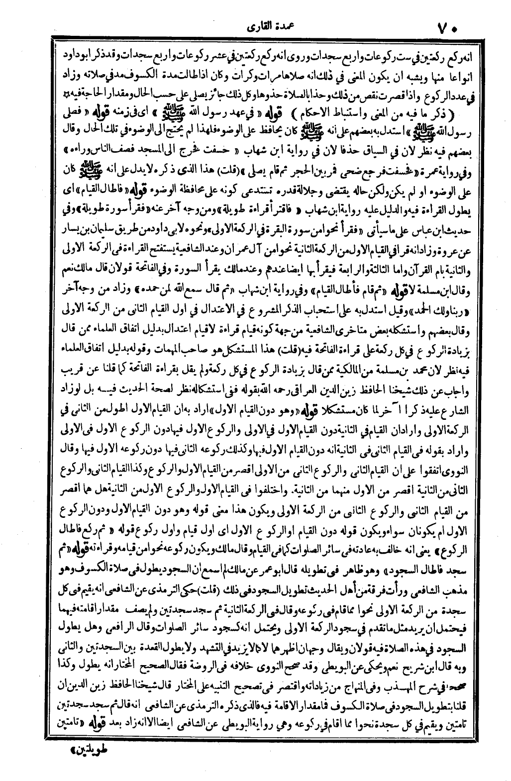 ذكر مَا فِيهِ من الْمَعْنى واستنباط الْأَحْكَام: قَوْله: (فِي عهد رَسُول الله صلى الله عَلَيْهِ وَسلم) أَي: فِي زَمَنه. قَوْله: (فصلى رَسُول الله صلى الله عَلَيْهِ وَسلم) اسْتدلَّ بِهِ بَعضهم على أَنه صلى الله عَلَيْهِ وَسلم كَانَ يحافظ على الْوضُوء، فَلهَذَا لم يحْتَج إِلَى الْوضُوء فِي تِلْكَ الْحَال. وَقَالَ بَعضهم: فِيهِ نظر لِأَن السِّيَاق حذفا لِأَن فِي رِوَايَة ابْن شهَاب (خسفت فَخرج إِلَى الْمَسْجِد فَصف النَّاس وَرَاءه) . وَفِي رِوَايَة عمْرَة: (فخسفت فَرجع ضحى فَمر بَين الْحجر ثمَّ قَامَ يُصَلِّي) . قلت: هَذَا الَّذِي ذكره لَا يدل على أَنه صلى الله عَلَيْهِ وَسلم كَانَ على الْوضُوء أَو لم يكن، وَلَكِن حَاله يَقْتَضِي وجلالة قدره تستدعي كَونه على مُحَافظَة الْوضُوء. قَوْله: (فَأطَال الْقيام) أَي: يطول الْقِرَاءَة فِيهِ، وَالدَّلِيل عَلَيْهِ رِوَايَة ابْن شهَاب: (فاقترأ قِرَاءَة طَوِيلَة) ، وَمن وَجه آخر عَنهُ: (فَقَرَأَ سُورَة طَوِيلَة) ، وَفِي حَدِيث ابْن عَبَّاس على مَا سَيَأْتِي: (فَقَرَأَ نَحوا من سُورَة الْبَقَرَة فِي الرَّكْعَة الأولى) ، وَنَحْوه لأبي دَاوُد من طَرِيق سُلَيْمَان بن يسَار عَن عُرْوَة، وَزَاد أَنه قَرَأَ فِي الْقيام الأول من الرَّكْعَة الثَّانِيَة نَحوا من آل عمرَان، وَعند الشَّافِعِيَّة يستفتح الْقِرَاءَة فِي الرَّكْعَة الأولى وَالثَّانيَِة بِأم الْقُرْآن، وَأما الثَّالِثَة وَالرَّابِعَة فَيقْرَأ بهَا أَيْضا عِنْدهم، وَعند مَالك يقْرَأ السُّورَة، وَفِي الْفَاتِحَة قَولَانِ: قَالَ مَالك: نعم، وَقَالَ ابْن مسلمة: لَا. قَوْله: (ثمَّ قَامَ فَأطَال الْقيام) وَفِي رِوَايَة ابْن شهَاب: (ثمَّ قَالَ: سمع الله لمن حَمده) ، وَزَاد من وَجه آخر: (رَبنَا وَلَك الْحَمد) ، وَقيل: اسْتدلَّ بِهِ على اسْتِحْبَاب الذّكر الْمَشْرُوع فِي الِاعْتِدَال فِي أول الْقيام الثَّانِي من الرَّكْعَة الأولى وَقَالَ بَعضهم: وَاسْتَشْكَلَهُ بعض متأخري الشَّافِعِيَّة من جِهَة كَونه قيام قِرَاءَة لَا قيام اعْتِدَال، بِدَلِيل اتِّفَاق الْعلمَاء مِمَّن قَالَ بِزِيَادَة الرُّكُوع فِي كل رَكْعَة على قِرَاءَة الْفَاتِحَة فِيهِ. قلت: هَذَا المستشكل هُوَ صَاحب الْمُهِمَّات، وَقَوله بِدَلِيل اتِّفَاق الْعلمَاء فِيهِ نظر، لِأَن مُحَمَّد بن مسلمة من الْمَالِكِيَّة مِمَّن قَالَ بِزِيَادَة الرُّكُوع فِي كل رَكْعَة، وَلم يقل بِقِرَاءَة الْفَاتِحَة كَمَا قُلْنَا عَن قريب. وَأجَاب عَن ذَلِك شَيخنَا الْحَافِظ زين الدّين الْعِرَاقِيّ، رَحمَه الله بقوله: فَفِي استشكاله نظر لصِحَّة الحَدِيث فِيهِ، بل لَو زَاد الشَّارِع عَلَيْهِ ذكرا آخر لما كَانَ مستشكلاً. قَوْله: (وَهُوَ دون الْقيام الأول) أَرَادَ بِهِ أَن الْقيام الأول أطول من الثَّانِي فِي الرَّكْعَة الأولى، وَأَرَادَ أَن الْقيام فِي الثَّانِيَة دون الْقيام الأول فِي الأولى، وَالرُّكُوع الأول فِيهَا دون الرُّكُوع الأول فِي الأولى. وَأَرَادَ بقوله: فِي الْقيام الثَّانِي فِي الثَّانِيَة أَنه دون الْقيام الأول فِيهَا، وَكَذَلِكَ رُكُوعه الثَّانِي فِيهَا دون رُكُوعه الأول فِيهَا. وَقَالَ النَّوَوِيّ: اتَّفقُوا على أَن الْقيام الثَّانِي وَالرُّكُوع الثَّانِي من الأولى أقصر من الْقيام الأول وَالرُّكُوع، وَكَذَا الْقيام الثَّانِي وَالرُّكُوع الثَّانِي من الثَّانِيَة أقصر من الأول مِنْهُمَا من الثَّانِيَة. وَاخْتلفُوا فِي الْقيام الأول وَالرُّكُوع الأول من الثَّانِيَة، هَل هما أقصر من الْقيام الثَّانِي وَالرُّكُوع الثَّانِي من الرَّكْعَة الأولى؟ وَيكون هَذَا معنى قَوْله: وَهُوَ دون الْقيام الأول، وَدون الرُّكُوع الأول، أم يكونَانِ سَوَاء وَيكون قَوْله: دون الْقيام أَو الرُّكُوع الأول أَي أول قيام وَأول رُكُوع؟ قَوْله: (ثمَّ ركع فَأطَال الرُّكُوع) يَعْنِي أَنه خَالف بِهِ عَادَته فِي سَائِر 