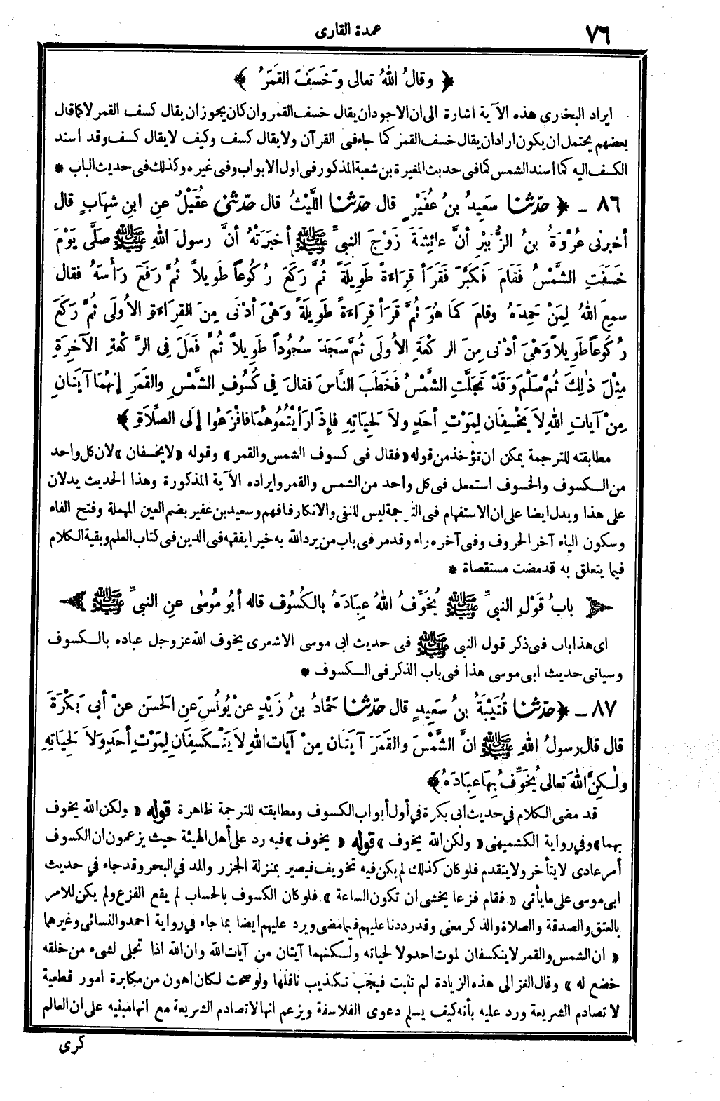7401 - حدَّثنا سَعِيدُ بنُ عُفَيْرٍ قَالَ حدَّثنا اللَّيْثُ قَالَ حدَّثني عُقَيْلٌ عنِ ابنِ شِهَابٍ قَالَ أَخْبرنِي عُرْوَةُ بنُ الزُّبَيْرُ أنَّ عائِشَةَ زَوْجَ النبيِّ صلى الله عَلَيْهِ وَسلم أخبرَتْهُ أنَّ رسولَ الله صلى الله عَلَيْهِ وَسلم صَلَّى يَوْمَ خَسَفَتِ الشَّمْسُ فقَامَ فكَبَّرَ فقَرَأ قرَاءَةً طوِيلَةً ثُمَّ رَكَعَ رُكُوعا طَويلاً ثُمَّ رَفَعَ رَأسَهُ فَقَالَ سَمِعَ الله لِمَنْ حَمِدَهُ وقامَ كَمَا هُوَ ثُمَّ قَرَأَ قِرَاءَةً طَوِيلَةً وَهْيَ أدْنَى مِنَ القِرَاءَةِ الأُولَى ثُمَّ رَكَعَ رُكُوعا طَوِيلاً وَهْيَ أدْنَى مِنَ الركْعَةِ الأُولى ثُمَّ سَجَدَ سُجُودا طَوِيلاً ثُمَّ فَعَلَ فِي الرَّكْعَةِ الآخِرَةِ مِثْلَ ذالِكَ ثُمَّ سَلَّمَ وقَدْ تَجَلَّتِ الشَّمْسُ فَخَطَبَ النَّاسَ فقالَ فِي كُسُوفِ الشَّمْسِ والقَمَرِ إنَّهُمَا آيَتانِ مِنْ آياتِ الله لاَ يَخْسِفَانِ لِمَوْتِ أحَدٍ ولاَ لِحَيَاتِهِ فإذَا رَأيْتُمُوهُمَا فافْزَعُوا إِلَى الصَّلاَةِ..