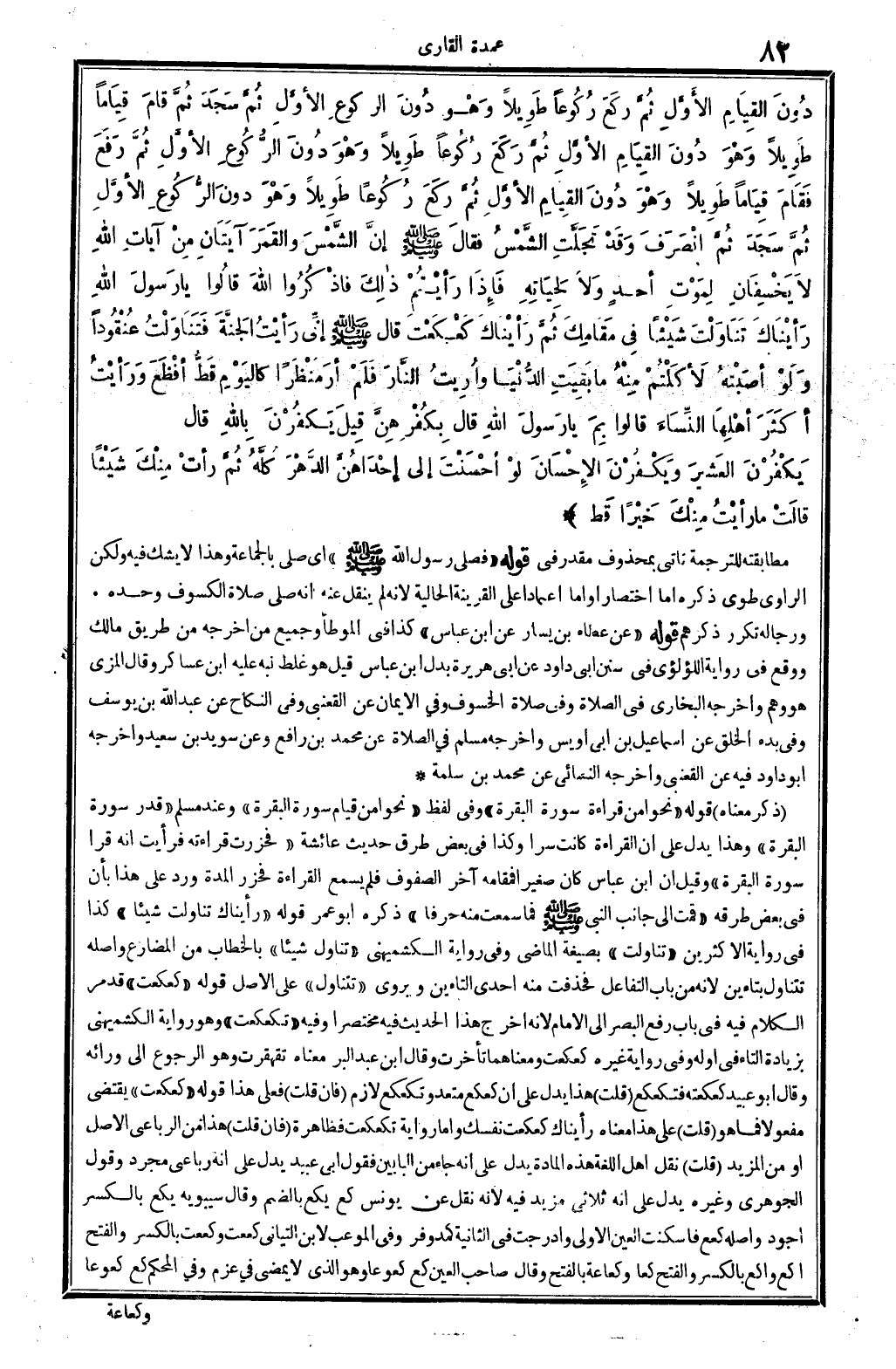 دُونَ القِيَامِ الأوَّلِ ثُمَّ رَكَعَ رُكُوعا طَوِيلا وهْوَ دُونَ الرُّكُوعِ الأوَّلِ ثُمَّ سَجَدَ ثُمَّ قامَ قِيَاما طَوِيلاً وَهْوَ دُونَ القِيَامِ الأوَّلِ ثُمَّ رَكَعَ رُكُوعا طَوِيلاً وَهْوَ دُونَ الرُّكُوعِ الأوَّلِ ثُمَّ رَفَعَ فَقَامَ قِياما طَوِيلاً وَهْوَ دُونَ القِيامِ الأوَّلِ ثُمَّ ركعَ رُكُوعا طَوِيلاً وَهْوَ دُونَ الرُّكُوعِ الأوَّلِ ثُمَّ سَجَدَ ثُمَّ انْصَرَفَ وقَدْ تَجَلَّتِ الشَّمْسُ فقالَ صلى الله عَلَيْهِ وَسلم إنَّ الشَّمْسَ والقَمَرَ آيَتَانِ مِنْ آيَاتِ الله لاَ يَخْسِفَانِ لِمَوْتِ أحَدٍ وَلاَ لِحَيَاتِهِ فَإذَا رَأيْتُمْ ذالِكَ فاذْكُرُوا الله قالُوا يَا رسولَ الله رَأيْنَاكَ تَنَاوَلْتَ شَيْئا فِي مَقامِكَ ثُمَّ رَأيْنَاكَ كَعْكَعْتَ قَالَ صلى الله عَلَيْهِ وَسلم إنِّي رَأيْتُ الجَنَّةَ فَتَنَاوَلْتُ عُنْقُودا وَلَوْ أصَبْتهُ لأَكَلْتُمْ مِنْهُ مَا بَقِيَتِ الدُّنْيَا وأُرِيتُ النَّارَ فَلَمْ أرَ مَنْظَرا كاليَوْمِ قَطُّ أفْظَعَ وَرَأيْتُ أكثَرَ أهْلِهَا النِّسَاءَ قَالُوا بِمَ يَا رسولَ الله قَالَ بِكُفْرِهِنَّ قِيلَ يَكْفُرْنَ بِالله قَالَ يَكْفُرْنَ العَشِيرَ ويَكْفُرْنَ الإحْسَانَ لوْ أحْسَنْتَ إلَى إحْدَاهُنَّ الدَّهْرَ كُلَّهُ ثُمَّ رَأتْ مِنْكَ شَيْئا قالَتْ مَا رأيْتُ مِنْكَ خَيْرا قَط..